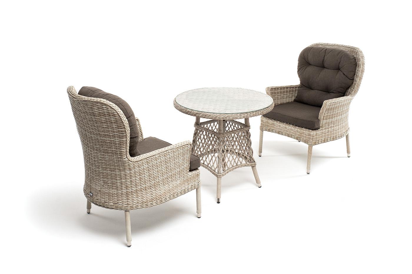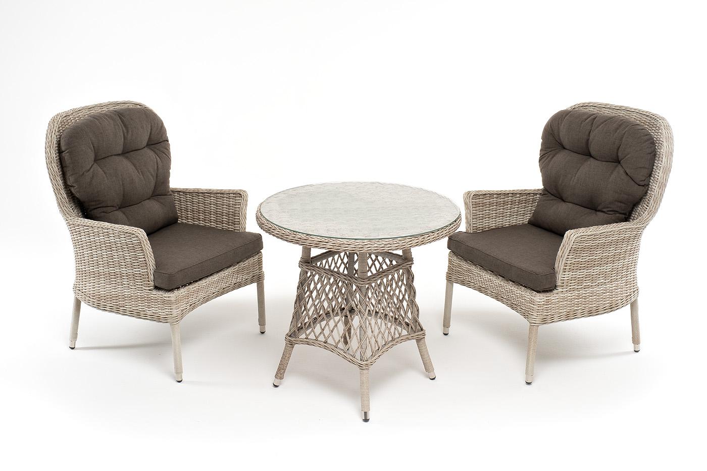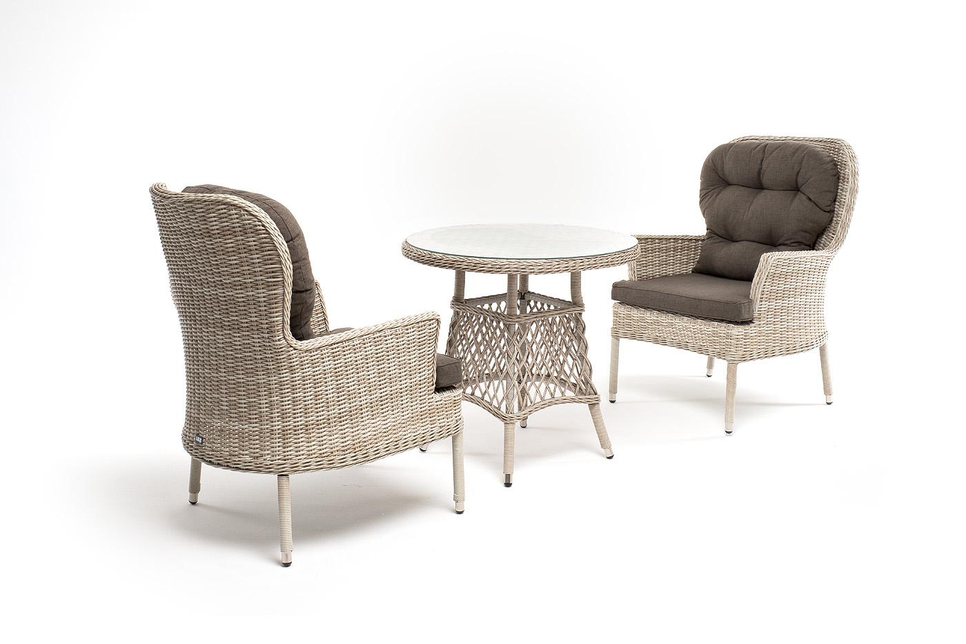 Кофейный комплект «Алиса» рассчитан на 2 персоны и подходит для расположения на балконе, в небольших гостиных, на террасе и других местах с ограниченным пространством. В основе каркас из алюминия. В состав входят: – круглый стол 800×800×750 мм (толщина стеклянной столешницы в 0,5 см). – 2 кресла - 710×820×1105 мм. Плетение выполнено вручную круглым искусственным ротангом бежевого цвета, кресло укомплектовано подушками из 100% полиэстера, которые пропитаны специальным составом, обладающим влаго "Эспрессо" плетеный круглый стол, диаметр 80 см, цвет бежевый 1шт. 800Х800Х750, "Алиса" кресло плетеное, цвет бежевый с подушками 2шт. 710Х820Х1 105,
