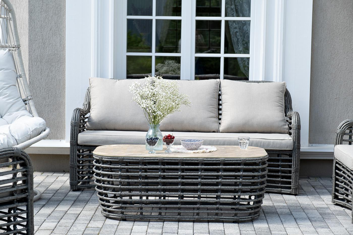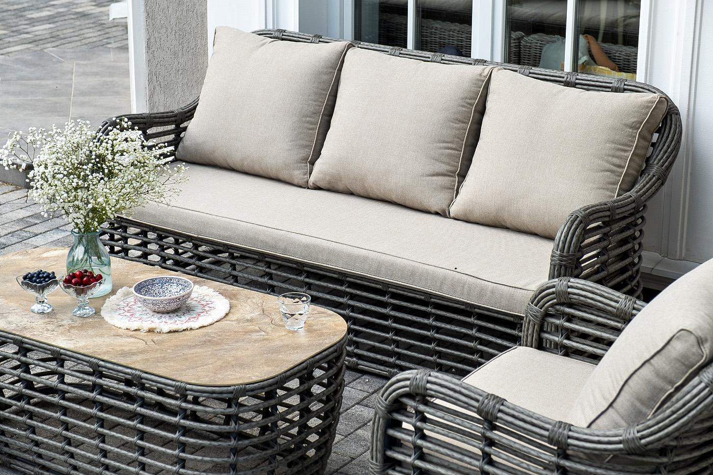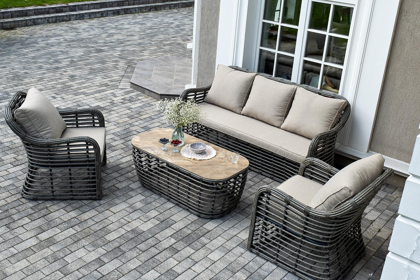 Вместительная лаунж-зона «Ницца» состоит из: - трехместного дивана – 1810×850×870 мм. - двух кресел – 77×850×870 мм. - журнального столика – 1200×600×450 мм. Модели имеют алюминиевый каркас, который оплетен вручную искусственным ротангом серого цвета. Плетеная мебель дополнена удобными подушками в бежевых чехлах. При их изготовлении используют полиэстер, плотность – 300гр/м2. Он обрабатывается влагоотталкивающей пропиткой для повышения защитных свойств материала. Журнальный столик выполнен из "Ницца" диван из искусственного ротанга трехместный, цвет серый 1шт. 1 810Х850Х870, "Ницца" кресло из искусственного ротанга, цвет серый 2шт. 770Х850Х870, "Ницца" журнальный столик из искусственного ротанга, цвет серый 1шт. 1 200Х600Х450,