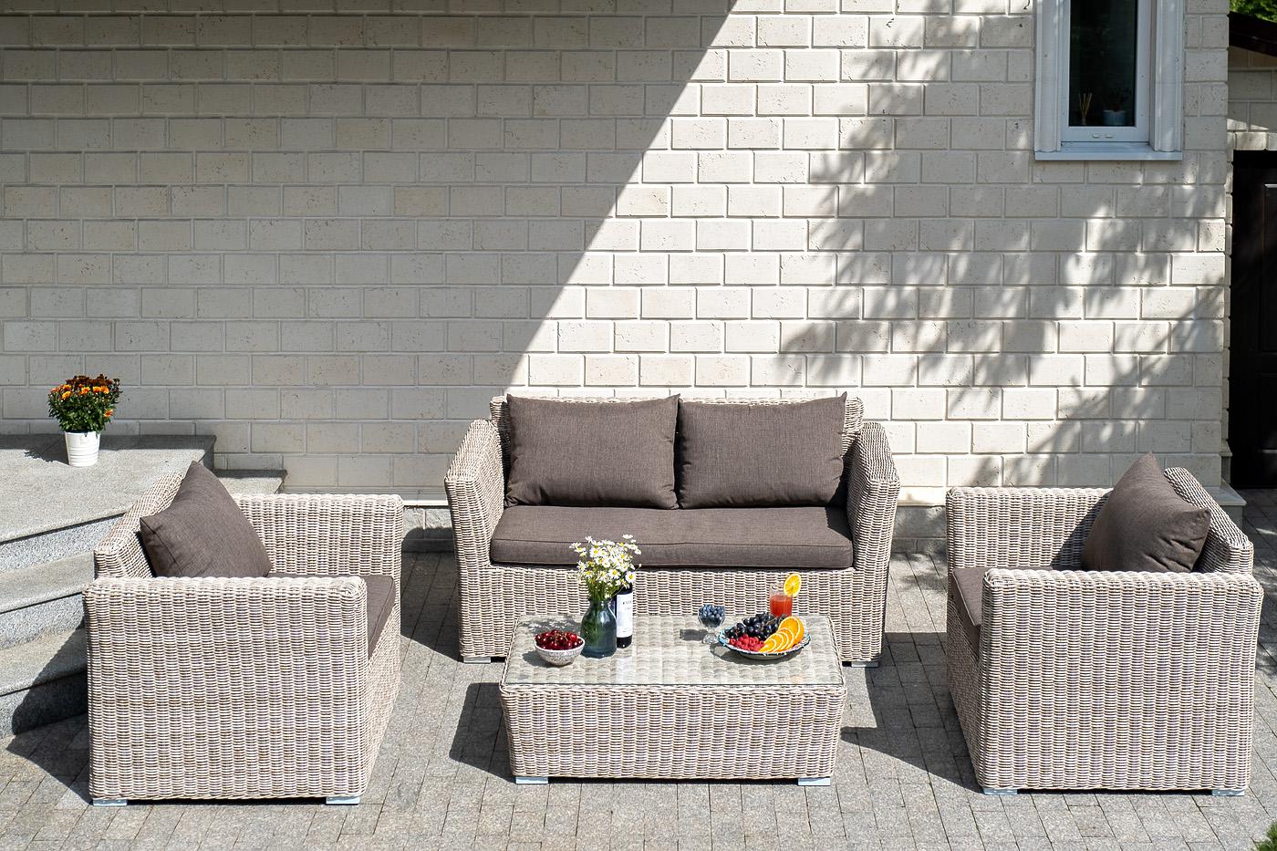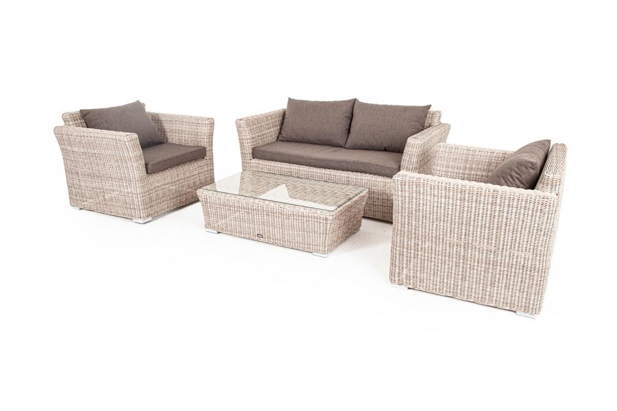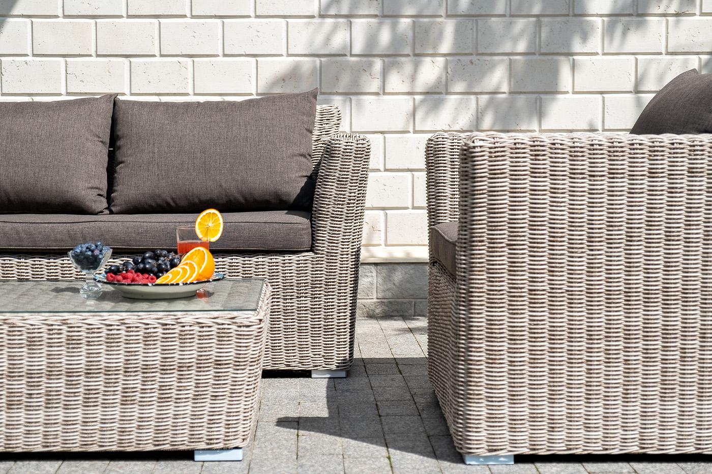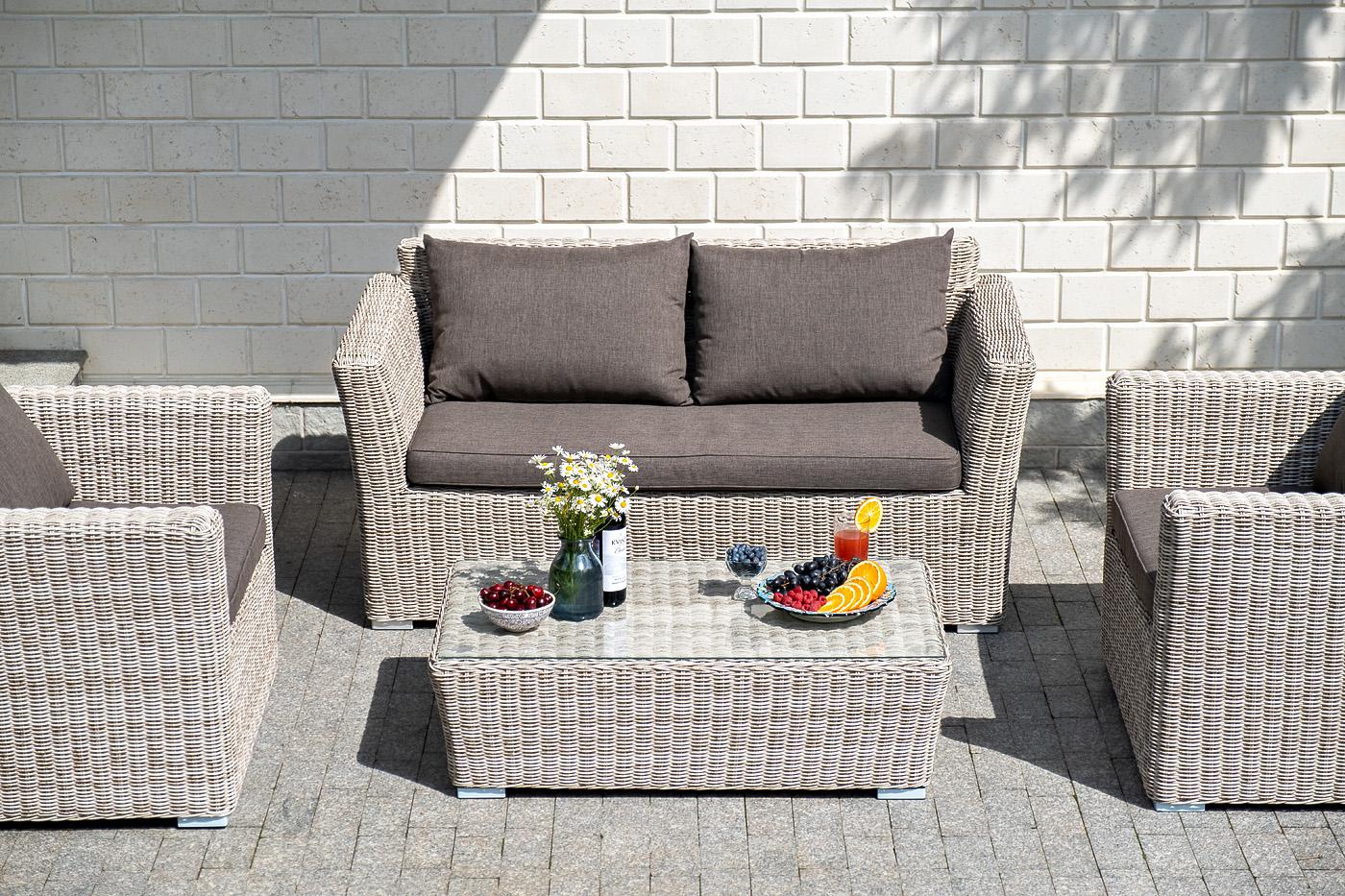 Лаунж-зона «Капучино Сингл» на 4 персоны. Она включает в свой состав: - двухместный диван (размер – 1700×865×815 мм). - два кресла (размер – 1040×865×815 мм). - плетеный журнальный столик (размер – 1100×660×340 мм). Прочный алюминиевый каркас усиливает устойчивость мебели. Его дополняет бежевая оплетка, которая представлена из круглого искусственного ротанга. Более комфортной лаунж-зону делают мягкие подушки с чехлами из серого полиэстера. Его плотность находится в рамках 300гр/м2. Ткань предв "Капучино" диван из искусственного ротанга двухместный, цвет бежевый 1шт. 1 700Х865Х815, "Капучино" кресло из искусственного ротанга, цвет бежевый 2шт. 1 040Х865Х815, "Капучино" журнальный столик из искусственного ротанга, цвет бежевый 1шт. 1 100Х660Х340,