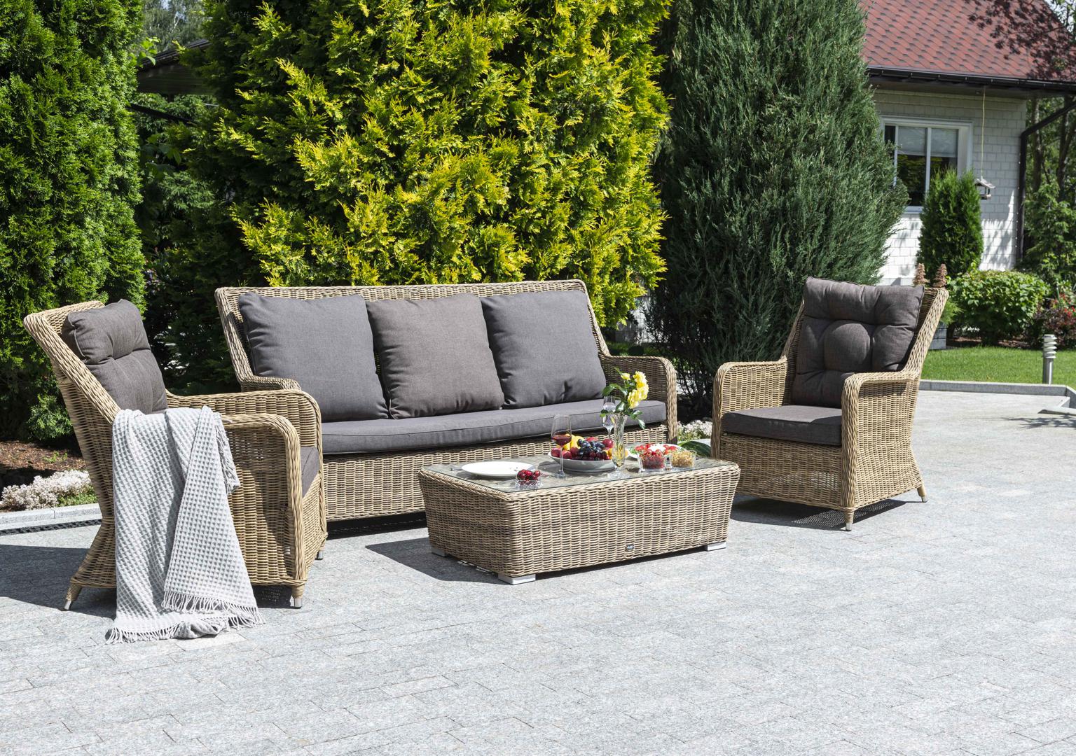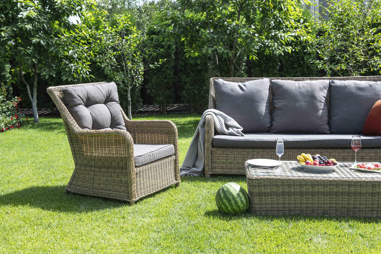 Вместительная лаунж-зона «Гляссе» состоит из: - трехместного дивана – 1900×880×990 мм. - двух кресел – 730×880×990 мм. - журнального столика – 1100×660×340 мм. Модели имеют алюминиевый каркас, который оплетен вручную искусственным ротангом натурального соломенного цвета. Плетеная мебель дополнена удобными подушками в серых чехлах. При их изготовлении используют полиэстер, плотность – 300гр/м2. Он обрабатывается влагоотталкивающей пропиткой для повышения защитных свойств материала. Жу "Гляссе" диван трехместный из искусственного ротанга, цвет соломенный 1шт. 1 900Х880Х990, "Гляссе" кресло плетеное из искусственного ротанга, цвет соломенный 2шт. 730Х880Х990, "Капучино" журнальный столик из искусственного ротанга, цвет соломенный 1шт. 1 100Х660Х340,