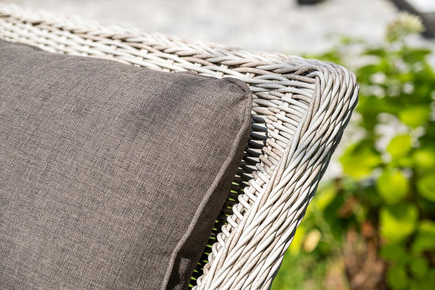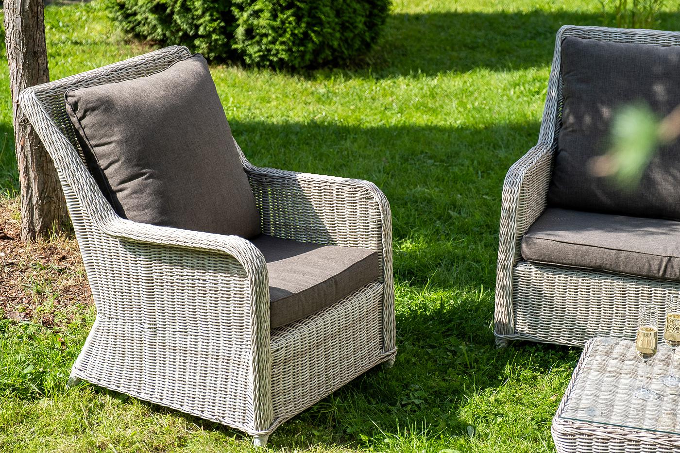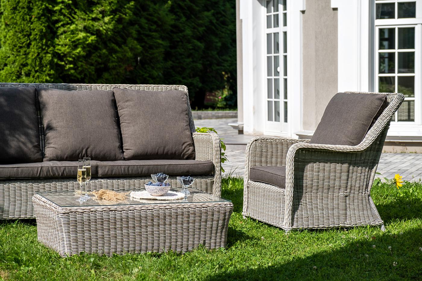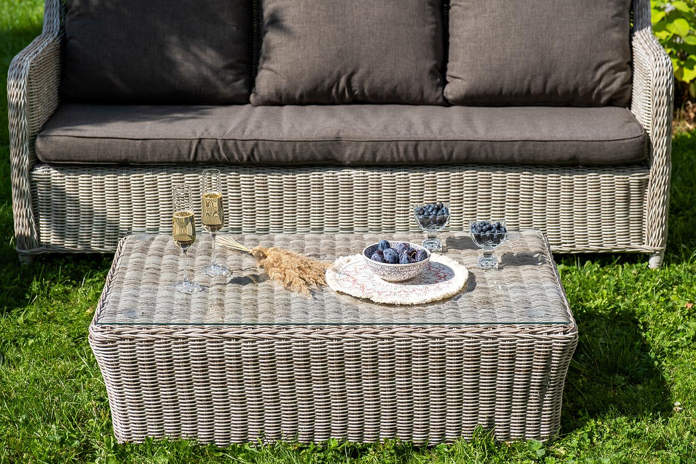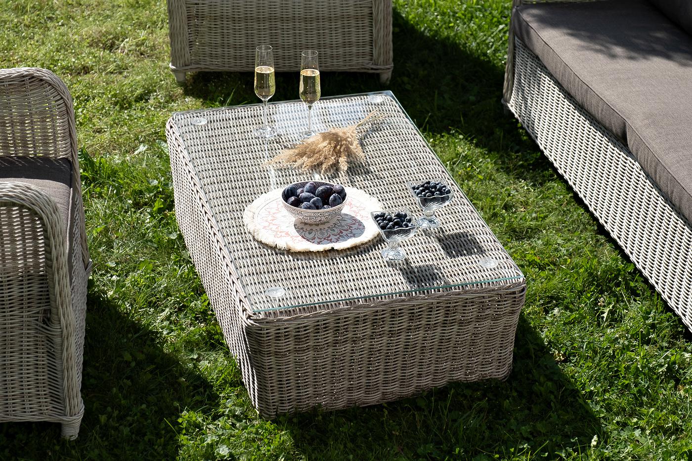 Вместительная лаунж-зона «Гляссе» состоит из: - трехместного дивана – 1900×880×990 мм. - двух кресел – 730×880×990 мм. - журнального столика – 1100×660×340 мм. Модели имеют алюминиевый каркас, который оплетен вручную искусственным ротангом бежевого цвета. Плетеная мебель дополнена удобными подушками в серых чехлах. При их изготовлении используют полиэстер, плотность – 300гр/м2. Он обрабатывается влагоотталкивающей пропиткой для повышения защитных свойств материала. Журнальный столик оснащен с "Гляссе" диван трехместный из искусственного ротанга, цвет бежевый 1шт. 1 900Х880Х990, "Гляссе" кресло плетеное из искусственного ротанга, цвет бежевый 2шт. 730Х880Х990, "Капучино" журнальный столик из искусственного ротанга, цвет бежевый 1шт. 1 100Х660Х340,
