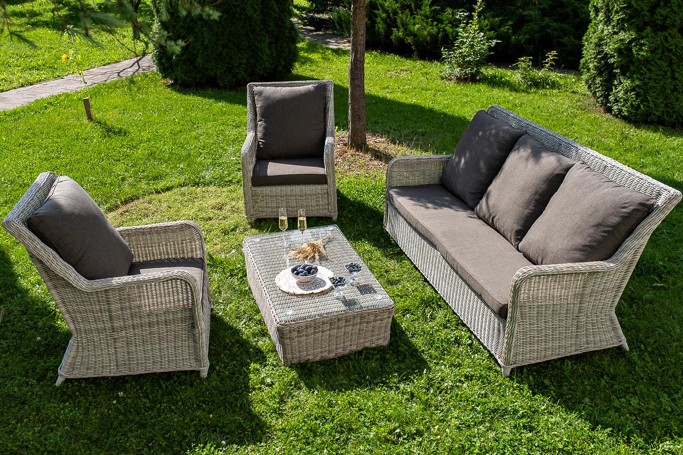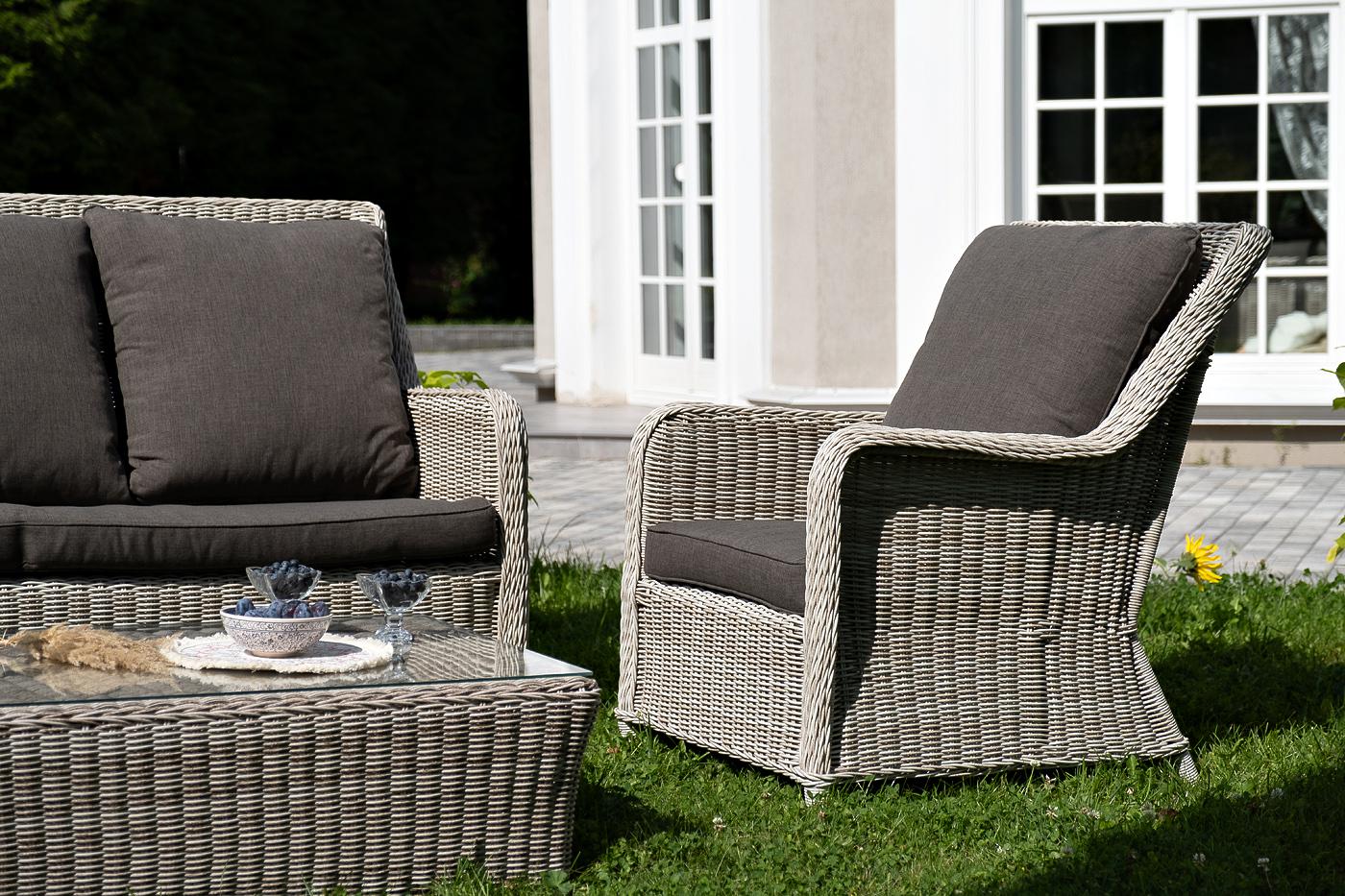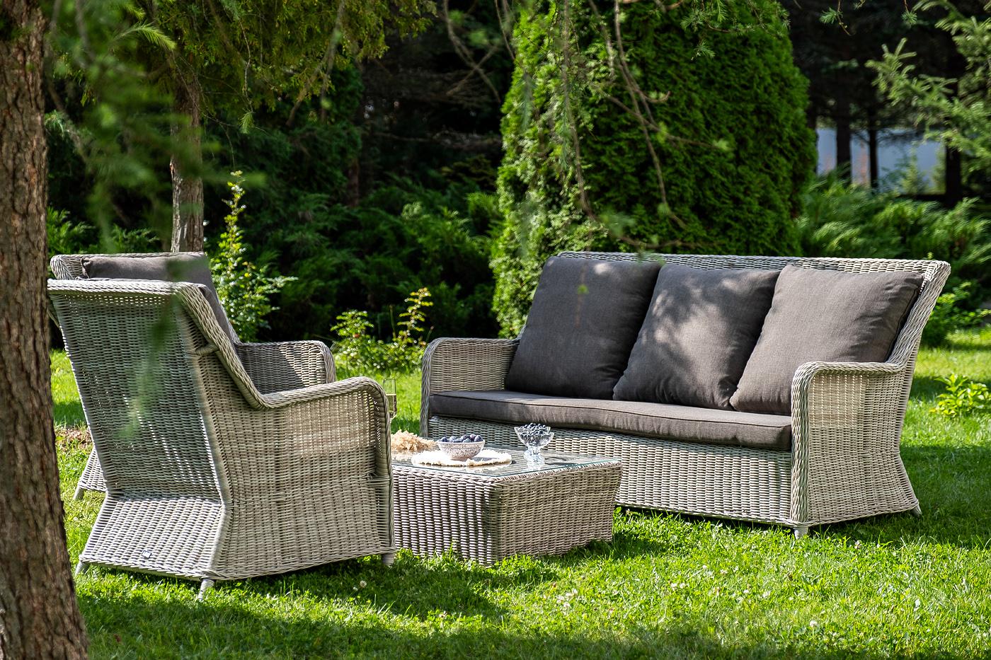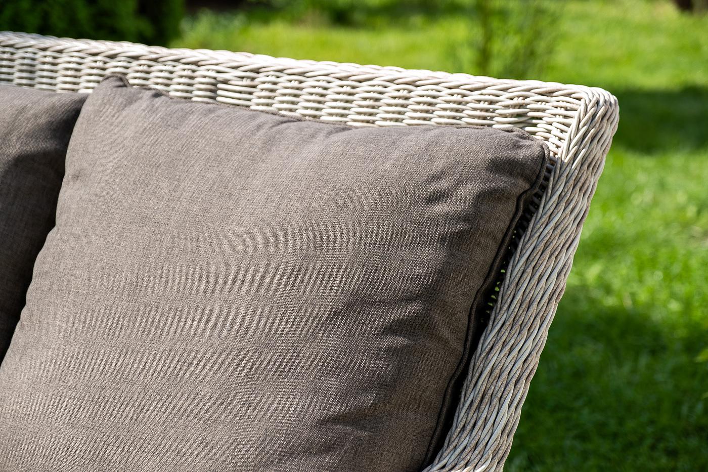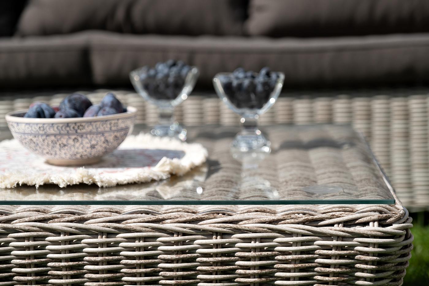 Вместительная лаунж-зона «Гляссе» состоит из: - трехместного дивана – 1900×880×990 мм. - двух кресел – 730×880×990 мм. - журнального столика – 1100×660×340 мм. Модели имеют алюминиевый каркас, который оплетен вручную искусственным ротангом бежевого цвета. Плетеная мебель дополнена удобными подушками в серых чехлах. При их изготовлении используют полиэстер, плотность – 300гр/м2. Он обрабатывается влагоотталкивающей пропиткой для повышения защитных свойств материала. Журнальный столик оснащен с "Гляссе" диван трехместный из искусственного ротанга, цвет бежевый 1шт. 1 900Х880Х990, "Гляссе" кресло плетеное из искусственного ротанга, цвет бежевый 2шт. 730Х880Х990, "Капучино" журнальный столик из искусственного ротанга, цвет бежевый 1шт. 1 100Х660Х340,
