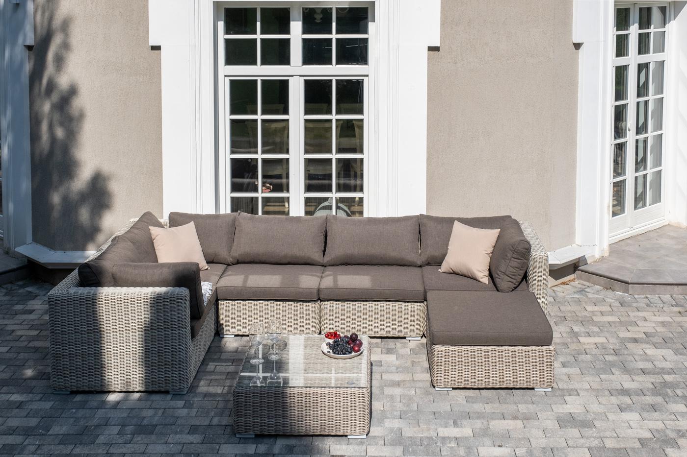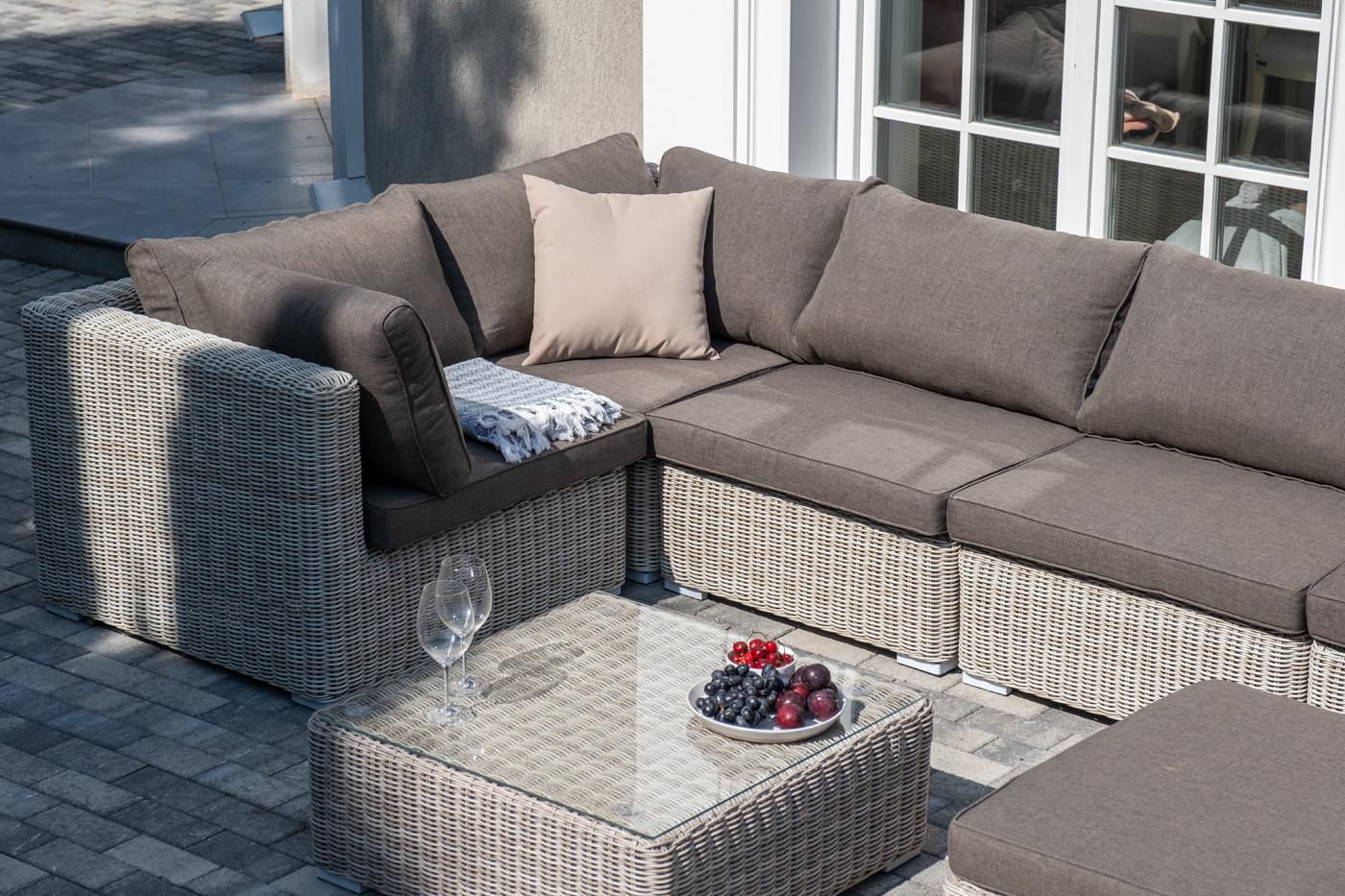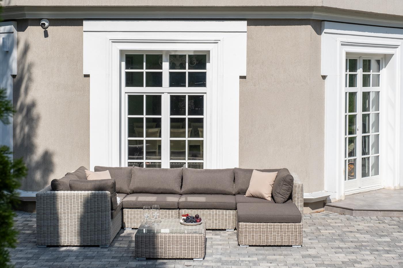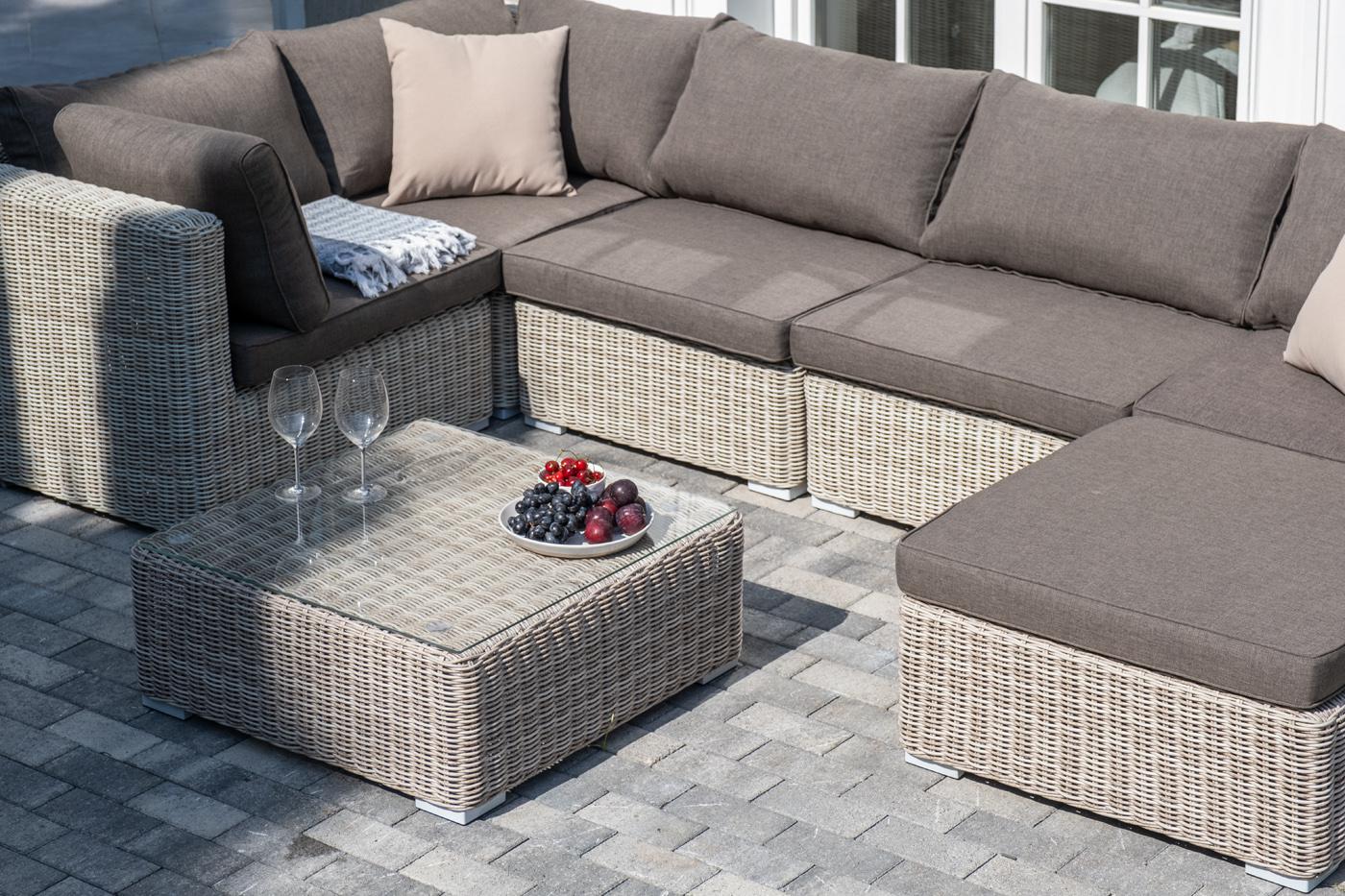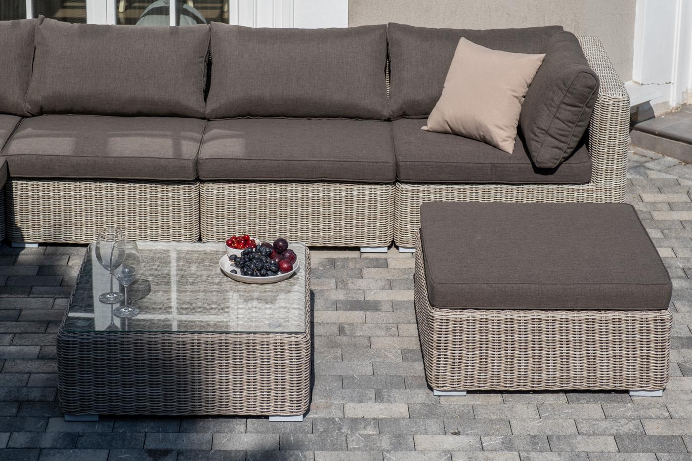 Лаунж-зона из искусственного ротанга бежевого цвета «Лунго» производит невероятное впечатление и окунает в мир уюта, благодаря продуманному и лаконичному дизайну. Модель состоит из семи предметов, каждый из которых изготовлен из прочного алюминиевого каркаса, оплетка выполнена вручную. В группу лаунж-зоны входят следующие элементы: - кофейный столик со столешницей из ударопрочного 5 мм стекла 740×740×300 мм. - три угловых модуля 860×860×650 мм. - два прямых модуля 740×860×650 мм . - оттоман "Лунго" модуль диванный угловой с подушками, цвет бежевый 3шт. 860Х860Х650, "Лунго" модуль диванный прямой с подушками, цвет бежевый 2шт. 740Х860Х650, "Лунго" журнальный столик плетеный, цвет бежевый 1шт. 740Х740Х300, "Лунго" плетеная оттоманка с подушкой, цвет бежевый 1шт. 740Х740Х380,