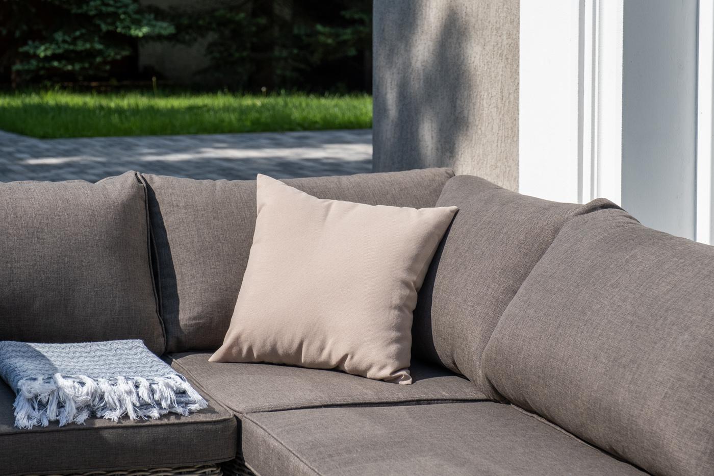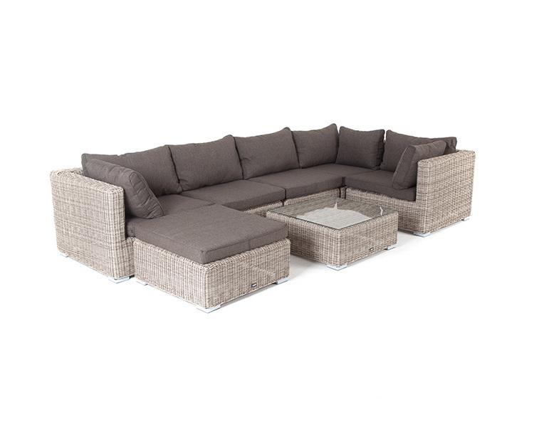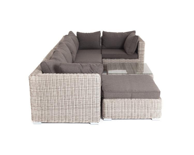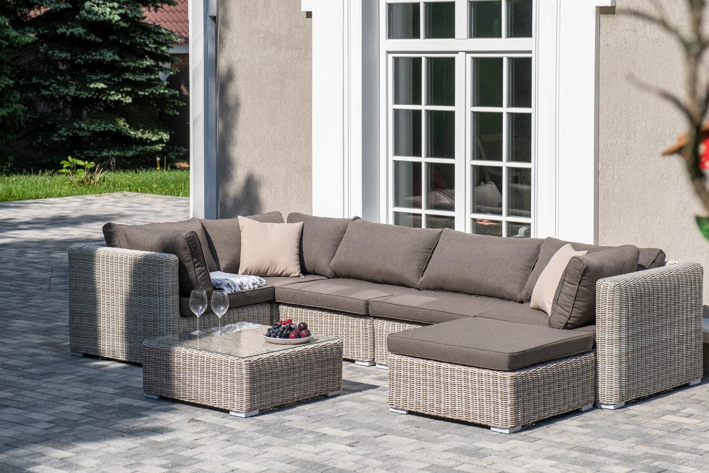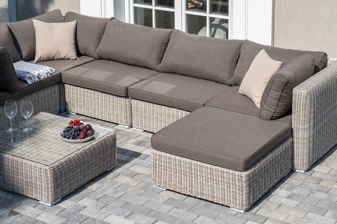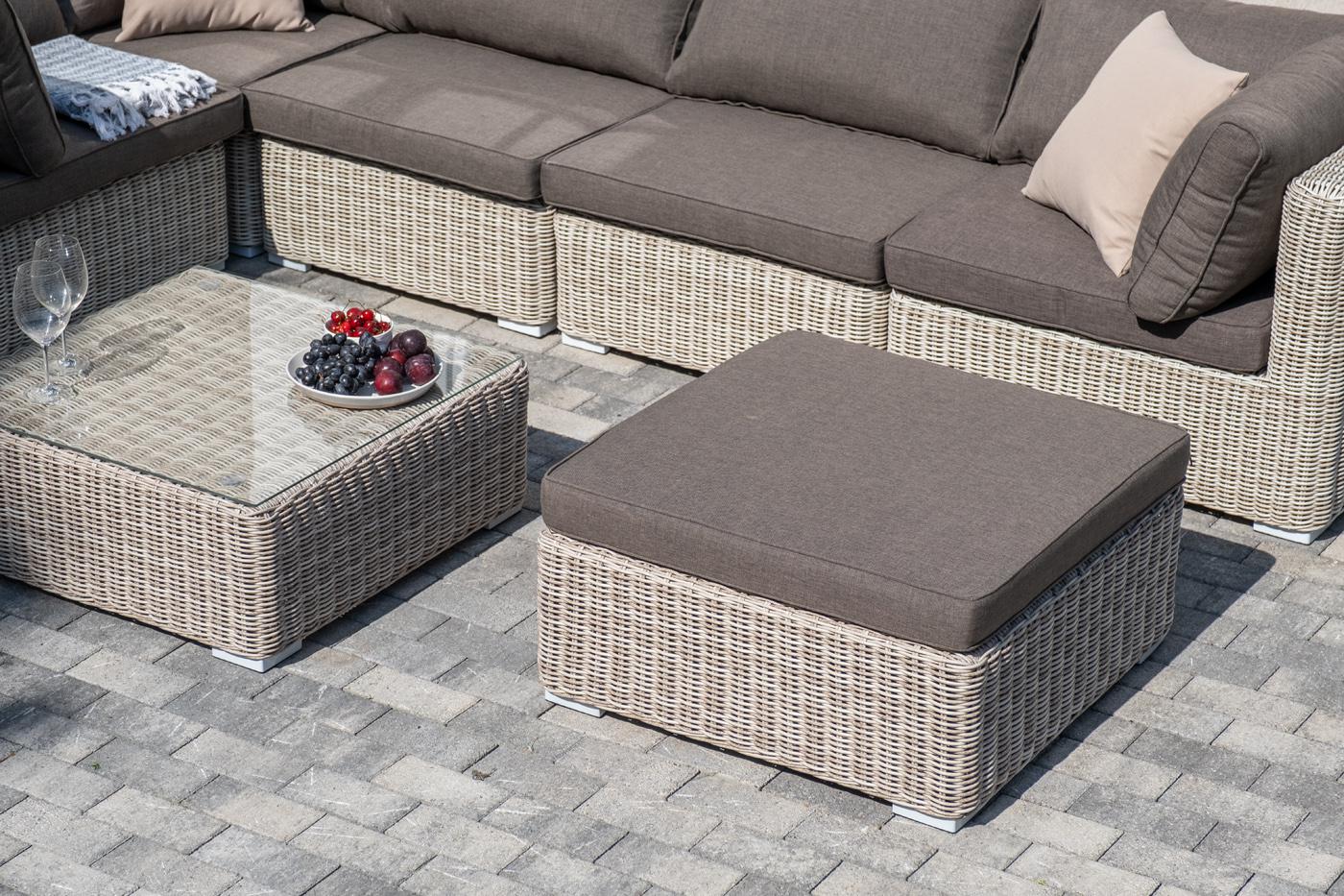 Лаунж-зона из искусственного ротанга бежевого цвета «Лунго» производит невероятное впечатление и окунает в мир уюта, благодаря продуманному и лаконичному дизайну. Модель состоит из семи предметов, каждый из которых изготовлен из прочного алюминиевого каркаса, оплетка выполнена вручную. В группу лаунж-зоны входят следующие элементы: - кофейный столик со столешницей из ударопрочного 5 мм стекла 740×740×300 мм. - три угловых модуля 860×860×650 мм. - два прямых модуля 740×860×650 мм . - оттоман "Лунго" модуль диванный угловой с подушками, цвет бежевый 3шт. 860Х860Х650, "Лунго" модуль диванный прямой с подушками, цвет бежевый 2шт. 740Х860Х650, "Лунго" журнальный столик плетеный, цвет бежевый 1шт. 740Х740Х300, "Лунго" плетеная оттоманка с подушкой, цвет бежевый 1шт. 740Х740Х380,