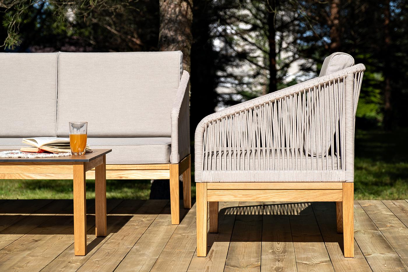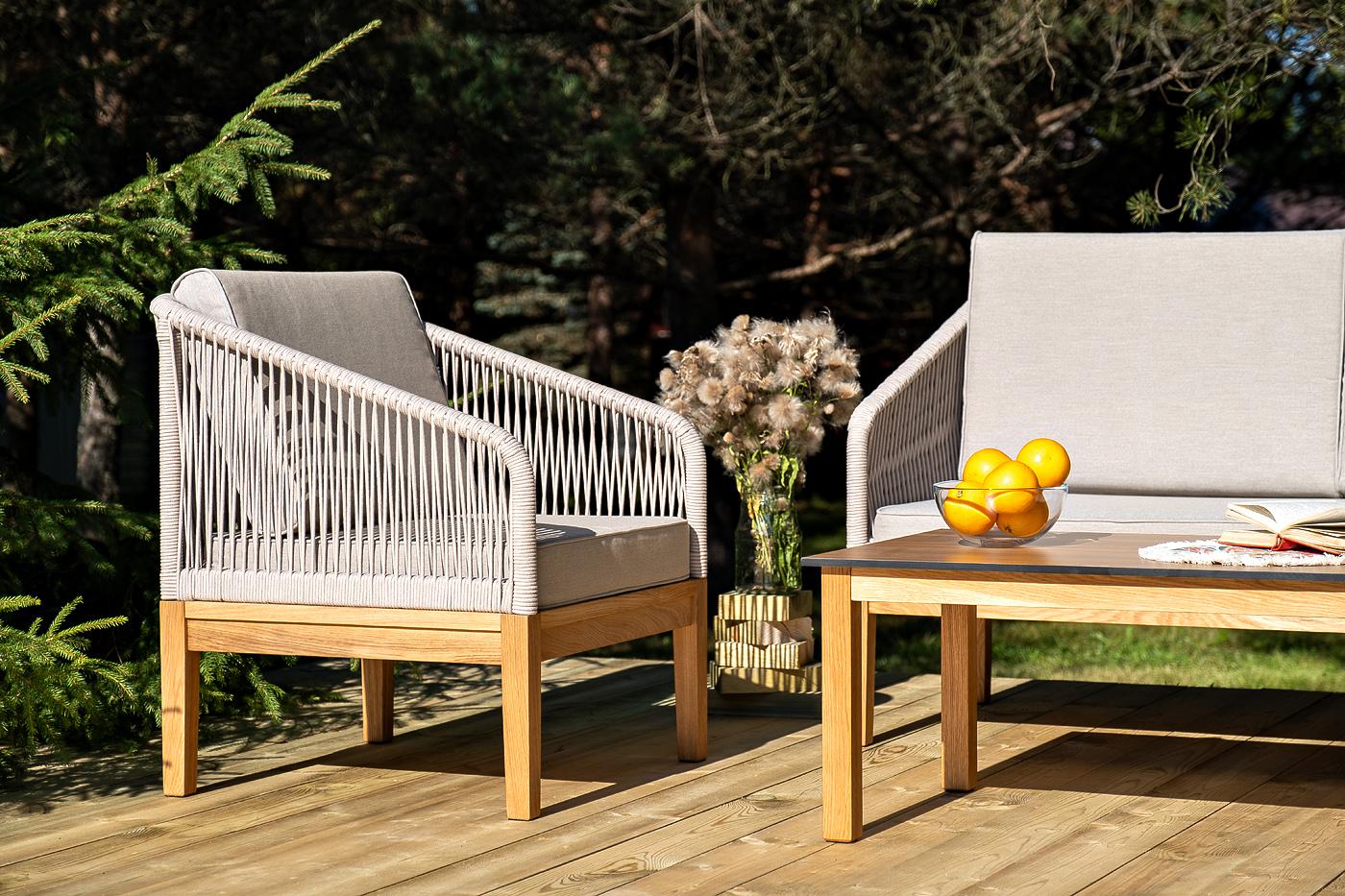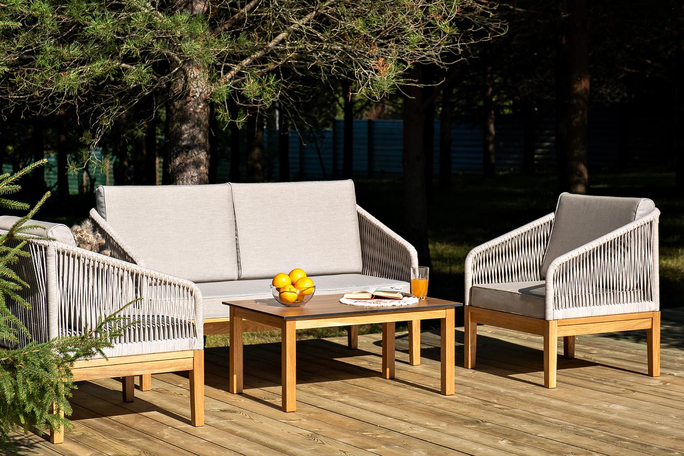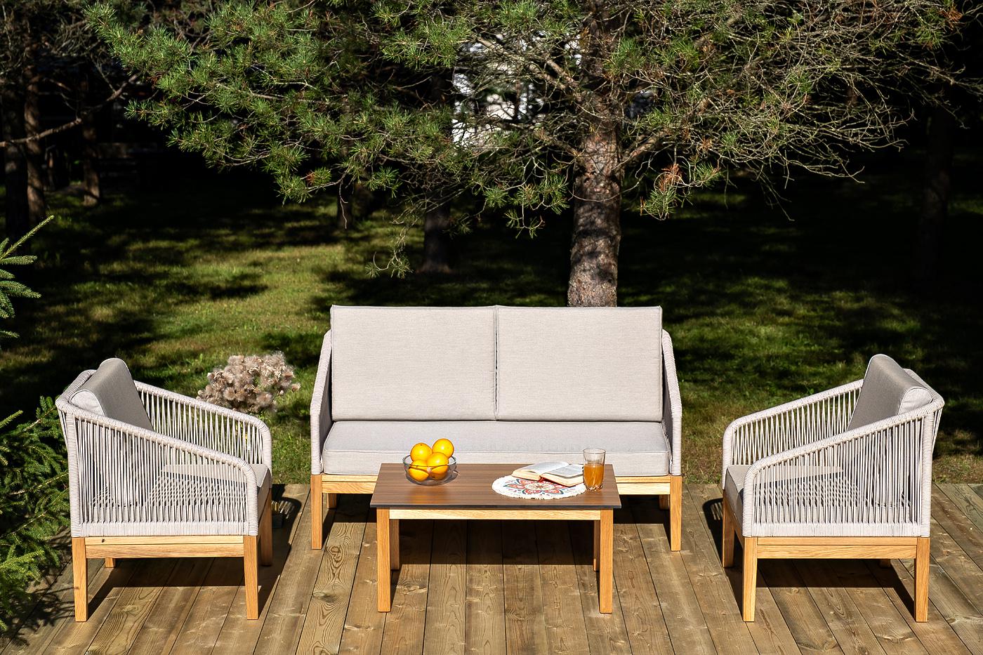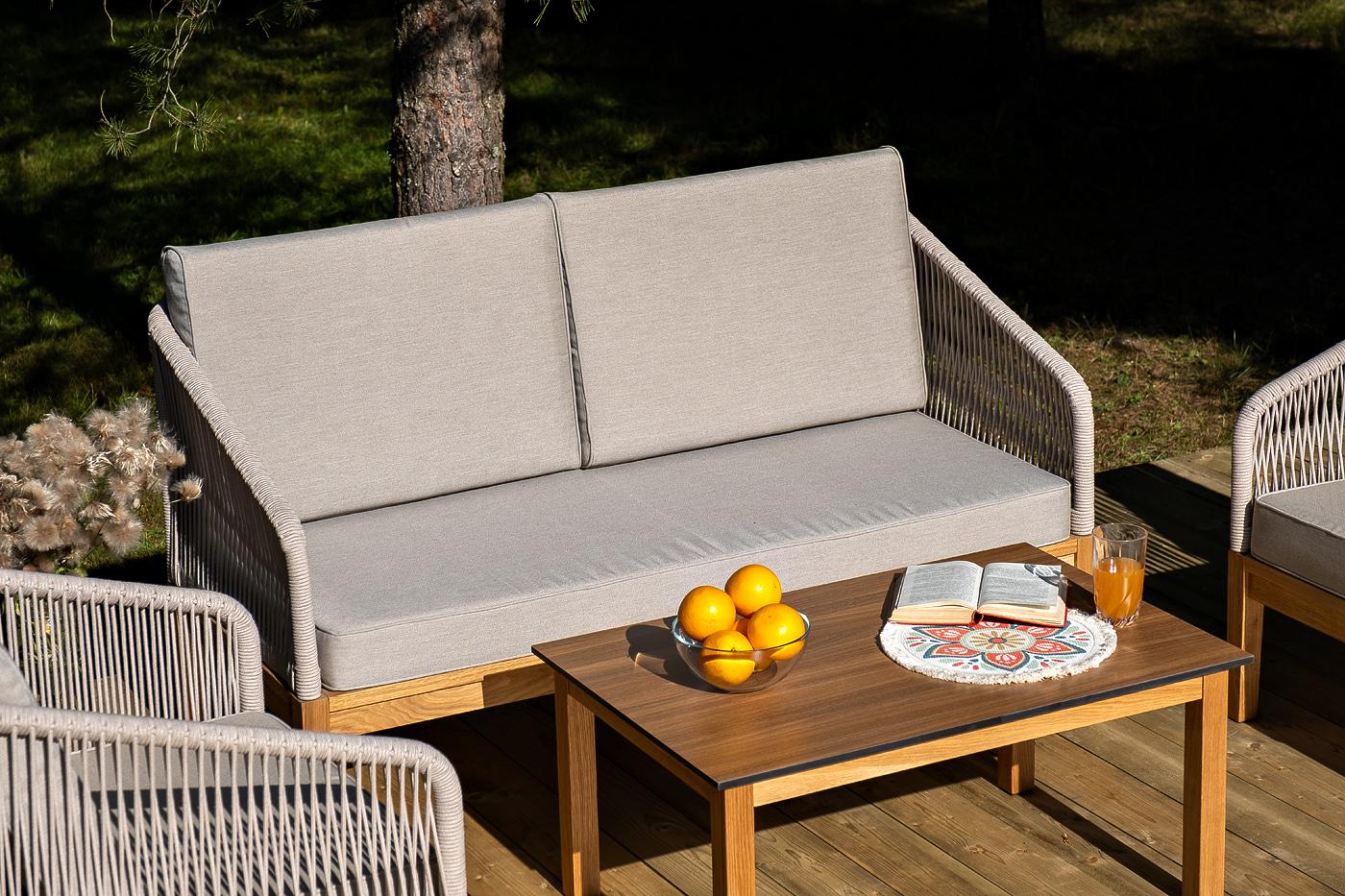Лаунж-зона «Канны» предназначена для размещения четырех персон. Она включает в себя: - два плетеных кресла (размер – 700×700×810 мм). - двухместный диван (размер – 1500×715×810 мм). - журнальный столик (размер – 900×600×400 мм). Подстолье изготовлено из дуба, столешница - из высококачественного монолитного компакт-пластик HPL, цвет «дуб». Каркас уличной мебели выполнен из дуба. Его дополняет бежевая оплетка, изготовленная на основе эластичных синтетических лент из полиэфирных волокон высокой "Канны" журнальный столик из HPL 90х60, H40, основание дуб, цвет столешницы "дуб" 1шт. 900Х600Х400, "Канны" диван 2-местный плетеный из роупа, основание дуб, роуп бежевый круглый, ткань бежевая 15052 1шт. 1 500Х700Х810, "Канны" кресло плетеное из роупа, основание дуб, роуп бежевый круглый, ткань бежевая 15052 2шт. 700Х700Х810,
