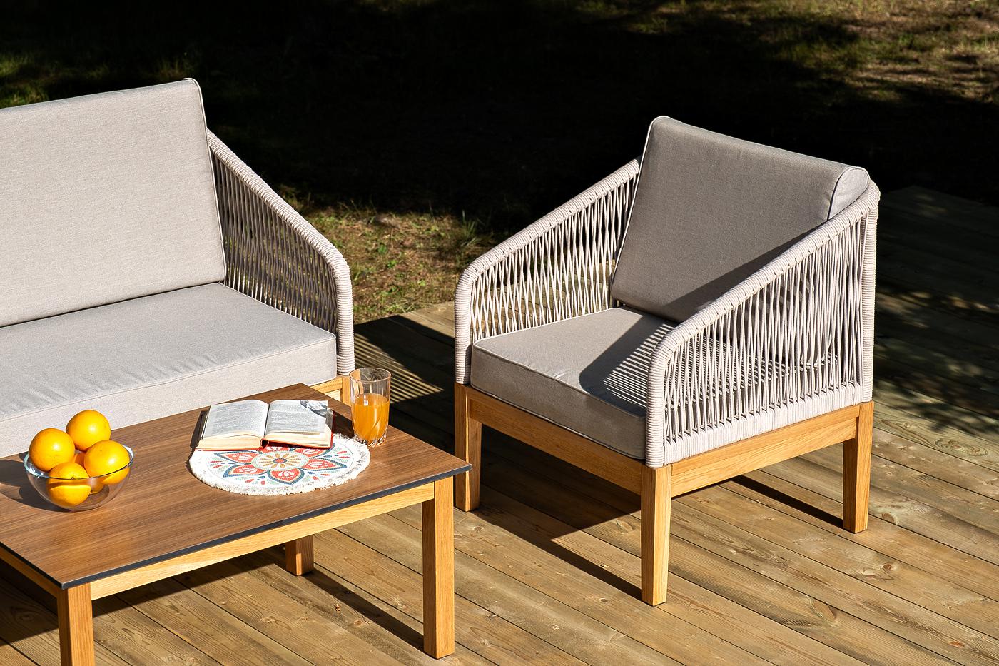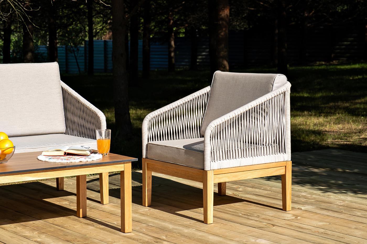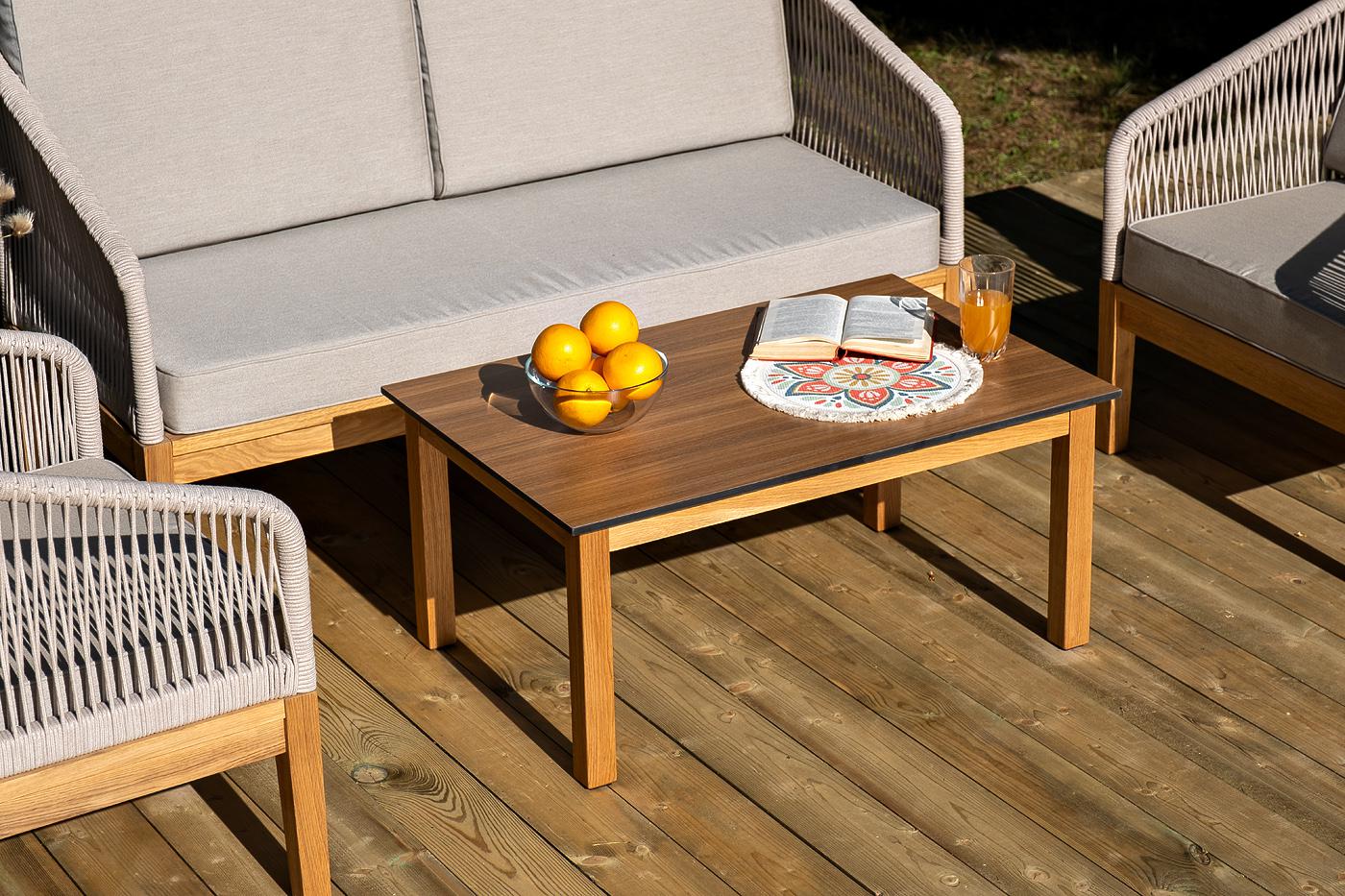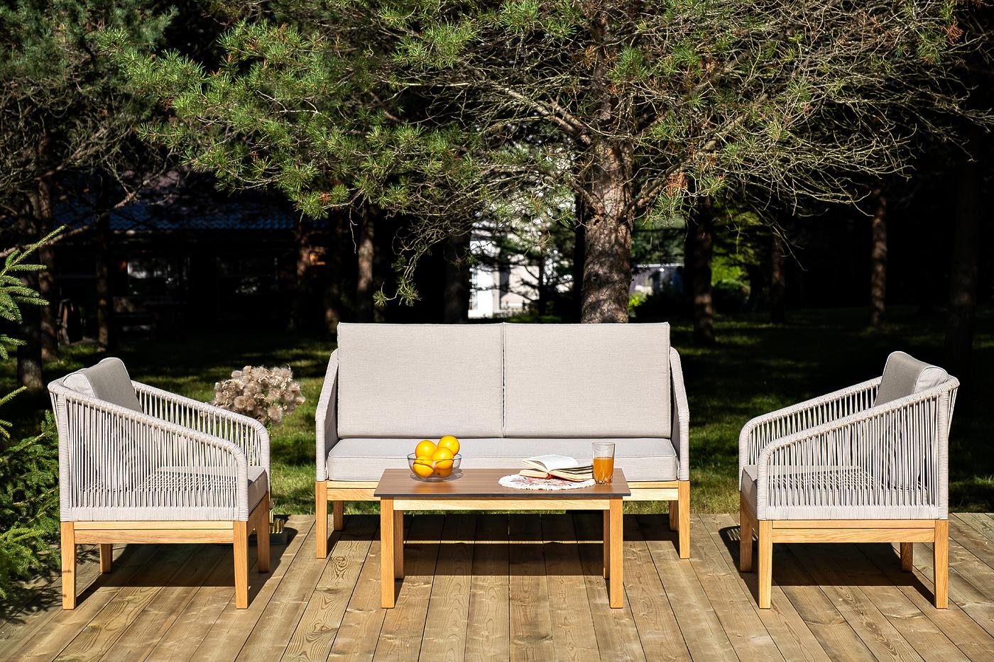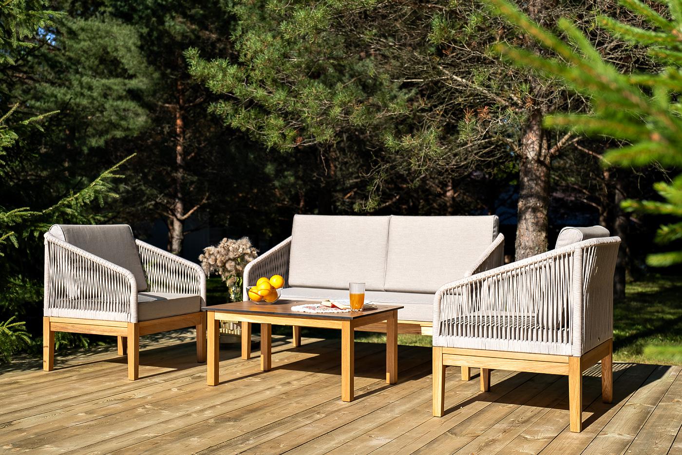 Лаунж-зона «Канны» предназначена для размещения четырех персон. Она включает в себя: - два плетеных кресла (размер – 700×700×810 мм). - двухместный диван (размер – 1500×715×810 мм). - журнальный столик (размер – 900×600×400 мм). Подстолье изготовлено из дуба, столешница - из высококачественного монолитного компакт-пластик HPL, цвет «дуб». Каркас уличной мебели выполнен из дуба. Его дополняет бежевая оплетка, изготовленная на основе эластичных синтетических лент из полиэфирных волокон высокой "Канны" журнальный столик из HPL 90х60, H40, основание дуб, цвет столешницы "дуб" 1шт. 900Х600Х400, "Канны" диван 2-местный плетеный из роупа, основание дуб, роуп бежевый круглый, ткань бежевая 15052 1шт. 1 500Х700Х810, "Канны" кресло плетеное из роупа, основание дуб, роуп бежевый круглый, ткань бежевая 15052 2шт. 700Х700Х810,