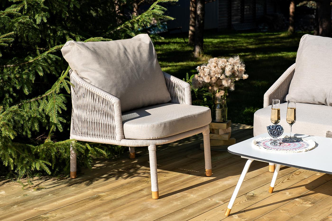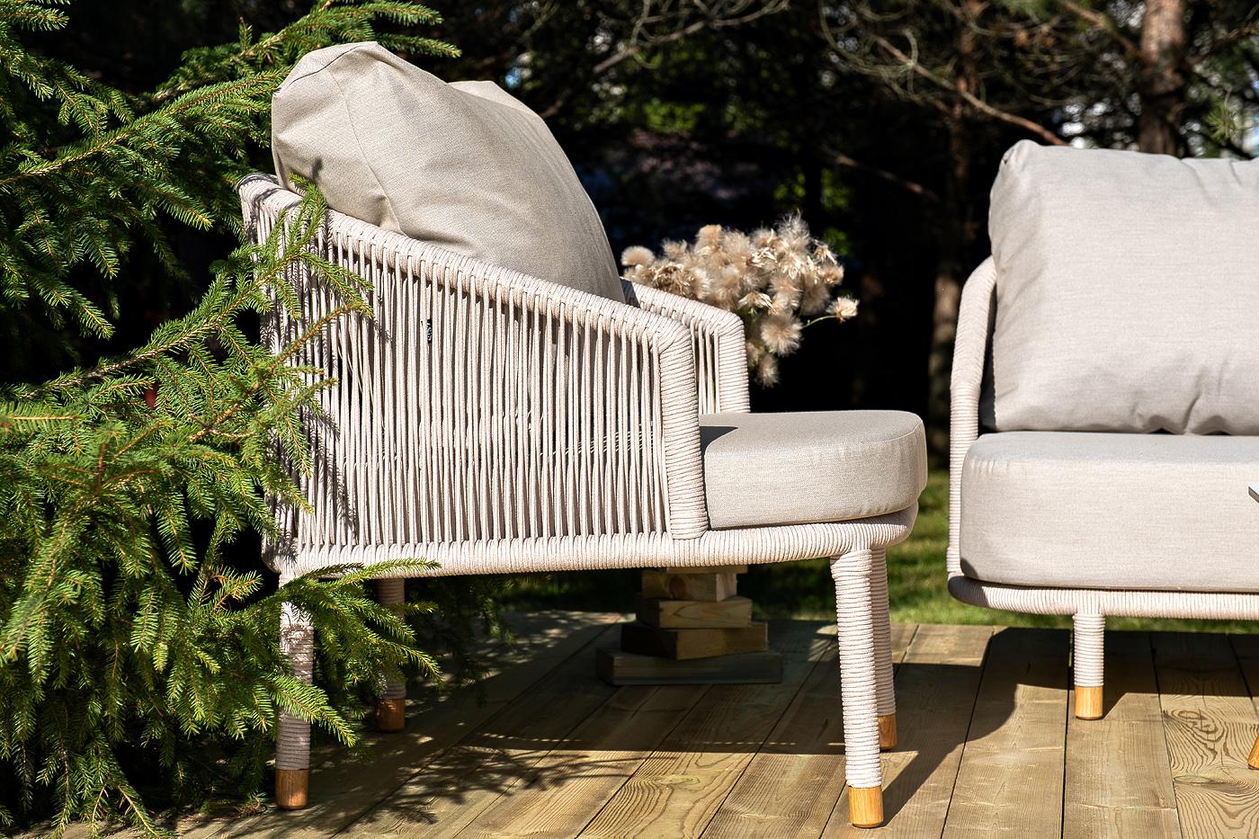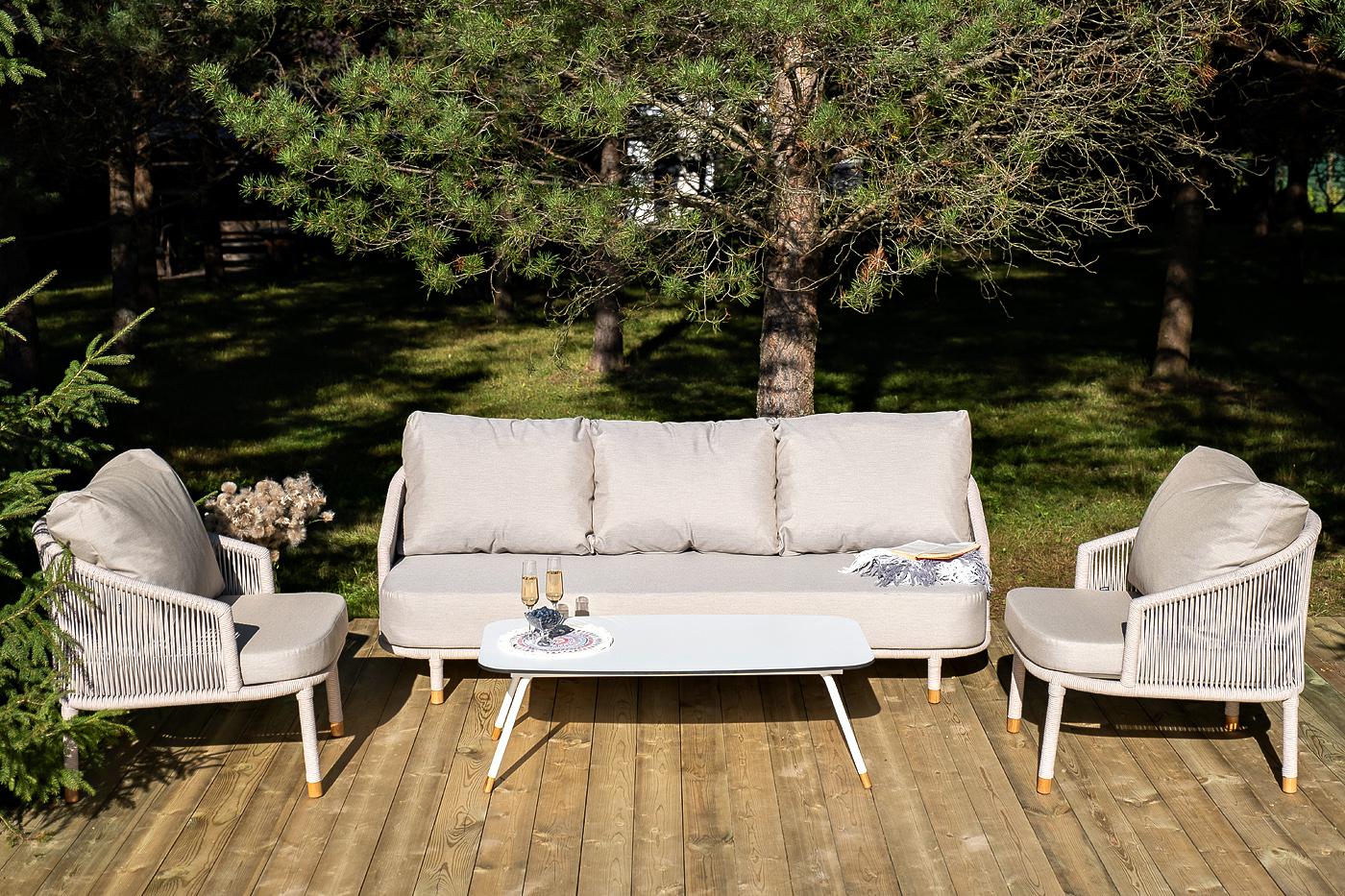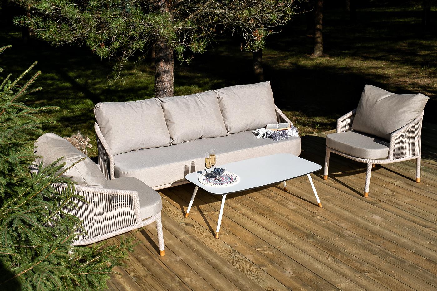 Лаунж-зона «Верона» предназначена для размещения пяти персон. Она включает в себя: - трехместный диван (размер - 2200×890×800 мм). - два плетеных кресла (размер - 760×840×800 мм). - журнальный столик (размер - 1200×650×400 мм). Каркас уличной мебели выполнен из износостойкого алюминия. Его дополняет бежевая ручная оплетка, изготовленная на основе эластичных синтетических лент из полиэфирных волокон высокой прочности (роупа). На ножках дивана, кресел и журнального столика идут дубовые наконечн "Верона" журнальный стол из HPL 120х65, H40, каркас белый муар, цвет столешницы "молочный" 1шт. 1 200Х650Х400, "Верона" диван 3-местный плетеный из роупа, каркас алюминий белый муар, роуп бежевый круглый, ткань бежевая 15052 1шт. 2 140Х890Х800, "Верона" кресло плетеное из роупа, каркас алюминий белый муар, роуп бежевый круглый, ткань бежевая 15052 2шт. 760Х840Х730,