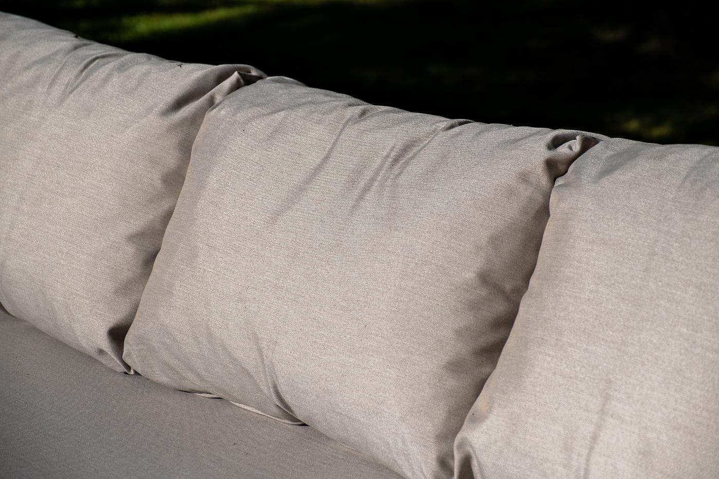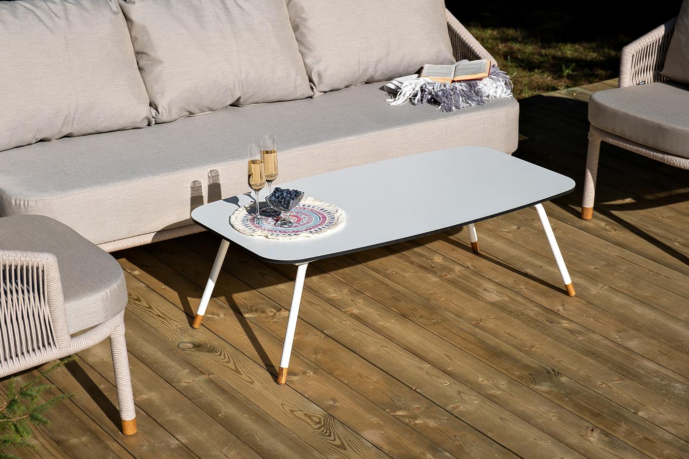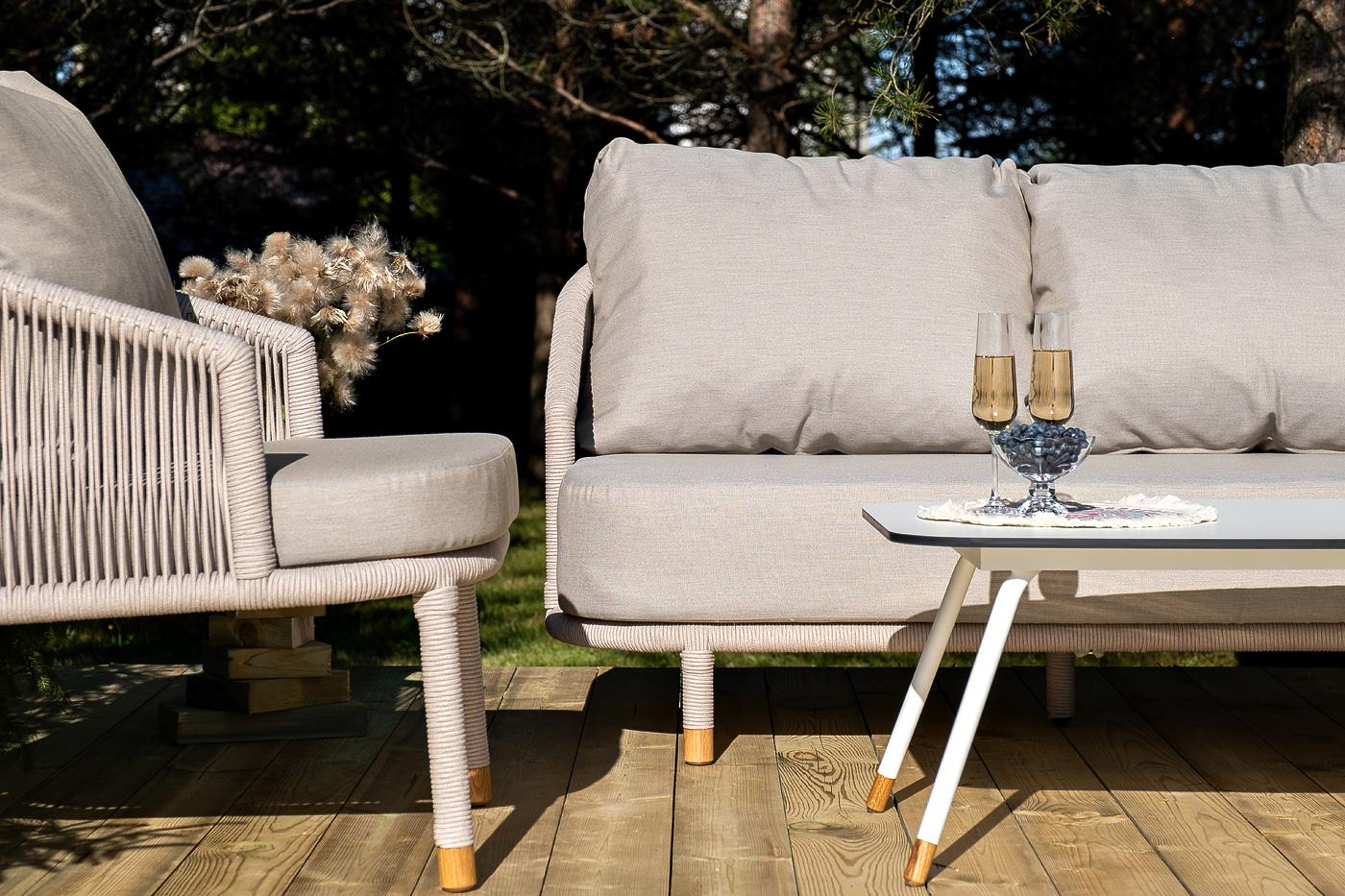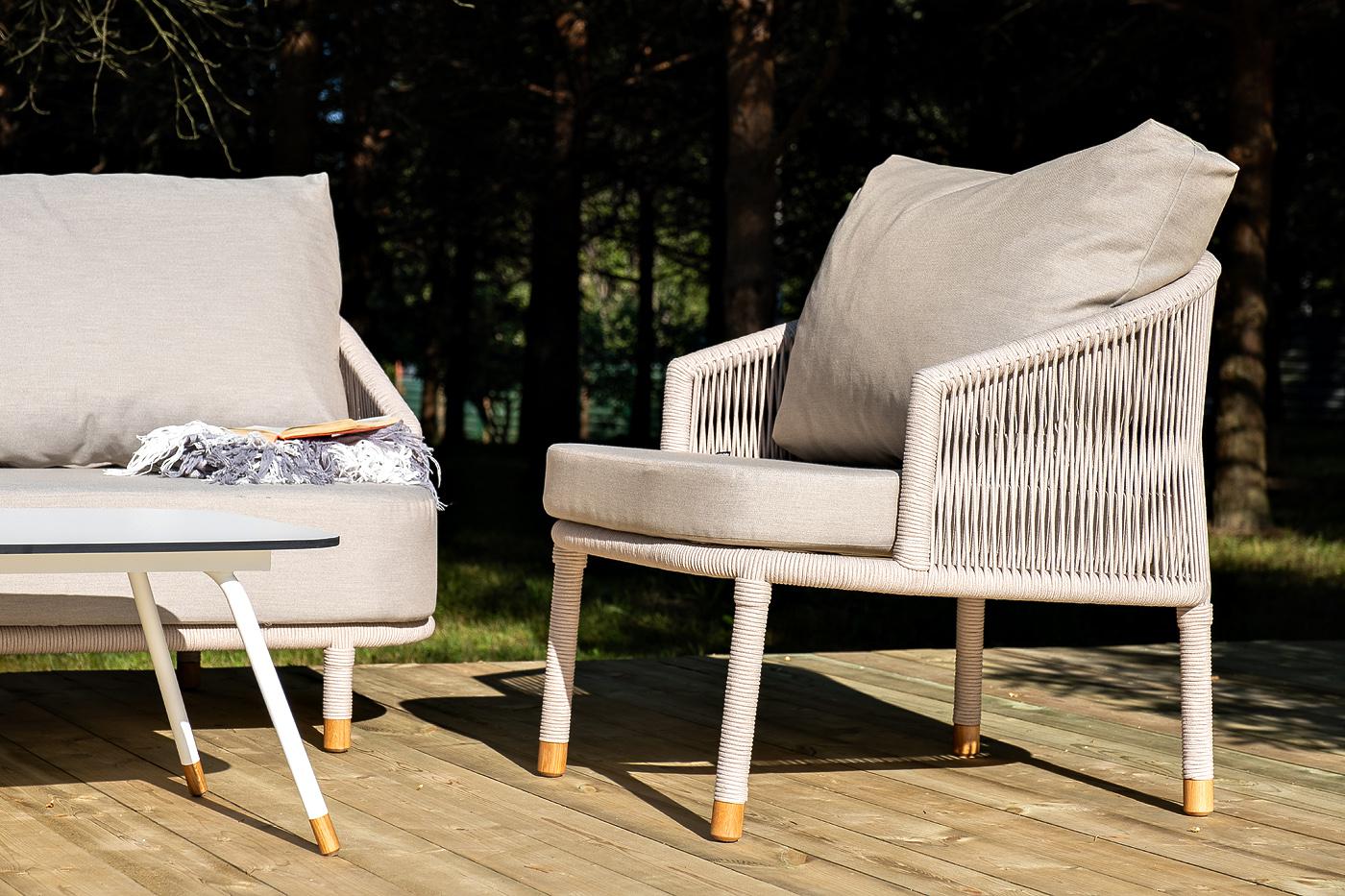 Лаунж-зона «Верона» предназначена для размещения пяти персон. Она включает в себя: - трехместный диван (размер - 2200×890×800 мм). - два плетеных кресла (размер - 760×840×800 мм). - журнальный столик (размер - 1200×650×400 мм). Каркас уличной мебели выполнен из износостойкого алюминия. Его дополняет бежевая ручная оплетка, изготовленная на основе эластичных синтетических лент из полиэфирных волокон высокой прочности (роупа). На ножках дивана, кресел и журнального столика идут дубовые наконечн "Верона" журнальный стол из HPL 120х65, H40, каркас белый муар, цвет столешницы "молочный" 1шт. 1 200Х650Х400, "Верона" диван 3-местный плетеный из роупа, каркас алюминий белый муар, роуп бежевый круглый, ткань бежевая 15052 1шт. 2 140Х890Х800, "Верона" кресло плетеное из роупа, каркас алюминий белый муар, роуп бежевый круглый, ткань бежевая 15052 2шт. 760Х840Х730,