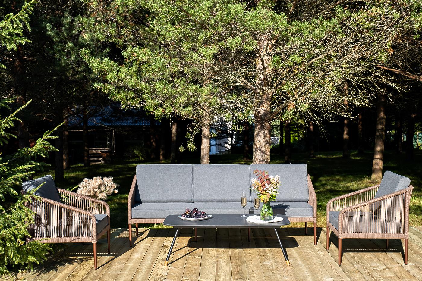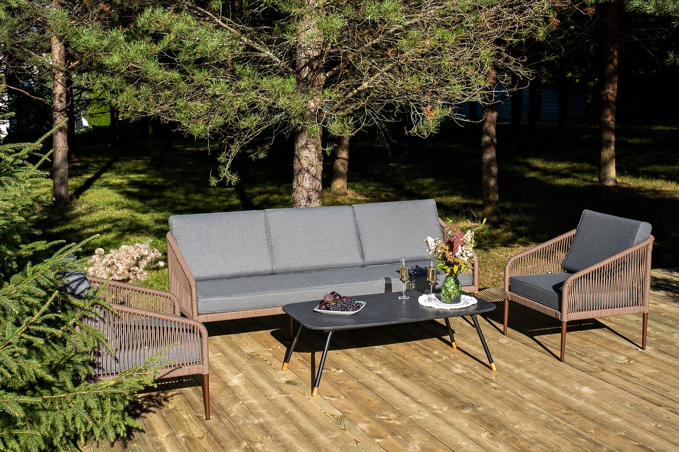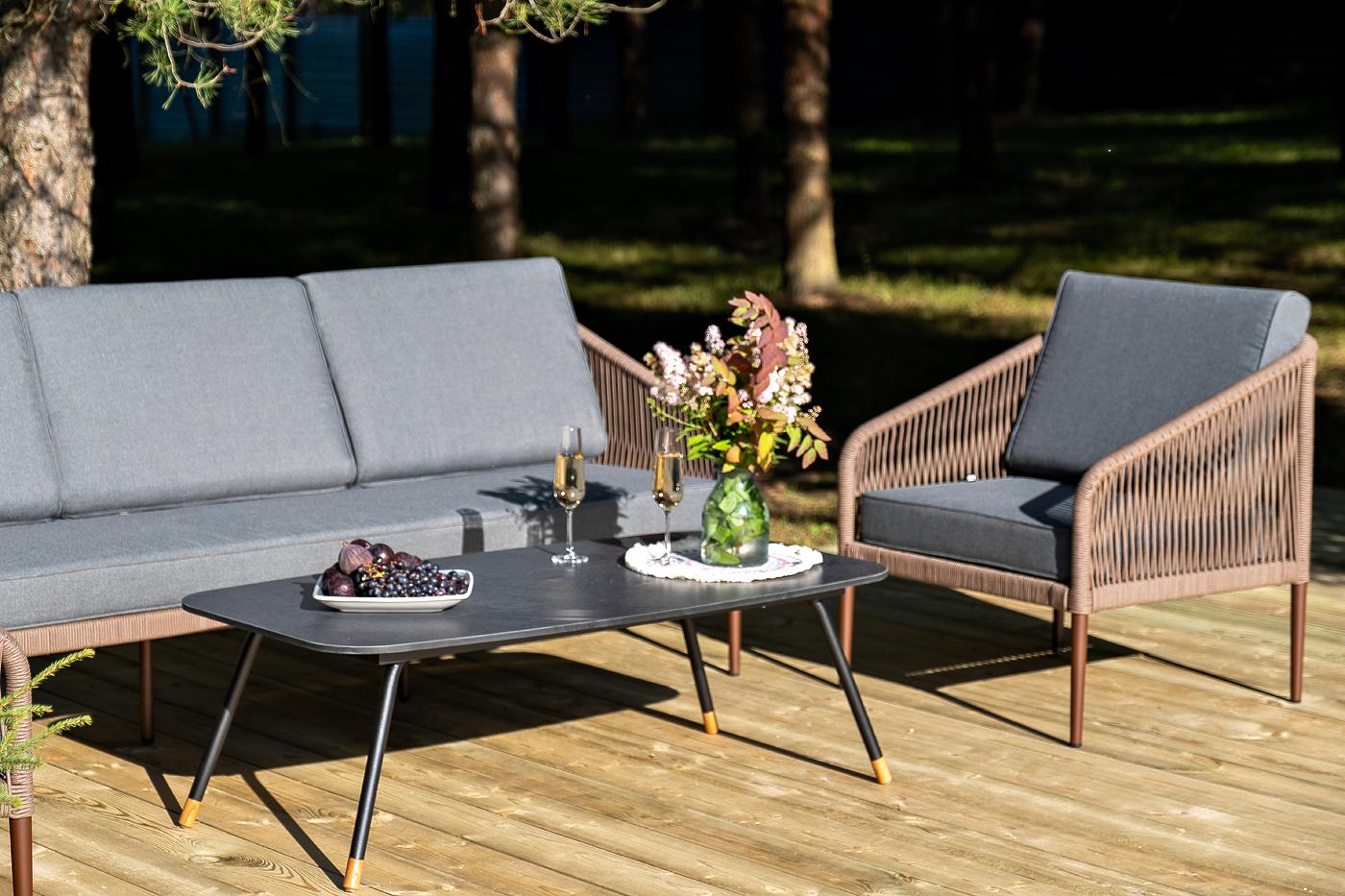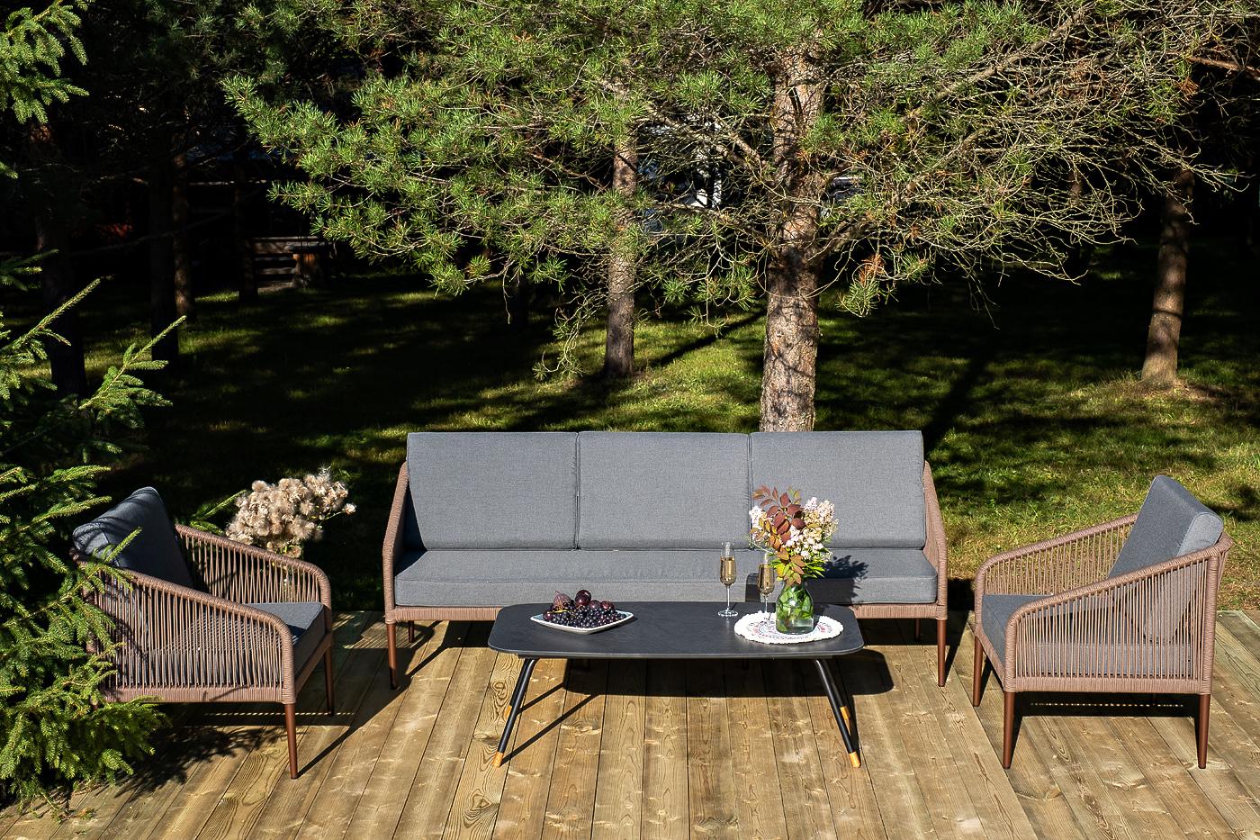 Лаунж-зона «Канны» на пять персон состоит из: - два плетеных кресла (размер – 700×700×750 мм). - трехместный диван (размер – 2030×700×750 мм). - журнальный столик (размер – 1200×650×400 мм). Каркас уличной мебели выполнен из износостойкого алюминия. Его дополняет коричневая ручная оплетка, изготовленная на основе эластичных синтетических лент из полиэфирных волокон высокой прочности. Кресла и диван идут в комплекте с мягкими подушками в чехлах темно-серого цвета. "Верона" журнальный стол из HPL 120х65, H40, каркас черный муар, цвет столешницы "серый гранит" 1шт. 1 200Х650Х400, "Канны" диван 3-местный плетеный из роупа, каркас алюминий коричневый (RAL8016) муар, роуп коричневый круглый, ткань темно-серая 027 1шт. 2 030Х700Х750, "Канны" кресло плетеное из роупа, каркас алюминий коричневый (RAL8016) муар, роуп коричневый круглый, ткань темно-серая 027 2шт. 700Х700Х750,