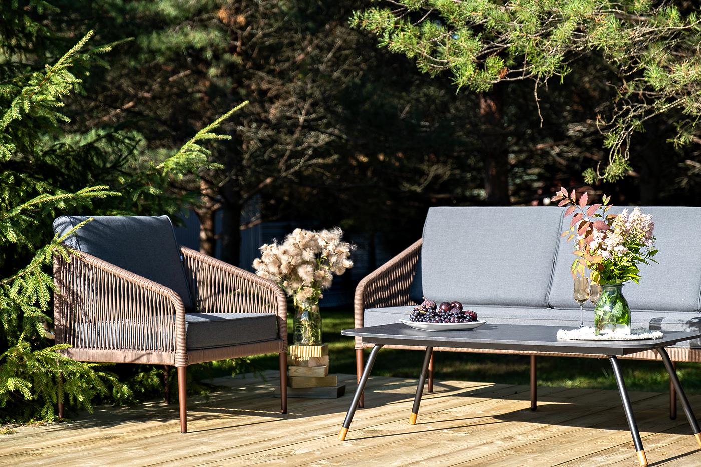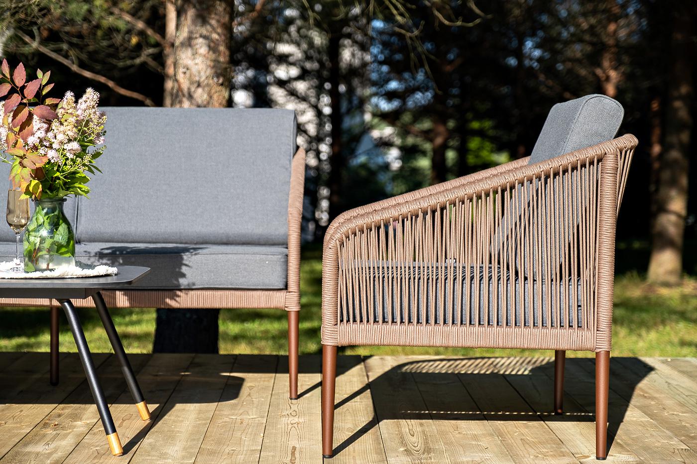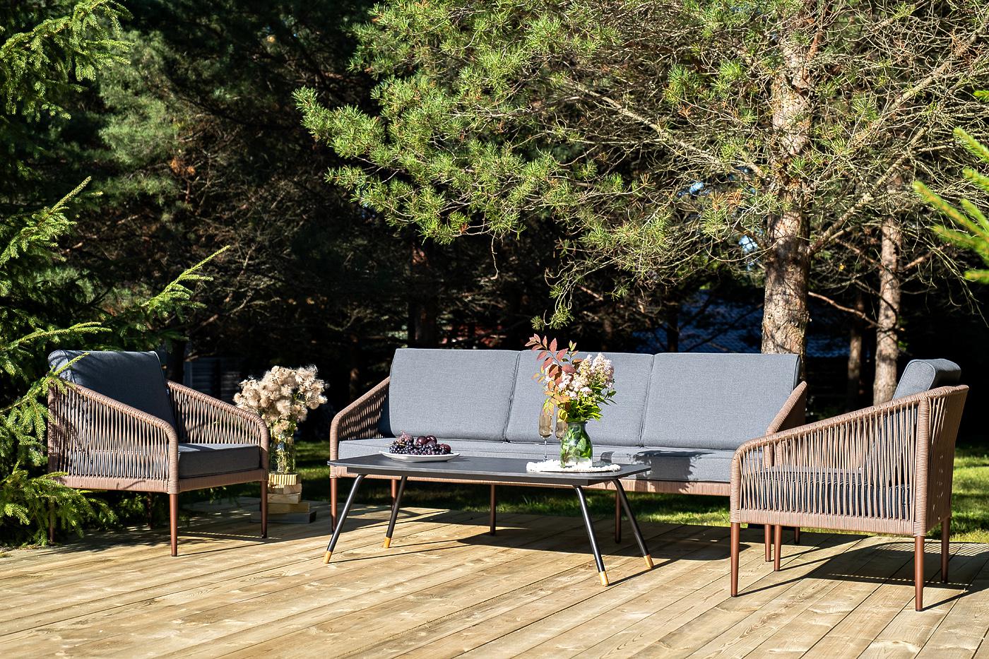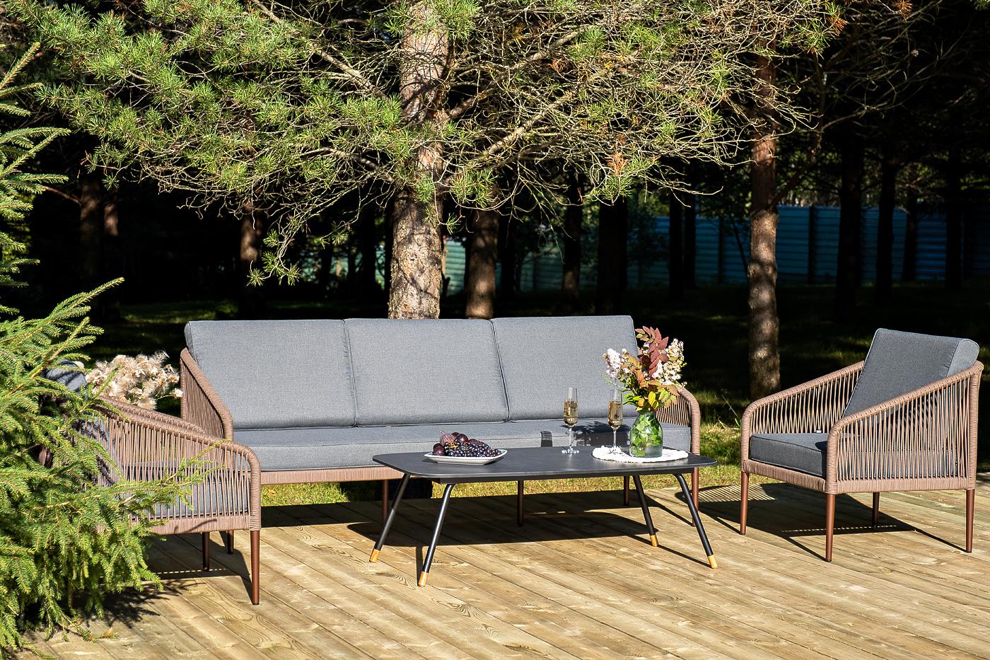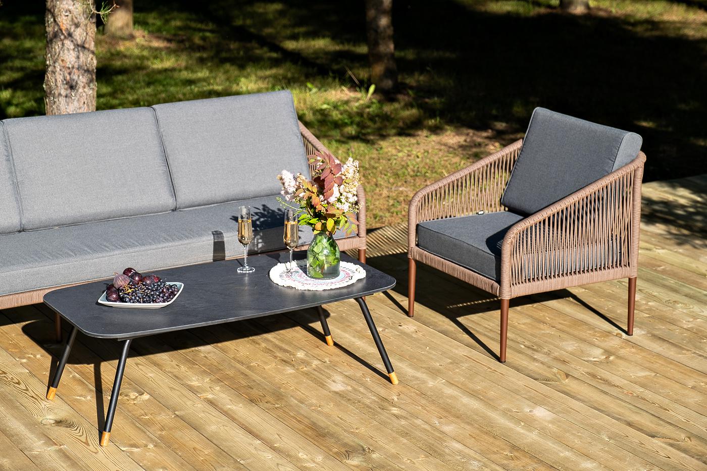 Лаунж-зона «Канны» на пять персон состоит из: - два плетеных кресла (размер – 700×700×750 мм). - трехместный диван (размер – 2030×700×750 мм). - журнальный столик (размер – 1200×650×400 мм). Каркас уличной мебели выполнен из износостойкого алюминия. Его дополняет коричневая ручная оплетка, изготовленная на основе эластичных синтетических лент из полиэфирных волокон высокой прочности. Кресла и диван идут в комплекте с мягкими подушками в чехлах темно-серого цвета. "Верона" журнальный стол из HPL 120х65, H40, каркас черный муар, цвет столешницы "серый гранит" 1шт. 1 200Х650Х400, "Канны" диван 3-местный плетеный из роупа, каркас алюминий коричневый (RAL8016) муар, роуп коричневый круглый, ткань темно-серая 027 1шт. 2 030Х700Х750, "Канны" кресло плетеное из роупа, каркас алюминий коричневый (RAL8016) муар, роуп коричневый круглый, ткань темно-серая 027 2шт. 700Х700Х750,
