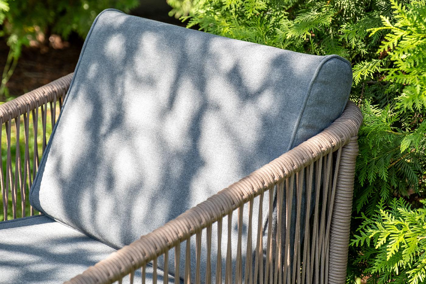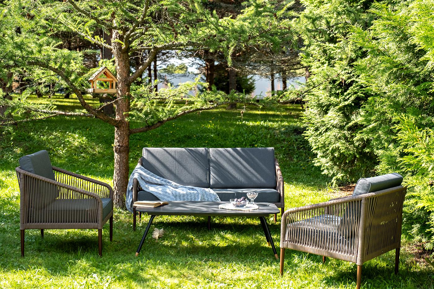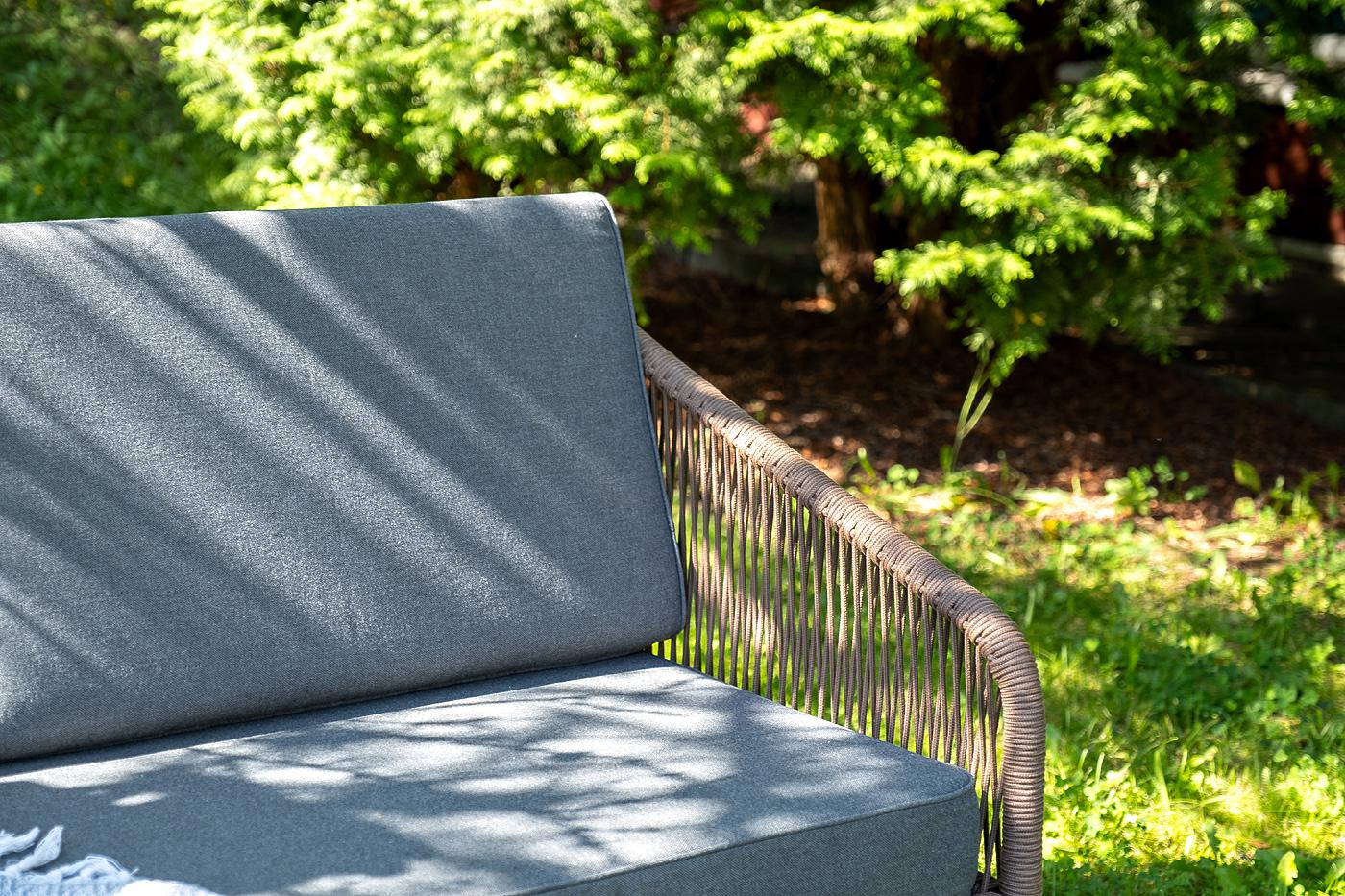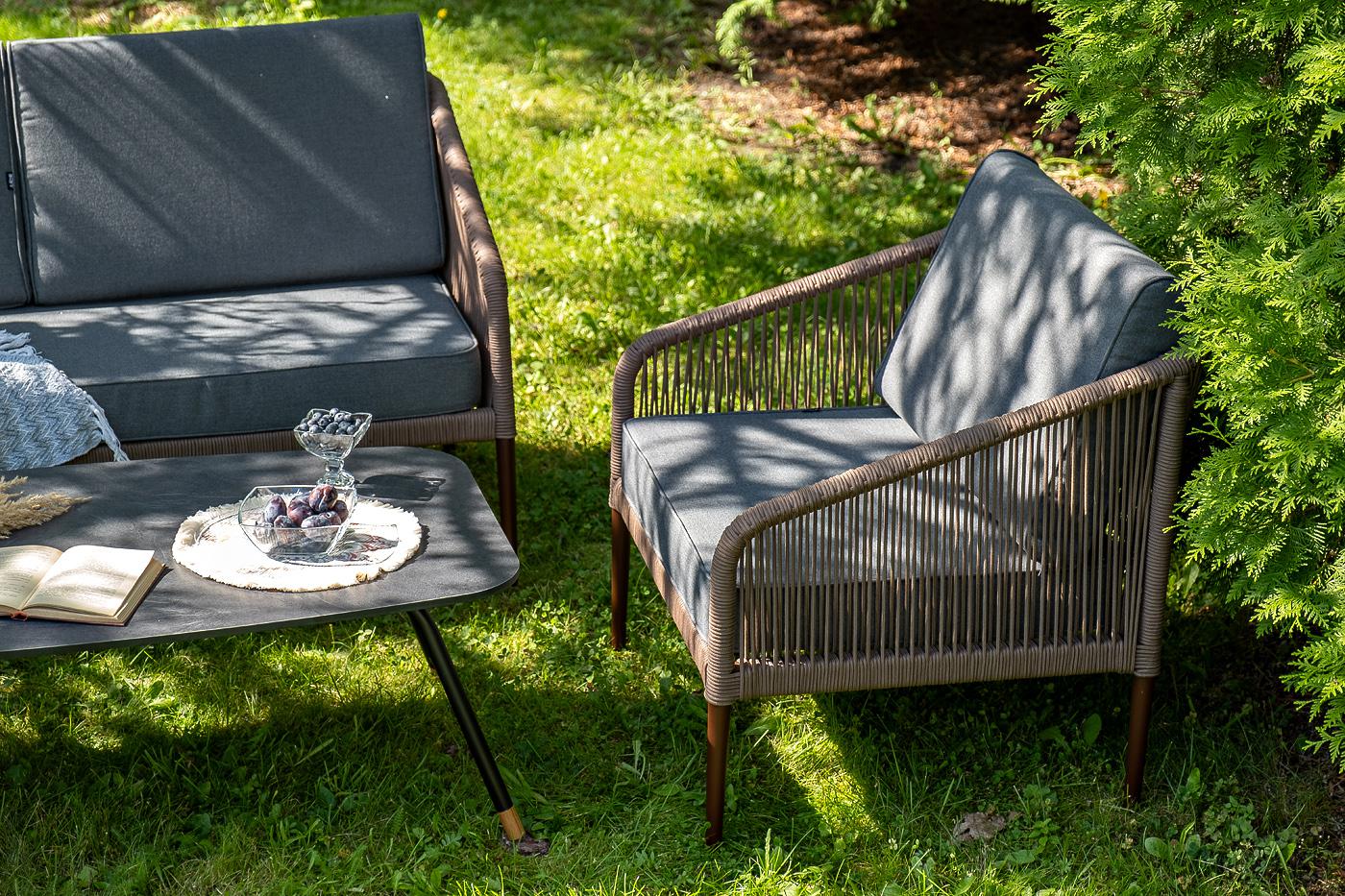 Лаунж-зона «Канны» предназначена для размещения четырех персон. Она включает в себя: - журнальный стол (размер – 1200×650×400 мм). - два плетеных кресла (размер – 700×700×750 мм). - двухместный диван (размер – 1470×715×750 мм). Каркас уличной мебели выполнен из прочного алюминия. Его дополняет коричневая оплетка, изготовленная на основе эластичных синтетических лент из полиэфирных волокон высокой прочности. Кресла и диван идут в комплекте с мягкими подушками в чехлах темно-серого цвета. "Канны" диван 2-местный плетеный из роупа, каркас алюминий коричневый (RAL8016) муар, роуп коричневый круглый, ткань темно-серая 027 1шт. 1 500Х700Х750, "Канны" кресло плетеное из роупа, каркас алюминий коричневый (RAL8016) муар, роуп коричневый круглый, ткань темно-серая 027 2шт. 700Х700Х750, "Верона" журнальный стол из HPL 120х65, H40, каркас черный муар, цвет столешницы "серый гранит" 1шт. 1 200Х650Х400,