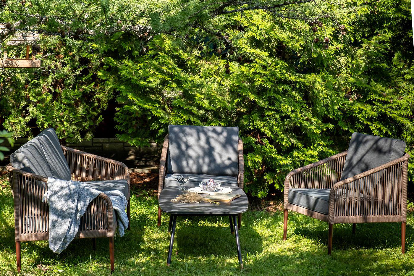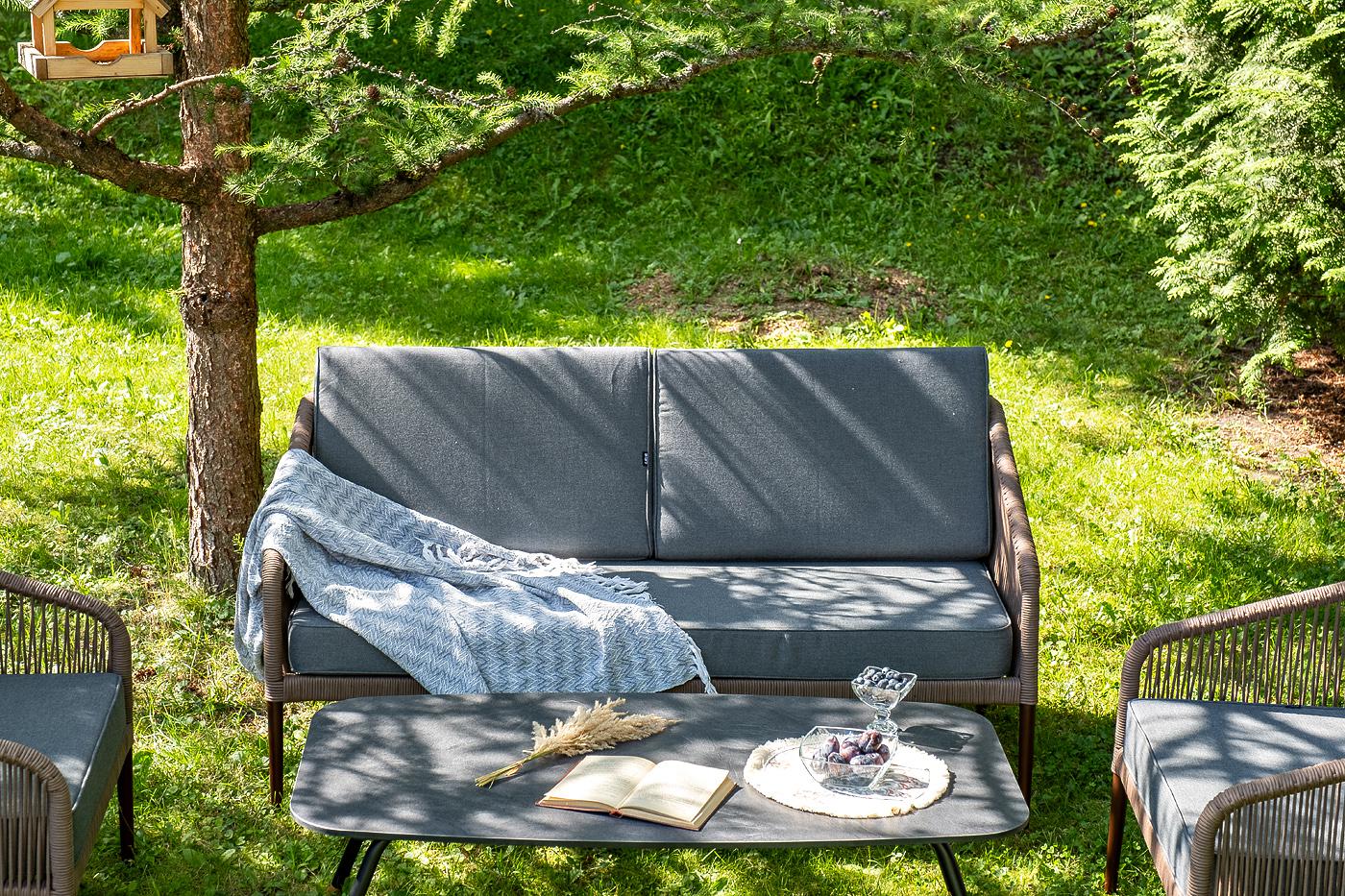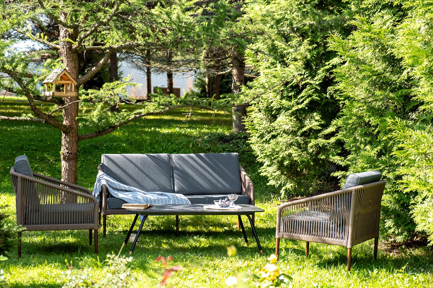 Лаунж-зона «Канны» предназначена для размещения четырех персон. Она включает в себя: - журнальный стол (размер – 1200×650×400 мм). - два плетеных кресла (размер – 700×700×750 мм). - двухместный диван (размер – 1470×715×750 мм). Каркас уличной мебели выполнен из прочного алюминия. Его дополняет коричневая оплетка, изготовленная на основе эластичных синтетических лент из полиэфирных волокон высокой прочности. Кресла и диван идут в комплекте с мягкими подушками в чехлах темно-серого цвета. "Канны" диван 2-местный плетеный из роупа, каркас алюминий коричневый (RAL8016) муар, роуп коричневый круглый, ткань темно-серая 027 1шт. 1 500Х700Х750, "Канны" кресло плетеное из роупа, каркас алюминий коричневый (RAL8016) муар, роуп коричневый круглый, ткань темно-серая 027 2шт. 700Х700Х750, "Верона" журнальный стол из HPL 120х65, H40, каркас черный муар, цвет столешницы "серый гранит" 1шт. 1 200Х650Х400,
