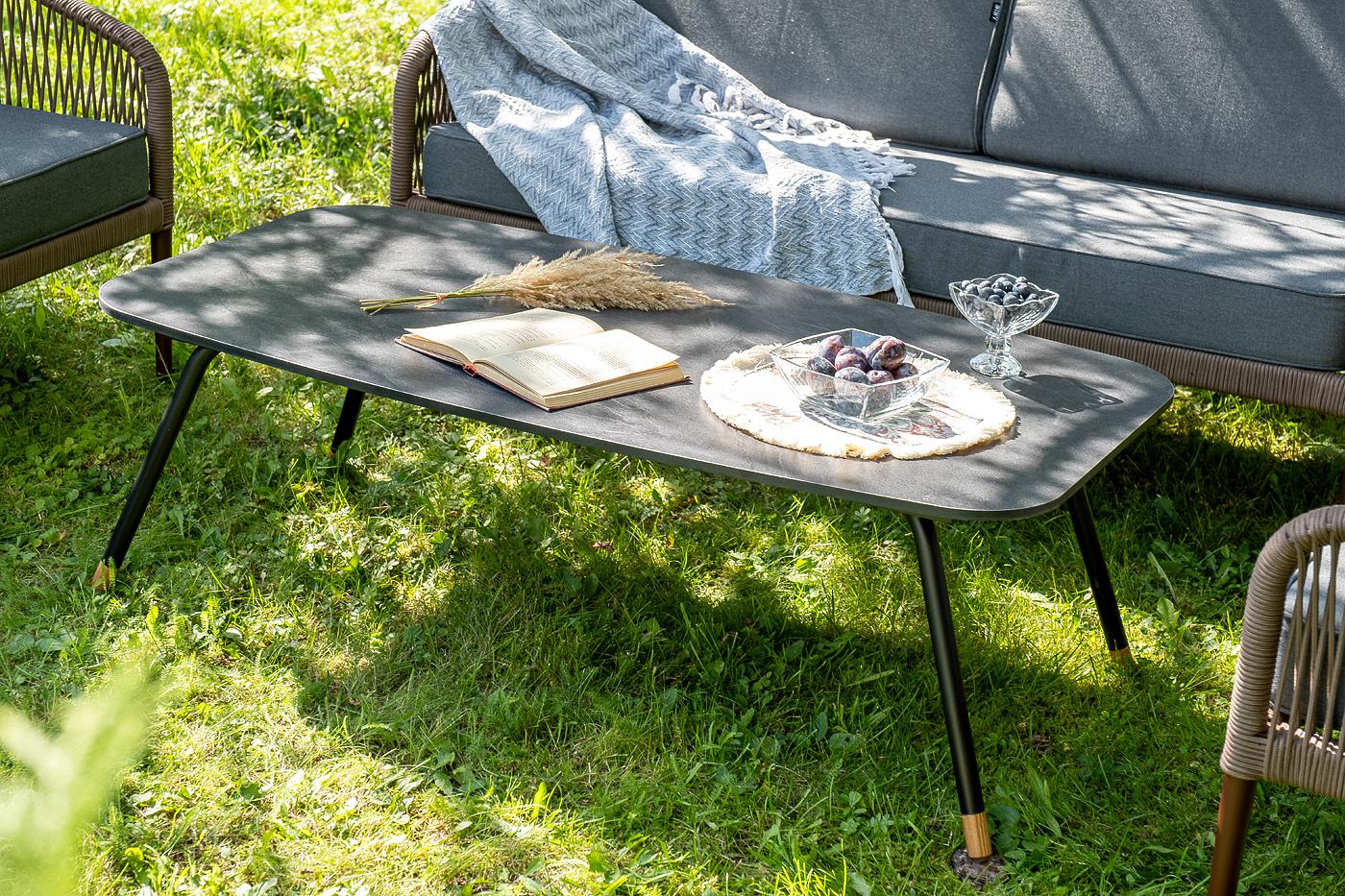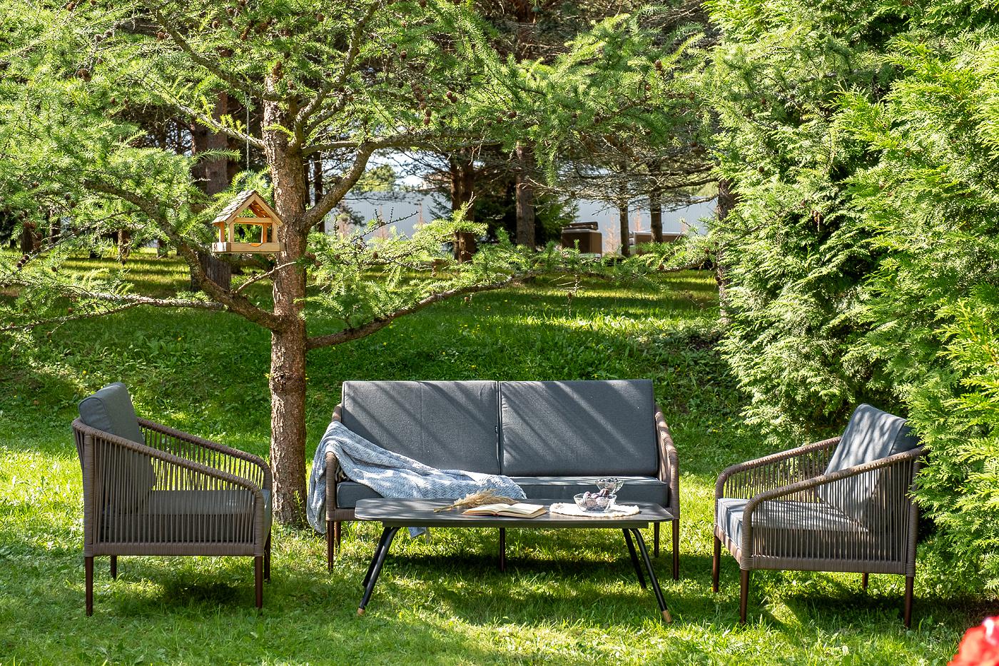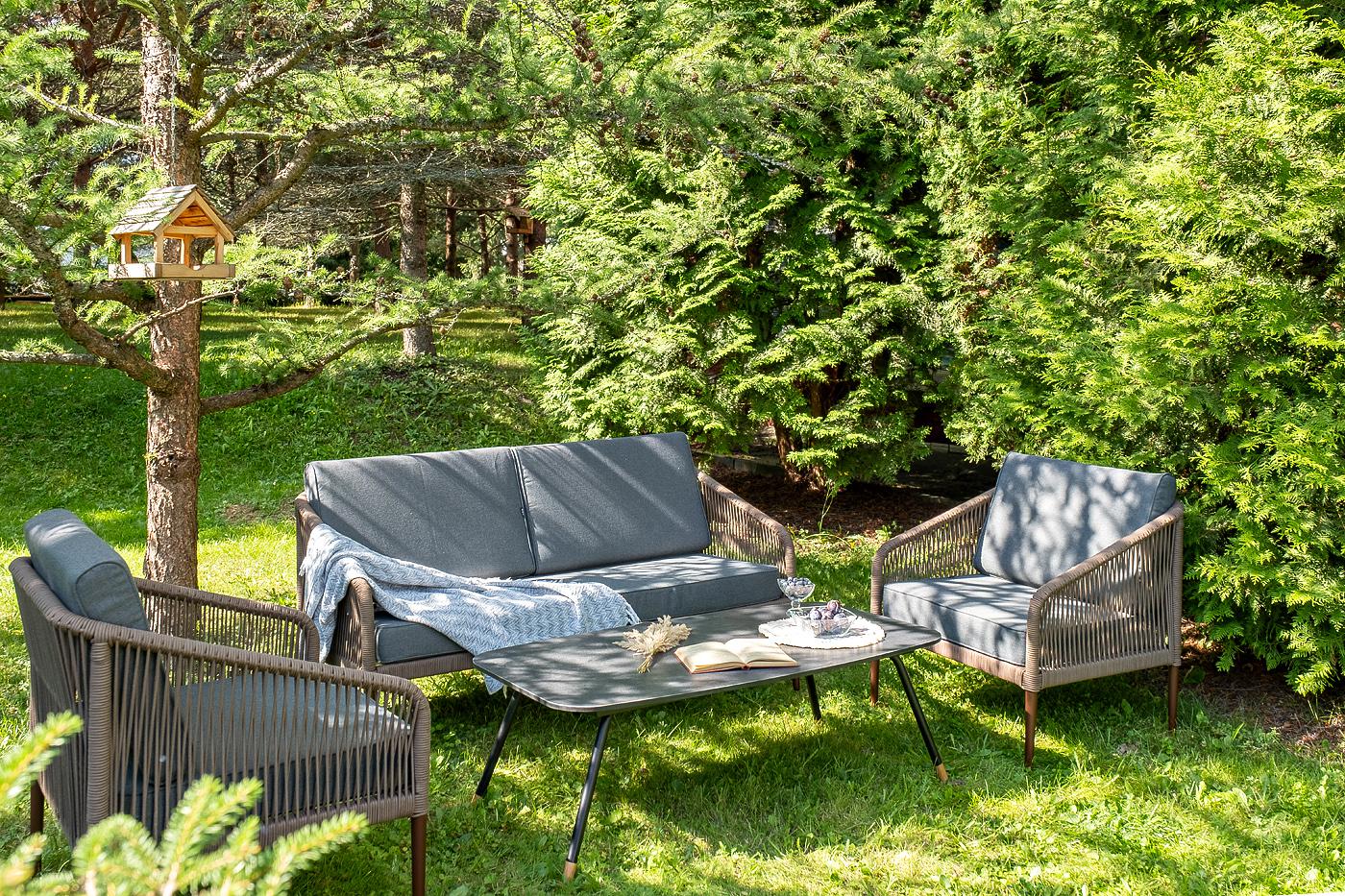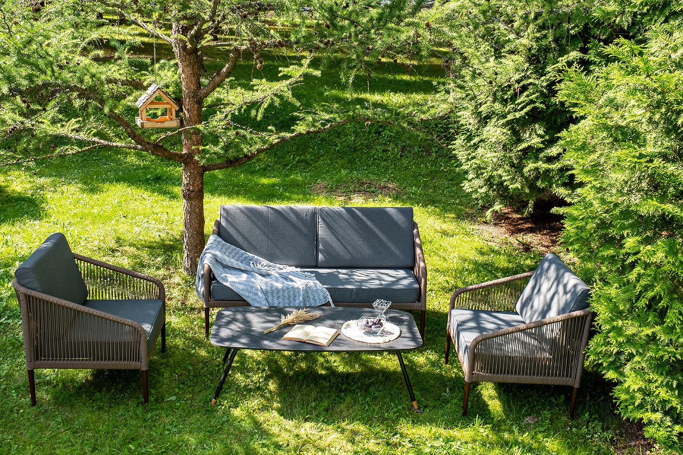 Лаунж-зона «Канны» предназначена для размещения четырех персон. Она включает в себя: - журнальный стол (размер – 1200×650×400 мм). - два плетеных кресла (размер – 700×700×750 мм). - двухместный диван (размер – 1470×715×750 мм). Каркас уличной мебели выполнен из прочного алюминия. Его дополняет коричневая оплетка, изготовленная на основе эластичных синтетических лент из полиэфирных волокон высокой прочности. Кресла и диван идут в комплекте с мягкими подушками в чехлах темно-серого цвета. "Канны" диван 2-местный плетеный из роупа, каркас алюминий коричневый (RAL8016) муар, роуп коричневый круглый, ткань темно-серая 027 1шт. 1 500Х700Х750, "Канны" кресло плетеное из роупа, каркас алюминий коричневый (RAL8016) муар, роуп коричневый круглый, ткань темно-серая 027 2шт. 700Х700Х750, "Верона" журнальный стол из HPL 120х65, H40, каркас черный муар, цвет столешницы "серый гранит" 1шт. 1 200Х650Х400,