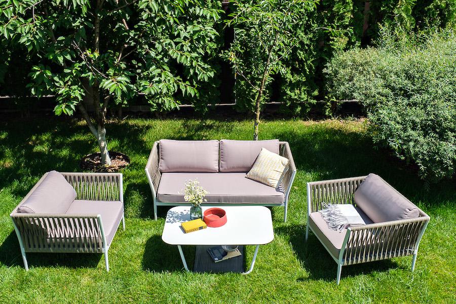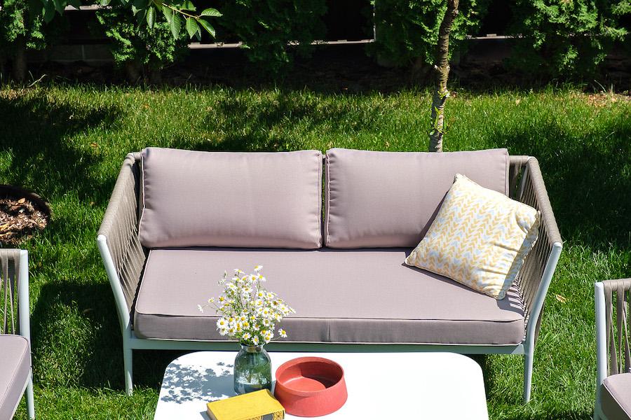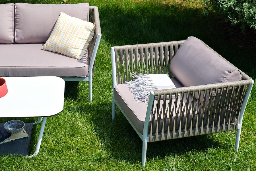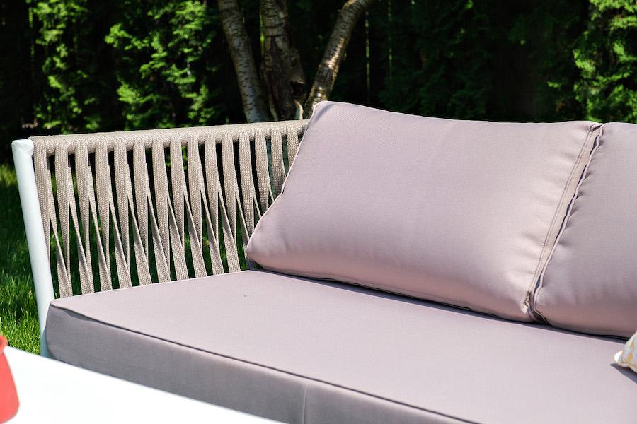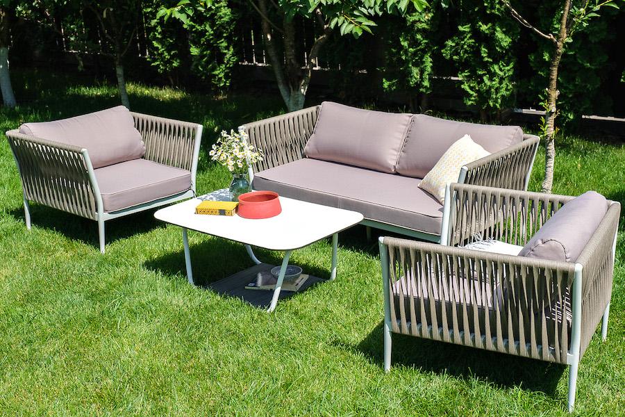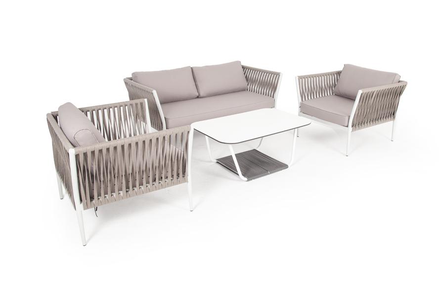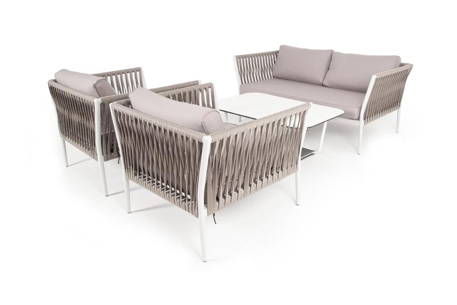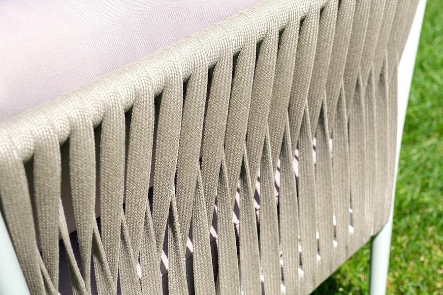 Лаунж-зона «Касабланка» расчитана на размещение 4-х персон. Состоит из: - двухместного дивана - 1600x800х695 мм. - двух кресел - 900×800×695 мм каждое. - журнального столика - 900х600х420 мм. Диван и кресла изготовлены их алюминиевого прочного каркаса, оплетенного ручным способом роупом серо-коричневого цвета. Это эластичные ленты из полиэфирных волокон высокого качества. Каркас окрашен в светло-серый (RAL7035) цвет износостойкой порошковой краской. Журнальный столик также имеет алюминиевый ка "Касабланка" кресло плетеное из роупа, каркас алюминий светло-серый (RAL7035) муар, роуп серо-коричневый 23мм, ткань бежевая 15052 2шт. 900Х800Х695, "Гранада" журнальный стол 90х60см из HPL, цвет "молочный", каркас белый муар, роуп темно-серый круглый 1шт. 900Х600Х420, "Касабланка" диван 2-местный плетеный из роупа, каркас алюминий светло-серый (RAL7035) муар, роуп серо-коричневый 23мм, ткань бежевая 15052 1шт. 1 600Х800Х695,
