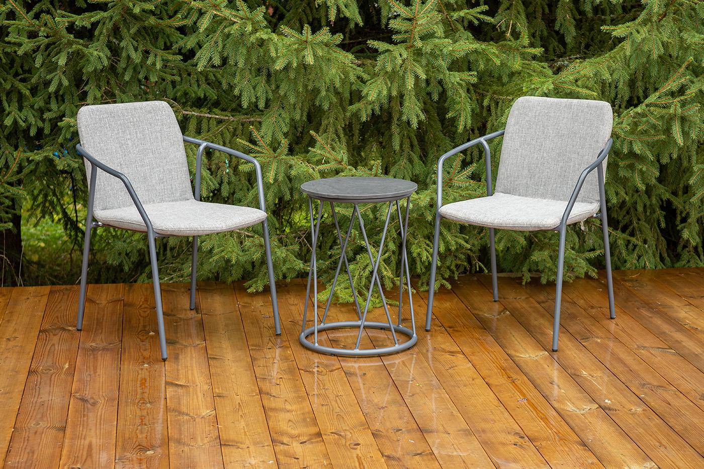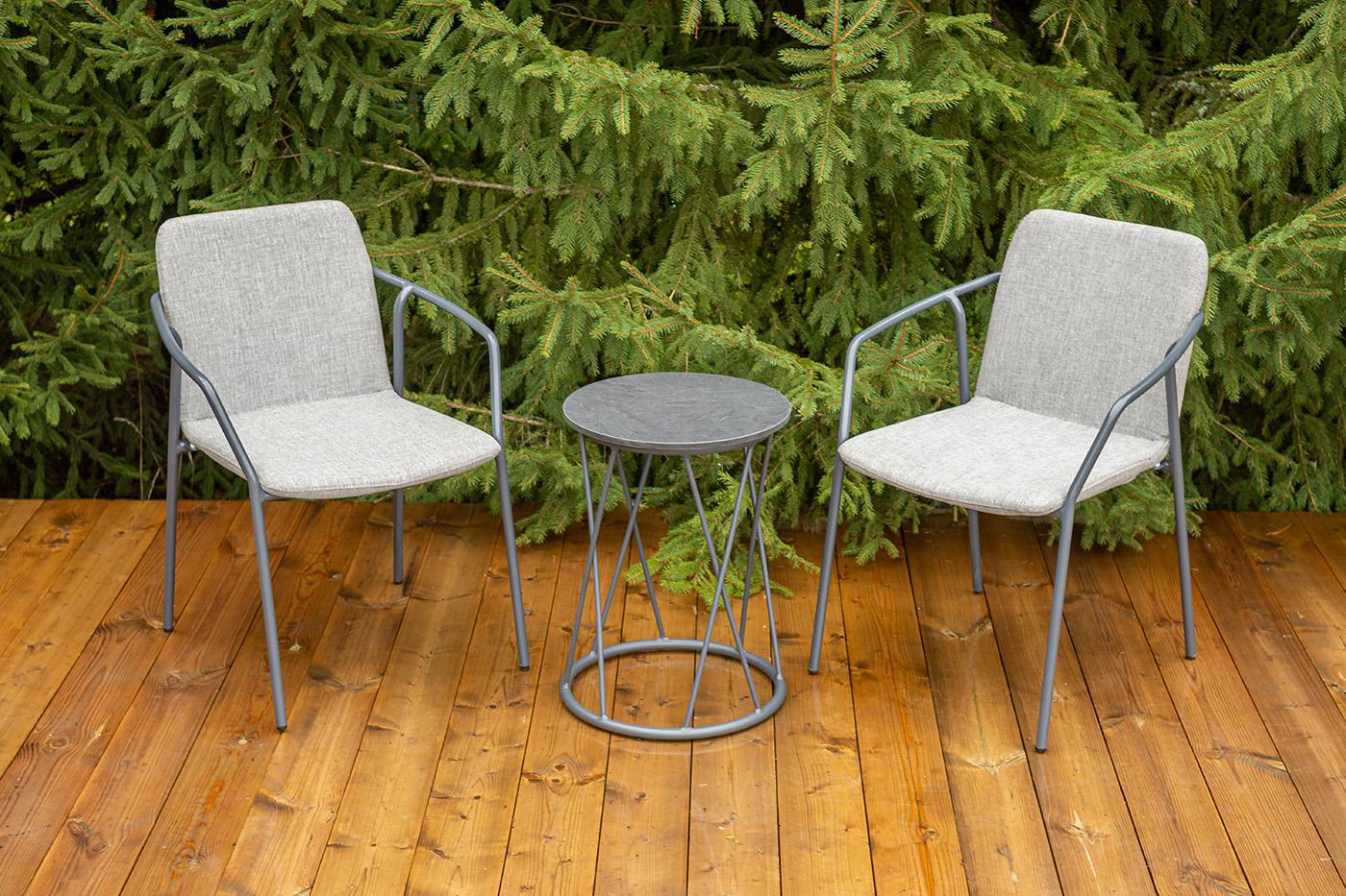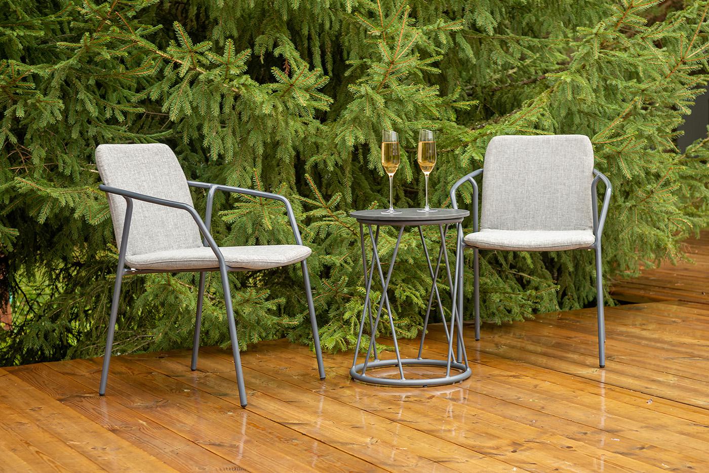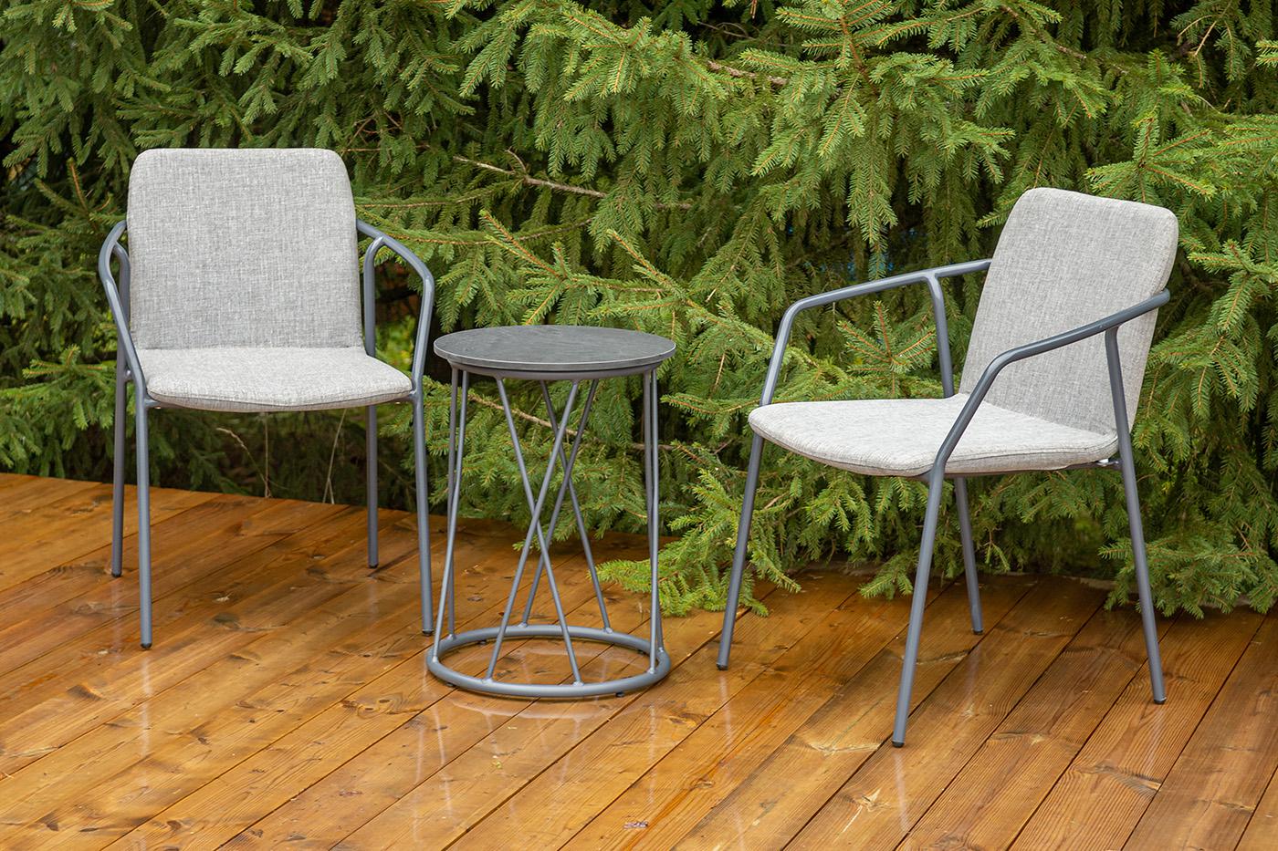 Кофейный комплект «Марокко» на две персоны — компактное и стильное решение для балкона, небольшой гостиной, террасы или другого пространства с ограниченной площадью. В комплект входят два стула «Марокко» (575×600×800 мм) из текстилена Nanotex с алюминиевым каркасом в темно‑сером цвете (RAL7024) и круглый журнальный столик «Колумбия» (400×400×550 мм) с алюминиевым каркасом и столешницей из монолитного компакт‑пластика HPL (12 мм) в оттенке «серый гранит». Мебель отличается прочностью, легкост "Марокко" стул из текстилена nanotex, каркас алюминий темно-серый (RAL7024), цвет серый 2шт. 575Х600Х800, "Колумбия" журнальный стол из HPL круглый Ø40 H55, каркас из алюминия темно-серый (RAL 7024), цвет столешницы "серый гранит" 1шт. 400Х400Х550,