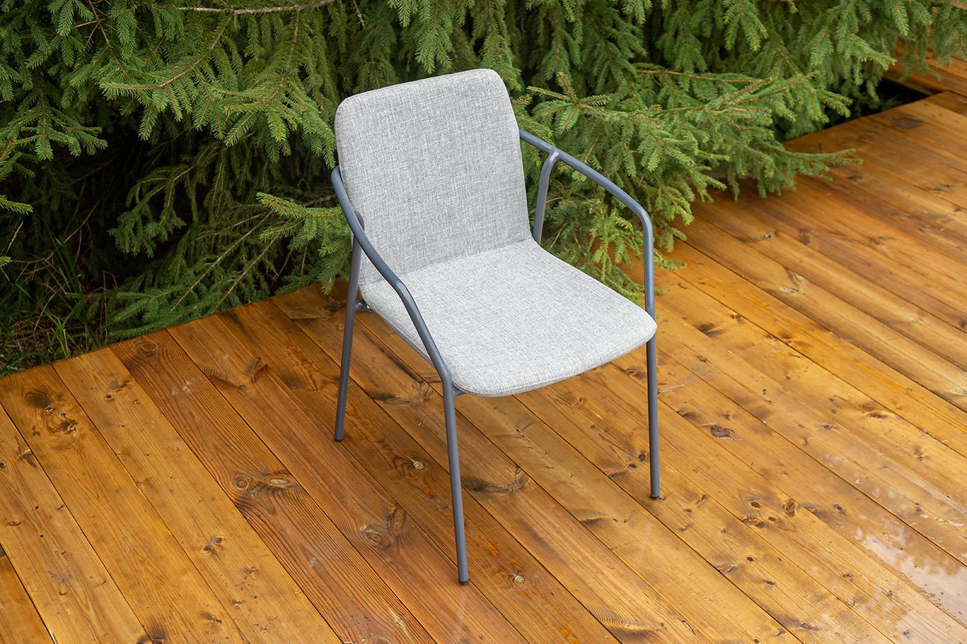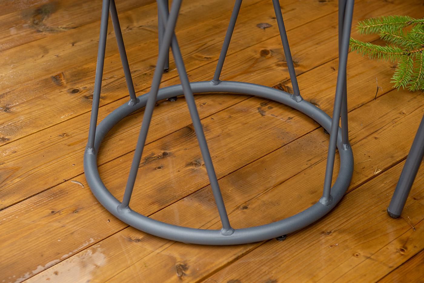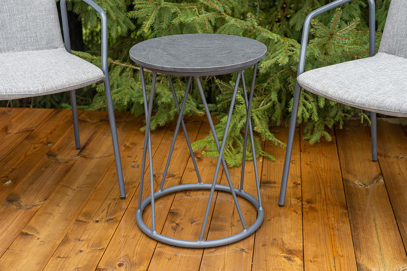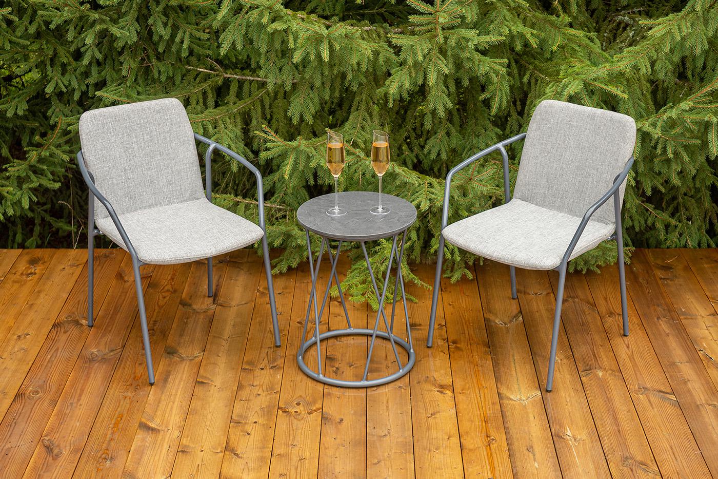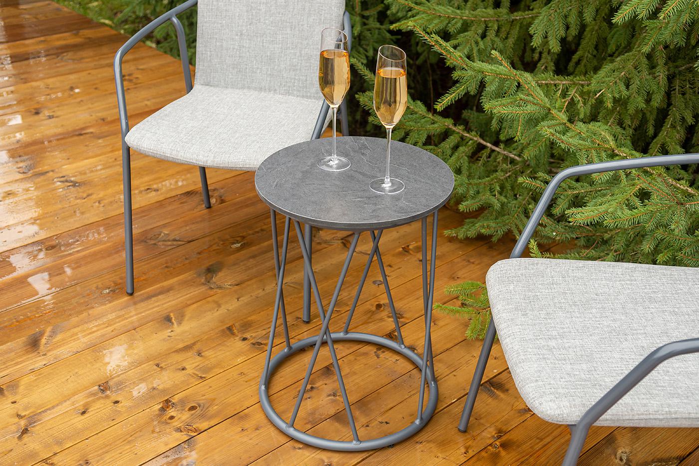 Кофейный комплект «Марокко» на две персоны — компактное и стильное решение для балкона, небольшой гостиной, террасы или другого пространства с ограниченной площадью. В комплект входят два стула «Марокко» (575×600×800 мм) из текстилена Nanotex с алюминиевым каркасом в темно‑сером цвете (RAL7024) и круглый журнальный столик «Колумбия» (400×400×550 мм) с алюминиевым каркасом и столешницей из монолитного компакт‑пластика HPL (12 мм) в оттенке «серый гранит». Мебель отличается прочностью, легкост "Марокко" стул из текстилена nanotex, каркас алюминий темно-серый (RAL7024), цвет серый 2шт. 575Х600Х800, "Колумбия" журнальный стол из HPL круглый Ø40 H55, каркас из алюминия темно-серый (RAL 7024), цвет столешницы "серый гранит" 1шт. 400Х400Х550,