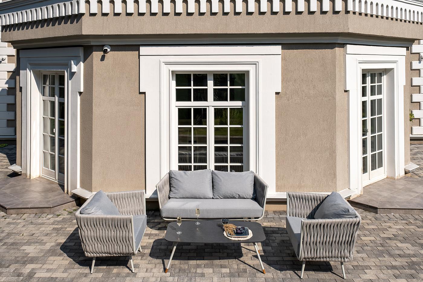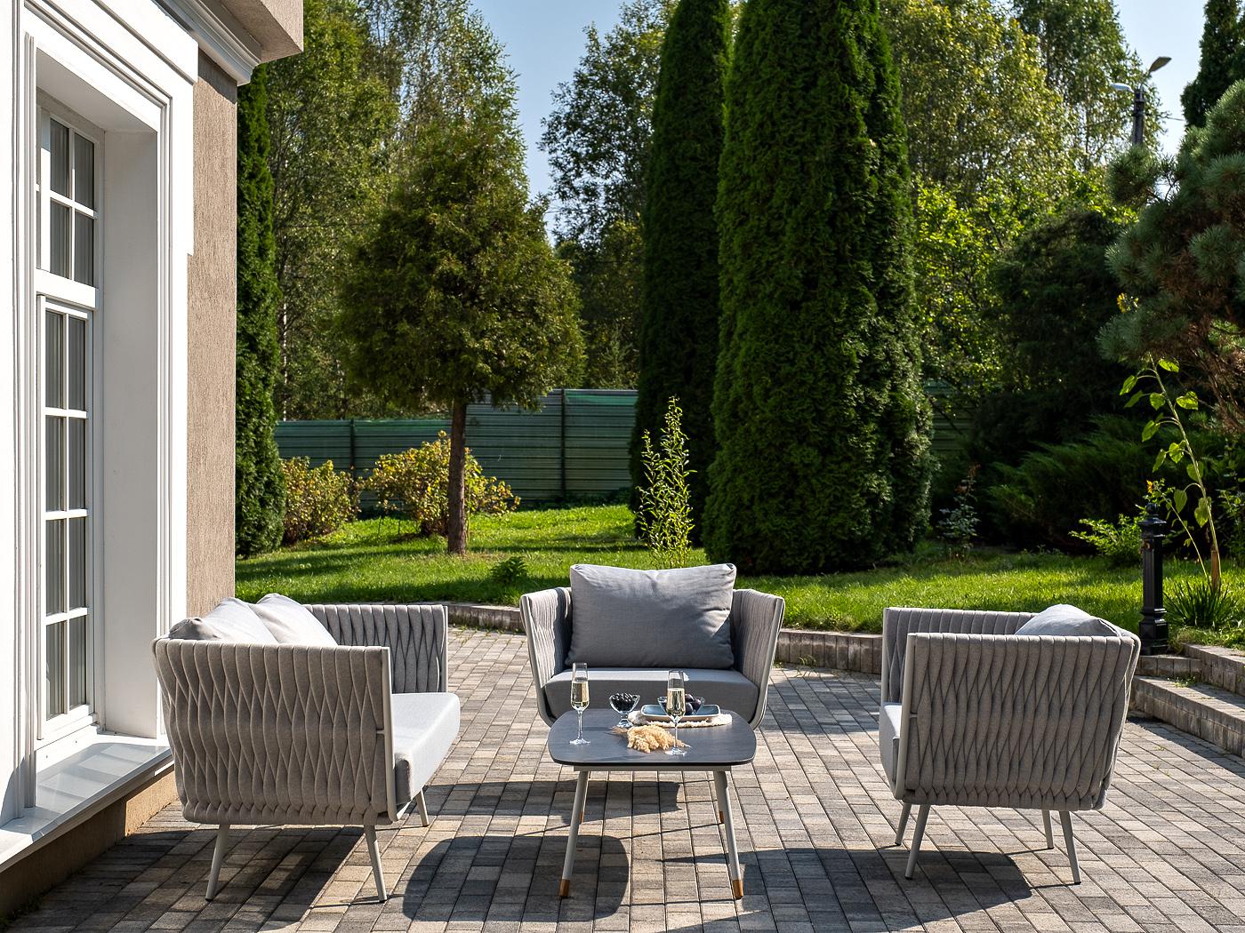 Лаунж-зона «Монако» предназначена для размещения четырех персон. Она включает в себя: - журнальный столик (размер – 1200×650×400 мм). - два плетеных кресла (размер – 980×700×750 мм). - двухместный диван (размер – 1600×700×750 мм). Каркас уличной мебели выполнен из алюминия. Его дополняет светло-серая оплетка, изготовленная на основе эластичных синтетических лент из полиэфирных волокон высокой прочности. Кресла и диван идут в комплекте с мягкими подушками в чехлах светло-серого цвета. "Монако" диван 2-местный плетеный из роупа, каркас алюминий светло-серый (RAL7035) муар, роуп светло-серый 40 мм, ткань светло-серая 1шт. 1 600Х700Х750, "Монако" кресло плетеное из роупа, каркас алюминий светло-серый (RAL7035) муар, роуп светло-серый 40 мм, ткань светло-серая 2шт. 980Х700Х750, "Верона" журнальный стол из HPL 120х65, H40, каркас светло-серый (RA L7035) муар, цвет столешницы "серый гранит" 1шт. 1 200Х650Х400,