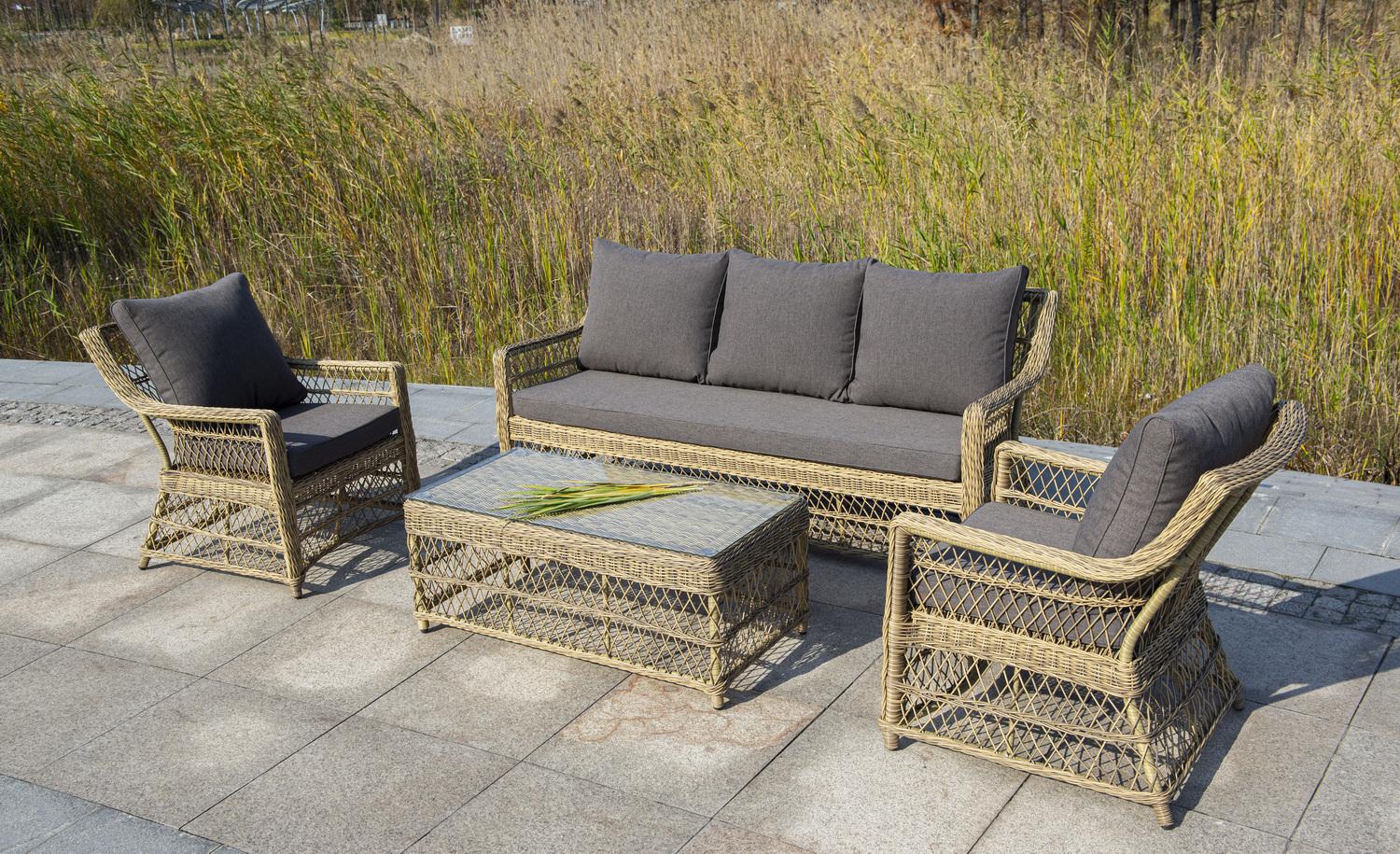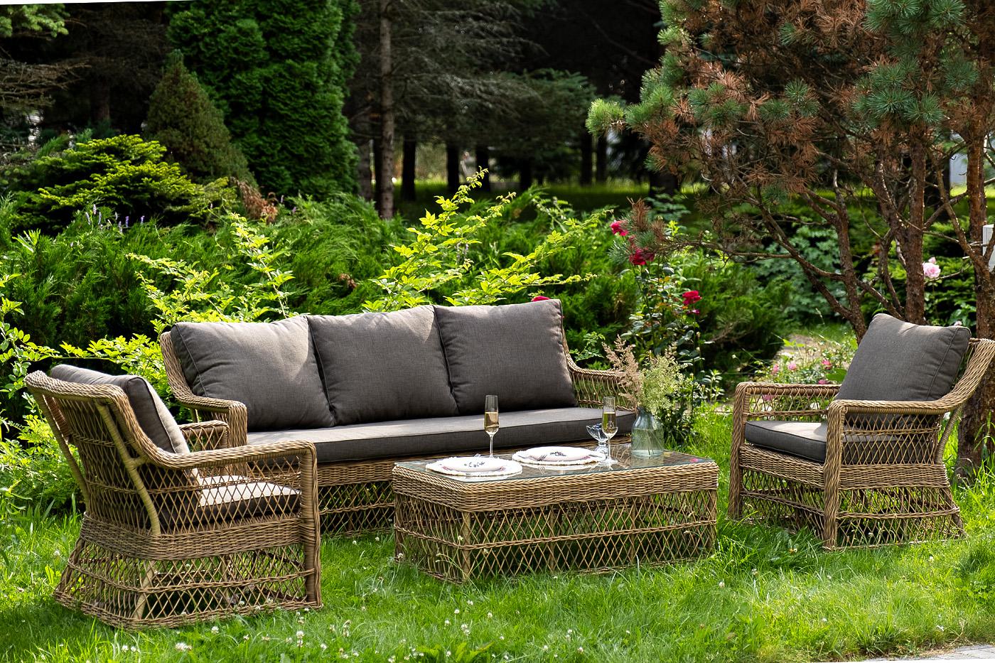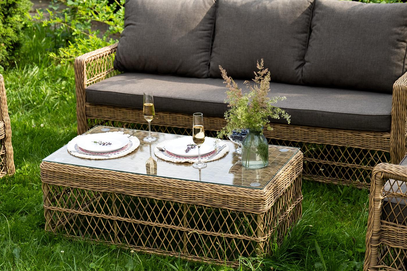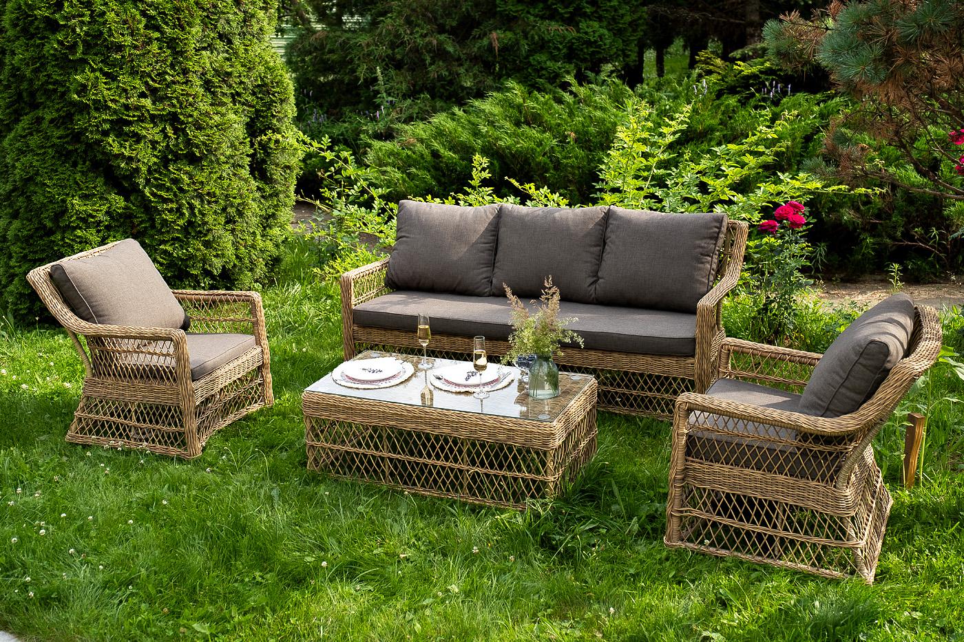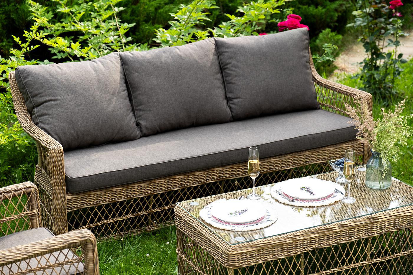 Лаунж-зона «Гранд Латте» включает в себя все необходимое для полноценного отдыха и рассчитана на одновременное размещение пяти персон. Плетеный комплект состоит из: - трехместного дивана, размер – 1875×830×850 мм. - двух кресел, размер – 720×830×850 мм. - журнального столика, размер – 1120×570×450 мм. Уличная мебель имеет алюминиевый каркас. В качестве декоративного элемента предлагается ручное плетение, сделанное из соломенного искусственного ротанга. Предусмотрены мягкие подушки из "Гранд Латте" диван трехместный из искусственного ротанга, цвет соломенный 1шт. 1 875Х830Х850, "Гранд Латте" кресло из искусственного ротанга, цвет соломенный 2шт. 720Х830Х850, "Гранд Латте" стол журнальный из искусственного ротанга, цвет соломенный 1шт. 1 120Х570Х450,