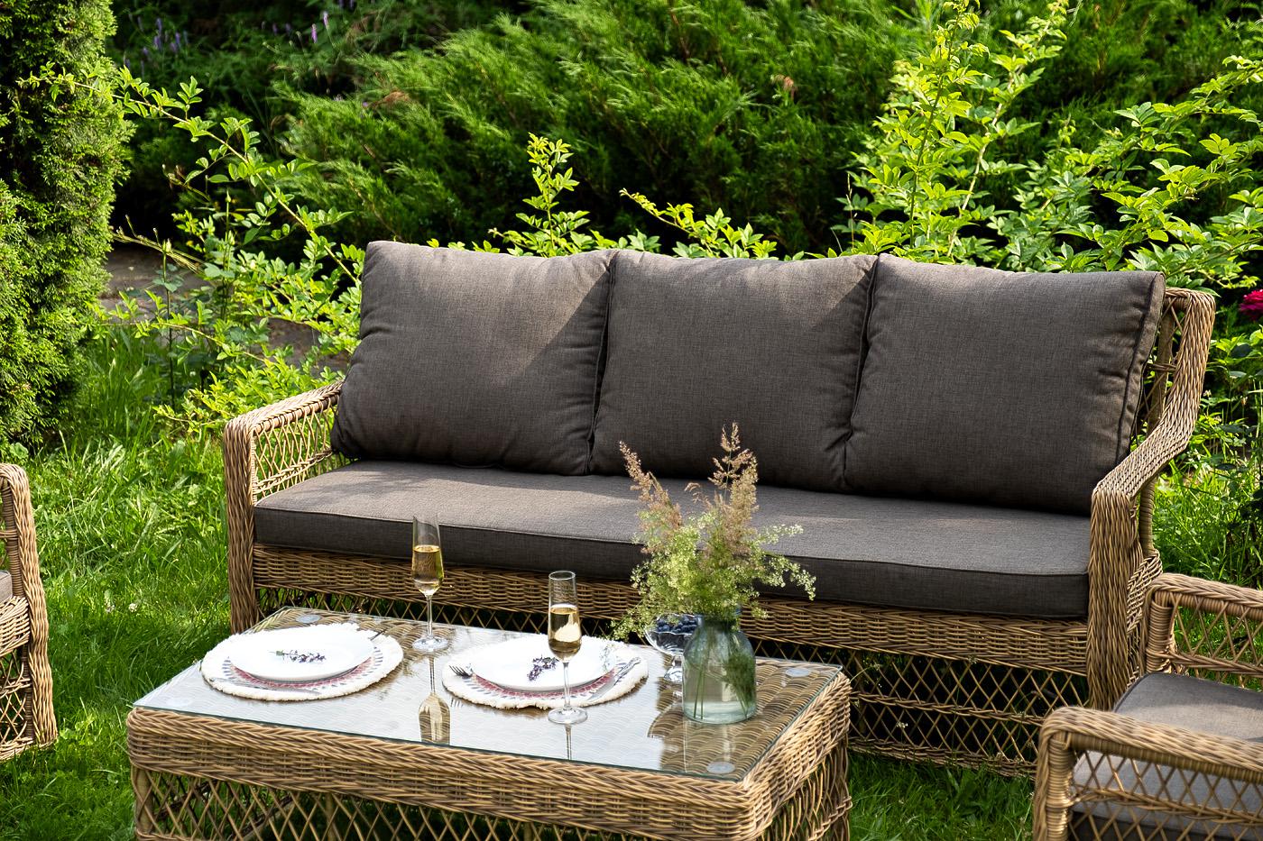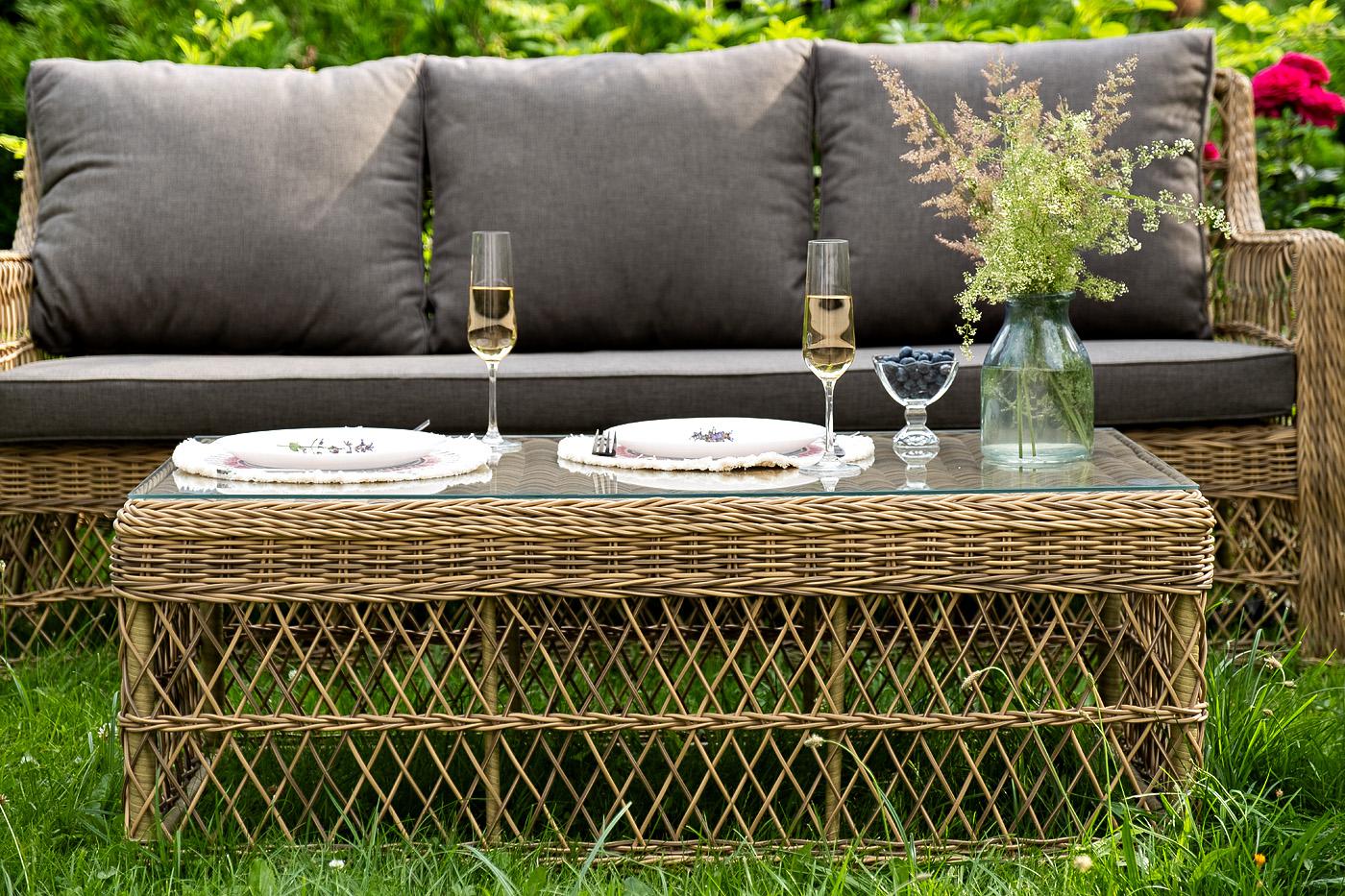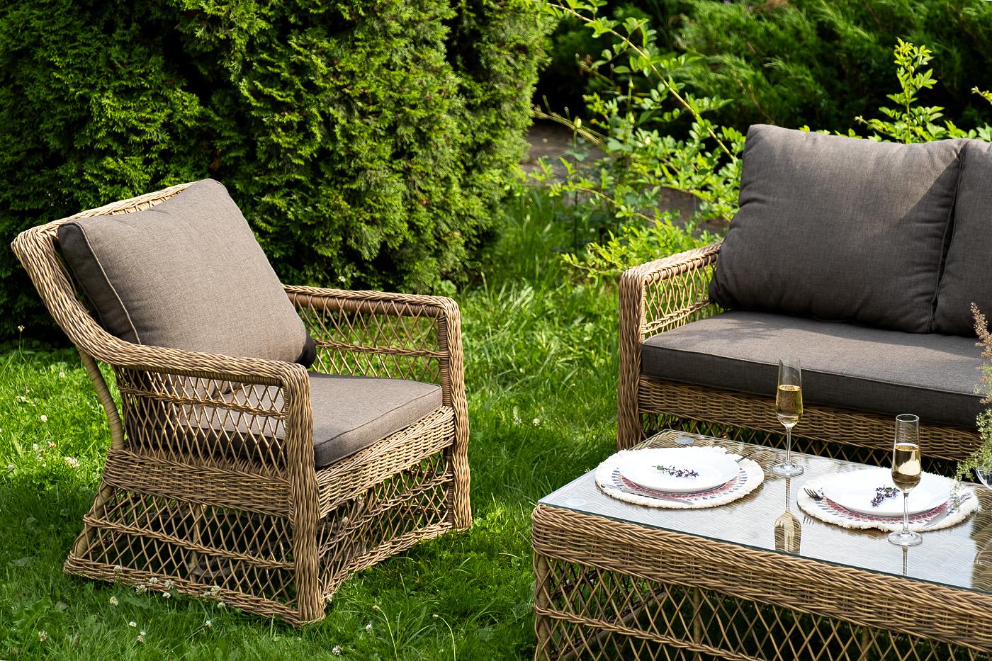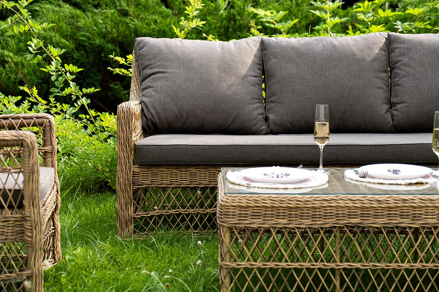 Лаунж-зона «Гранд Латте» включает в себя все необходимое для полноценного отдыха и рассчитана на одновременное размещение пяти персон. Плетеный комплект состоит из: - трехместного дивана, размер – 1875×830×850 мм. - двух кресел, размер – 720×830×850 мм. - журнального столика, размер – 1120×570×450 мм. Уличная мебель имеет алюминиевый каркас. В качестве декоративного элемента предлагается ручное плетение, сделанное из соломенного искусственного ротанга. Предусмотрены мягкие подушки из "Гранд Латте" диван трехместный из искусственного ротанга, цвет соломенный 1шт. 1 875Х830Х850, "Гранд Латте" кресло из искусственного ротанга, цвет соломенный 2шт. 720Х830Х850, "Гранд Латте" стол журнальный из искусственного ротанга, цвет соломенный 1шт. 1 120Х570Х450,