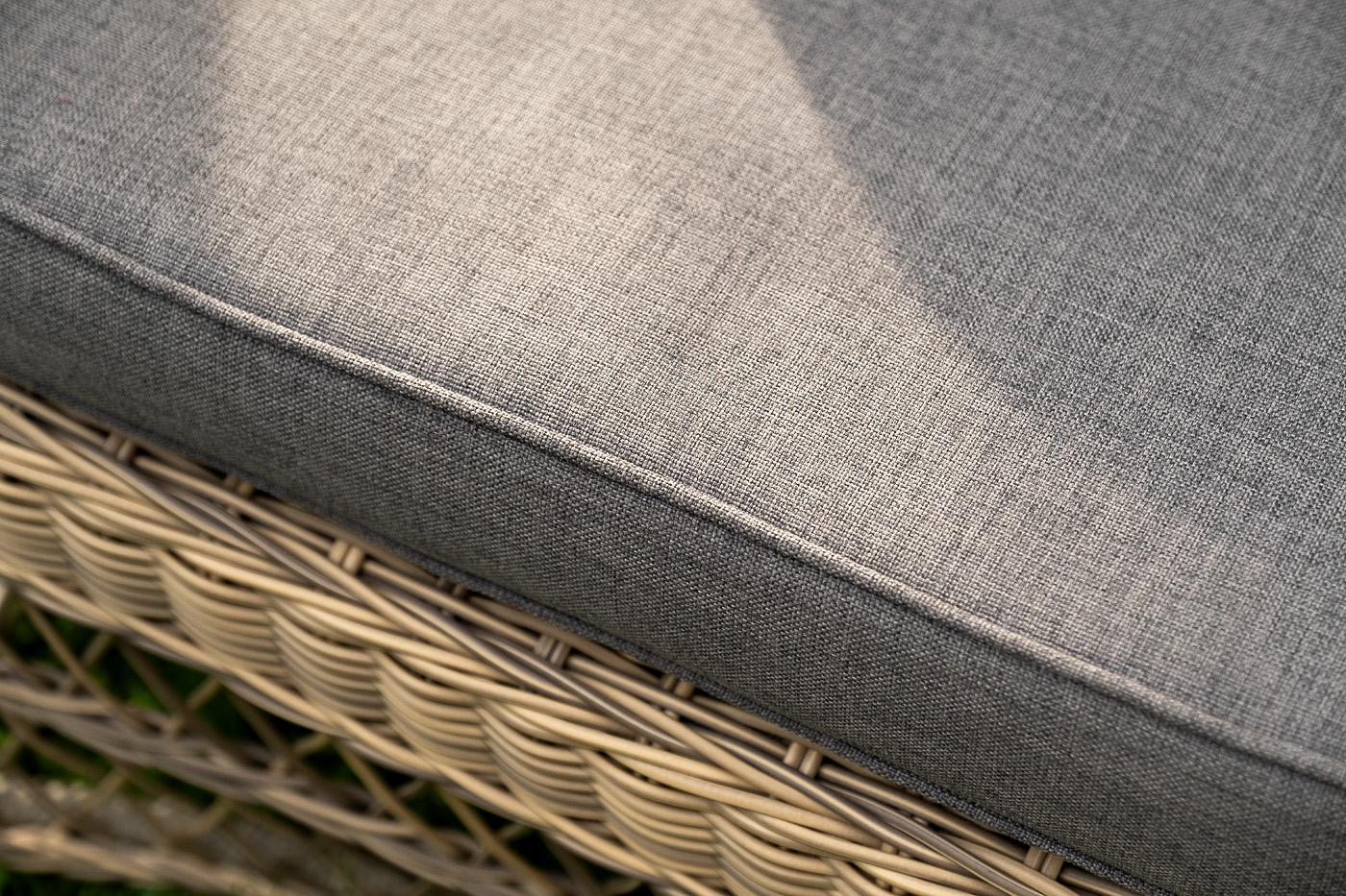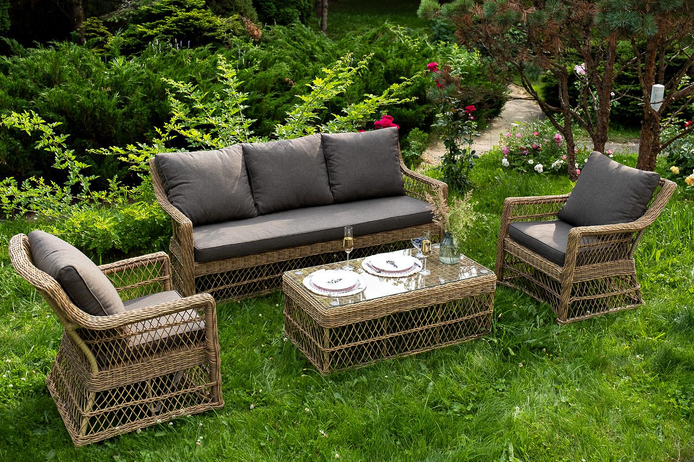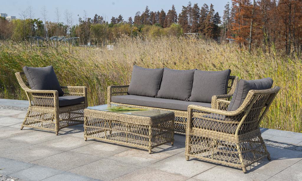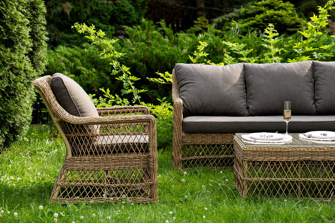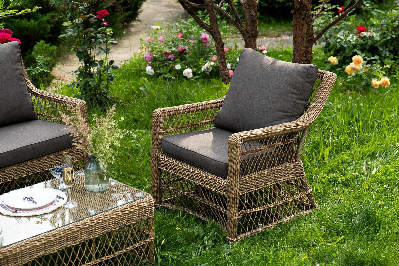 Лаунж-зона «Гранд Латте» включает в себя все необходимое для полноценного отдыха и рассчитана на одновременное размещение пяти персон. Плетеный комплект состоит из: - трехместного дивана, размер – 1875×830×850 мм. - двух кресел, размер – 720×830×850 мм. - журнального столика, размер – 1120×570×450 мм. Уличная мебель имеет алюминиевый каркас. В качестве декоративного элемента предлагается ручное плетение, сделанное из соломенного искусственного ротанга. Предусмотрены мягкие подушки из "Гранд Латте" диван трехместный из искусственного ротанга, цвет соломенный 1шт. 1 875Х830Х850, "Гранд Латте" кресло из искусственного ротанга, цвет соломенный 2шт. 720Х830Х850, "Гранд Латте" стол журнальный из искусственного ротанга, цвет соломенный 1шт. 1 120Х570Х450,