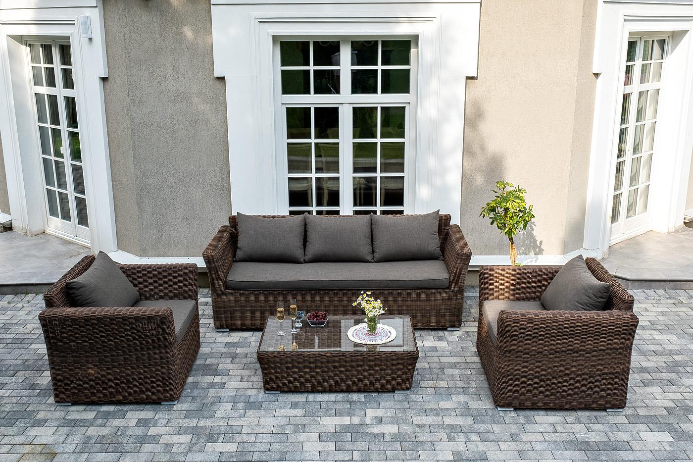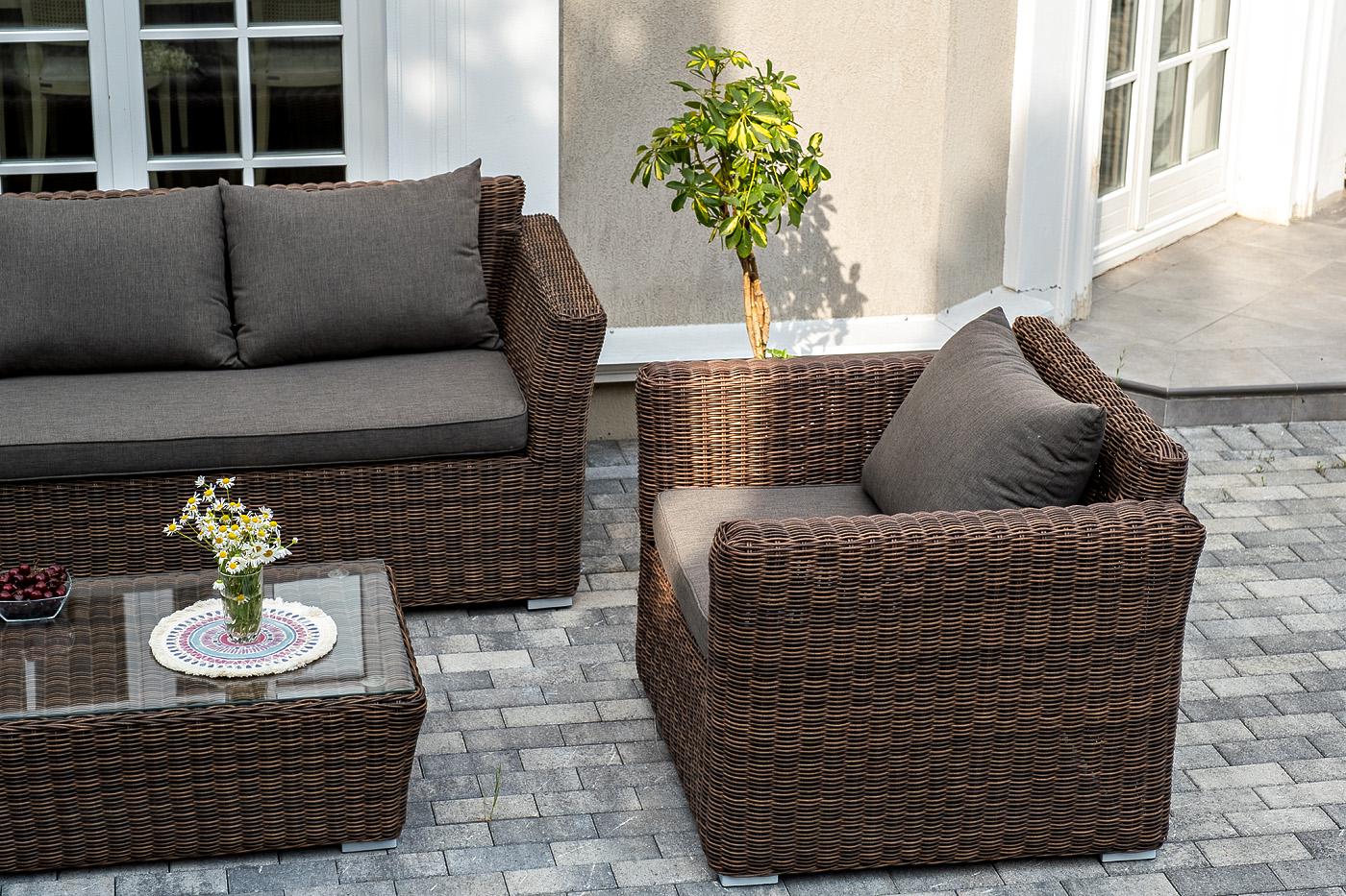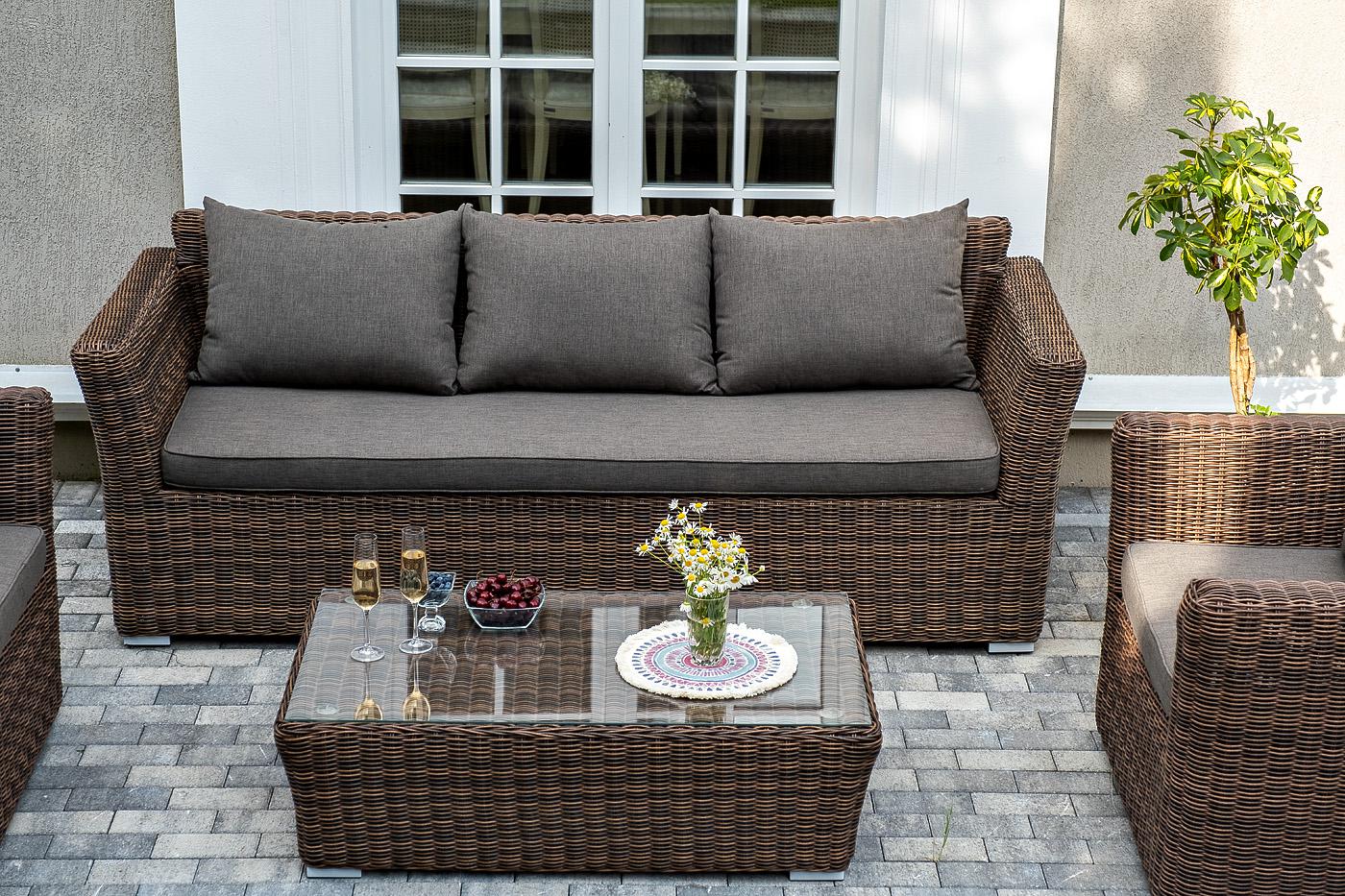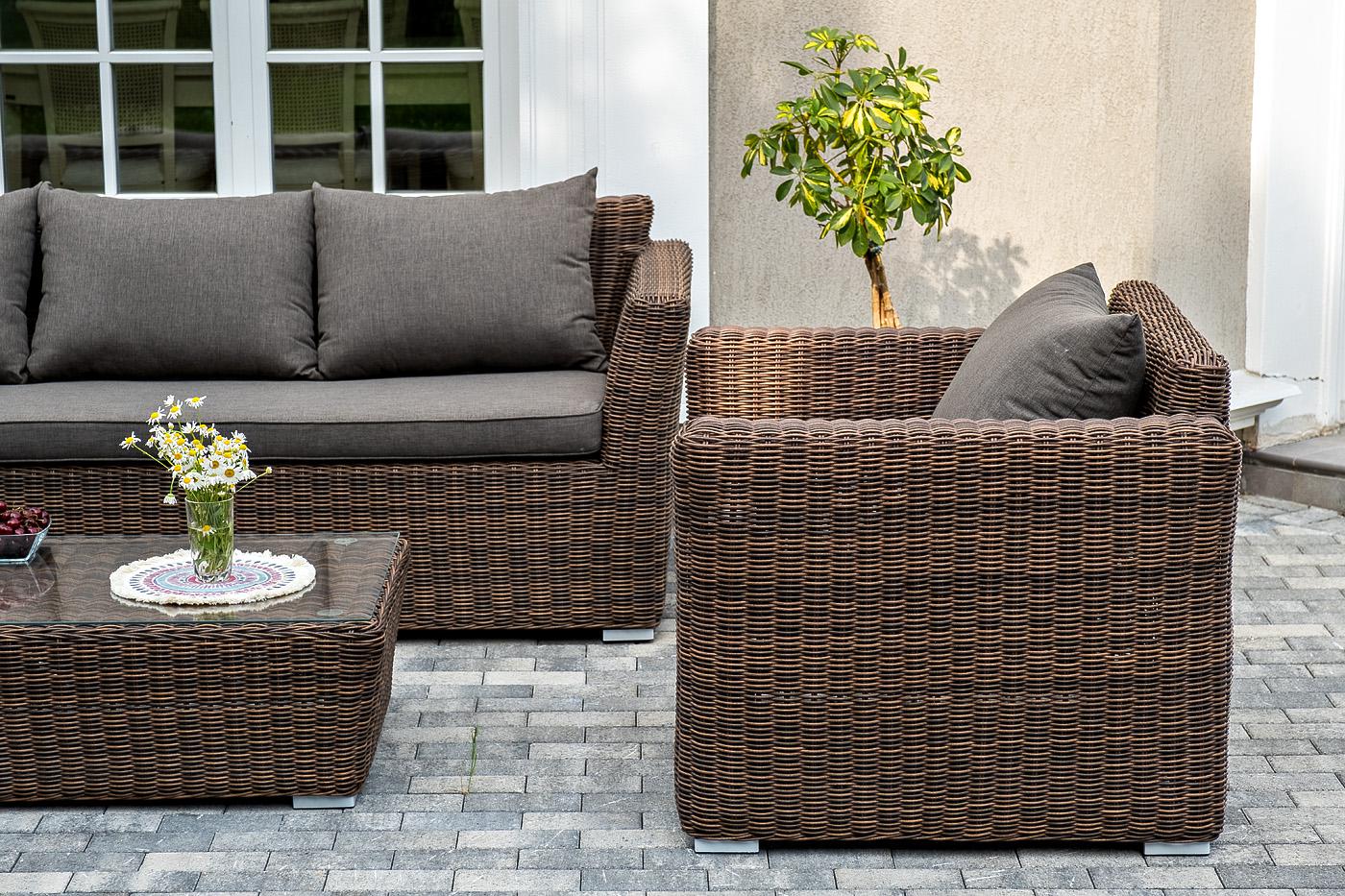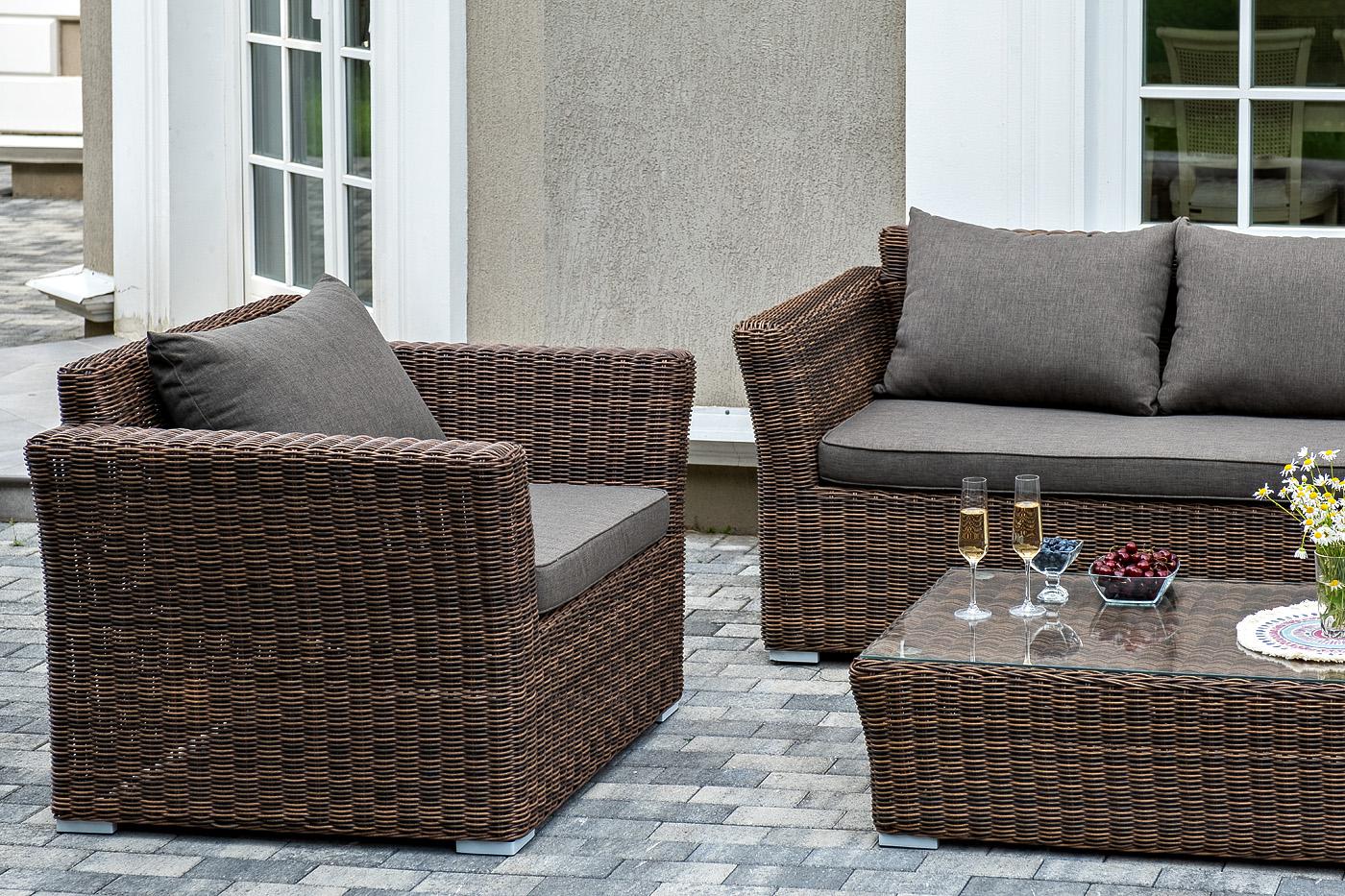 Лаунж-зона «Капучино» – практичная мебель для обустройства открытой веранды или беседки. В ее составе находятся: - два кресла – 1040×865×815 мм. - трехместный диван – 2220×865×815 мм. - журнальный столик – 1100×660×340 мм. В качестве основы применяется алюминиевый каркас. Из круглого искусственного ротанга сделана ручная оплетка. Цвет комплекта – коричневый. На креслах и диване расположились мягкие подушки, съёмные чехлы которых пошиты из полиэстера, плотностью 300гр/м2. Ткань в обяз "Капучино" кресло из искусственного ротанга, цвет коричневый 2шт. 1 040Х865Х815, "Капучино" журнальный столик из искусственного ротанга, цвет коричневый 1шт. 1 100Х660Х340, "Капучино" диван из искусственного ротанга трехместный, цвет коричневый 1шт. 2 220Х865Х815,