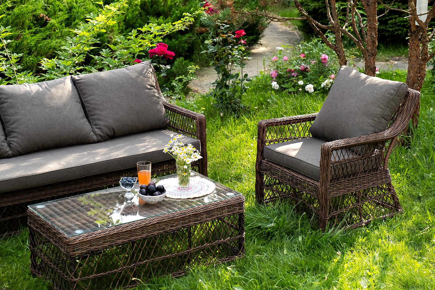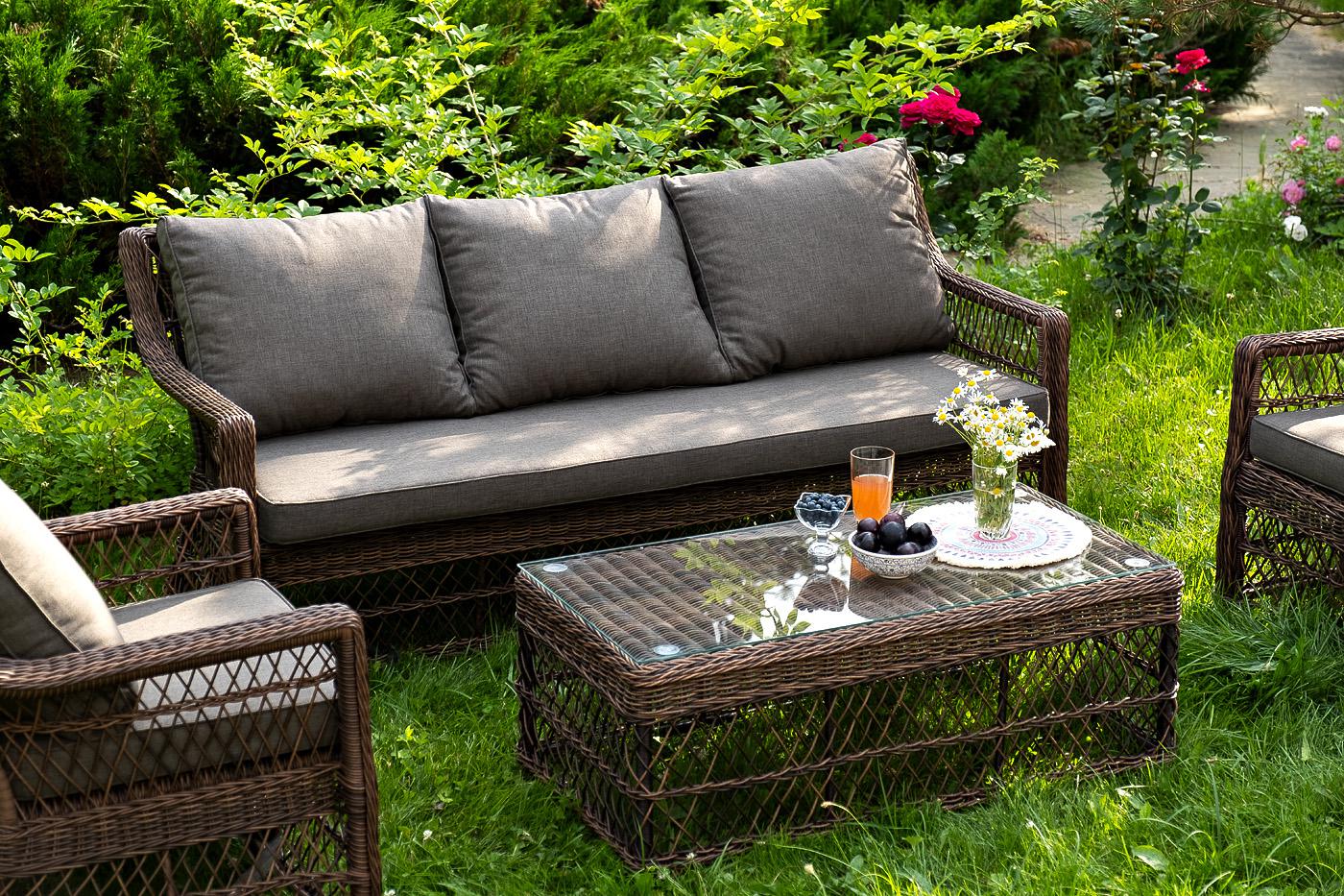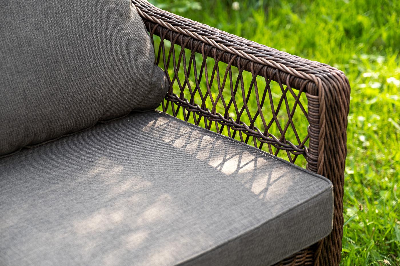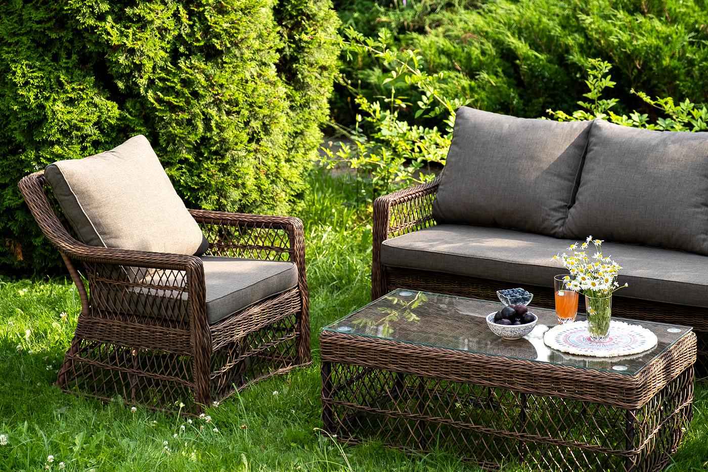 Лаунж-зона «Гранд Латте» включает в себя все необходимое для полноценного отдыха и рассчитана на одновременное размещение пяти персон. Плетеный комплект состоит из: - трехместного дивана, размер – 1875×830×850 мм. - двух кресел, размер – 720×830×850 мм. - журнального столика, размер – 1120×570×450 мм. Уличная мебель имеет алюминиевый каркас, ручное плетение, сделанное из коричневого искусственного ротанга. Предусмотрены мягкие подушки из полиэстера серого цвета с плотностью 300гр/м2. "Гранд Латте" диван трехместный из искусственного ротанга, цвет коричневый 1шт. 1 875Х830Х850, "Гранд Латте" кресло из искусственного ротанга, цвет коричневый 2шт. 720Х830Х850, "Гранд Латте" стол журнальный из искусственного ротанга, цвет коричневый 1шт. 1 120Х570Х450,