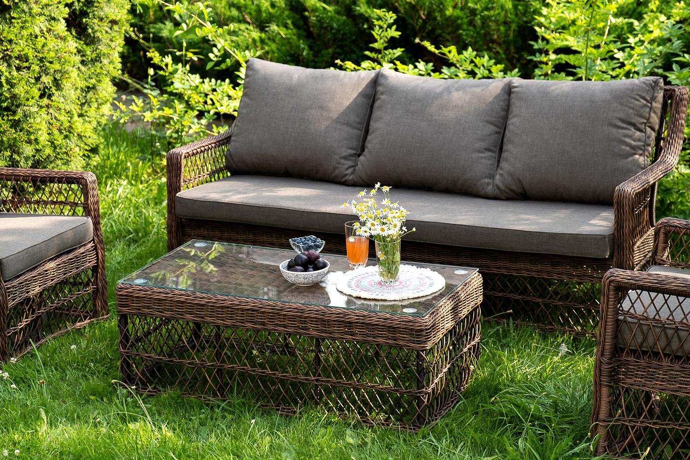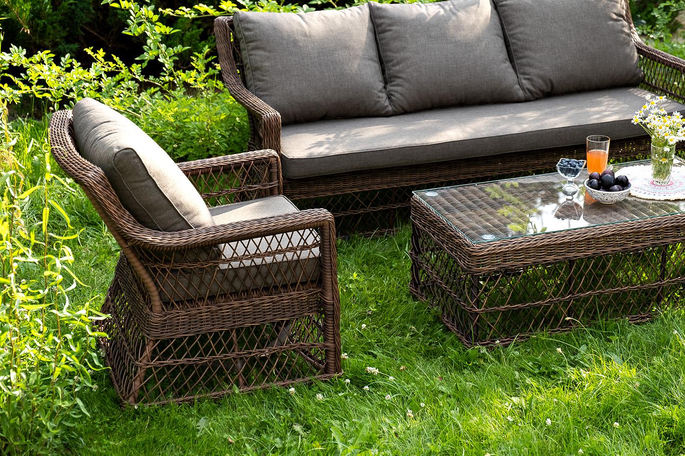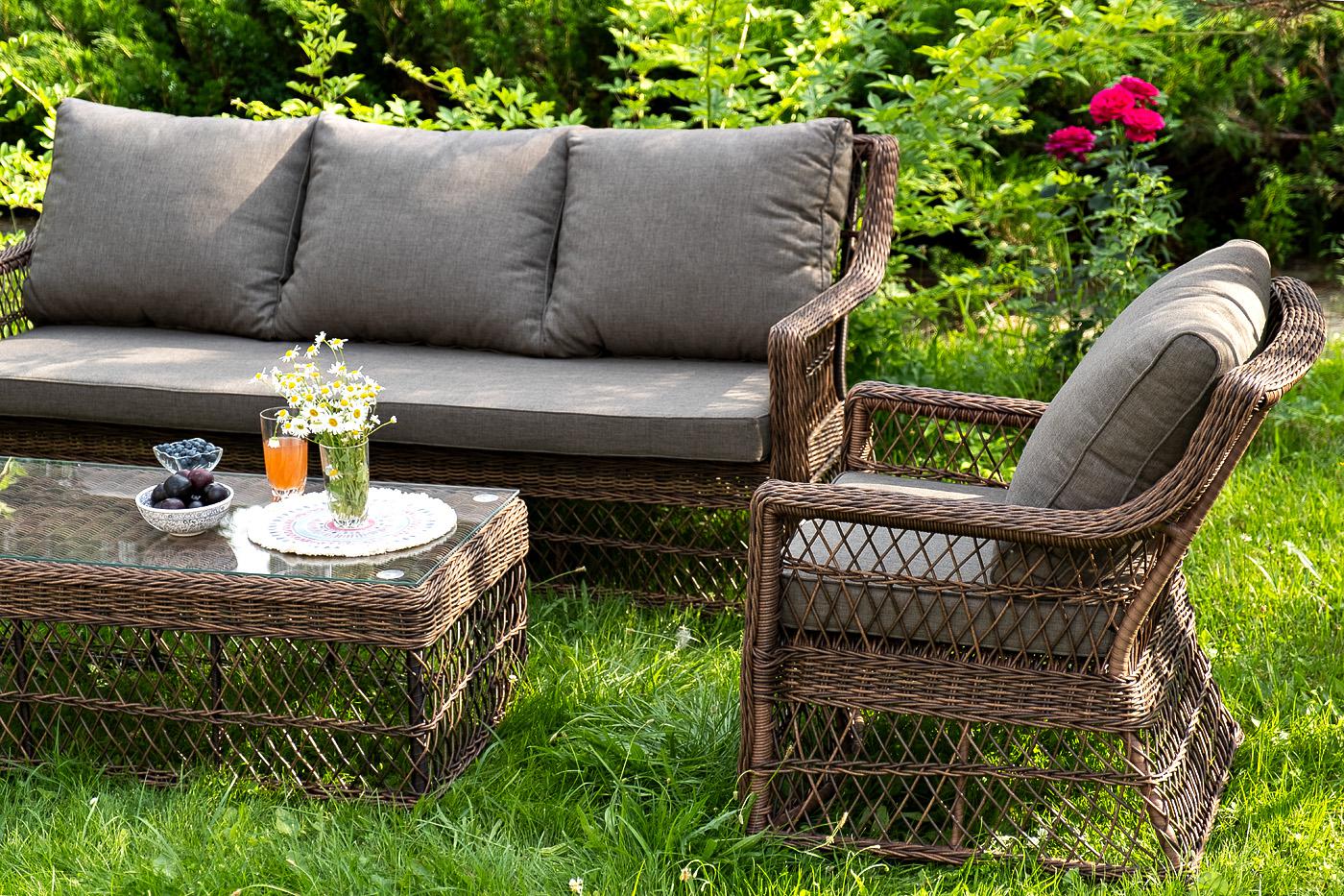 Лаунж-зона «Гранд Латте» включает в себя все необходимое для полноценного отдыха и рассчитана на одновременное размещение пяти персон. Плетеный комплект состоит из: - трехместного дивана, размер – 1875×830×850 мм. - двух кресел, размер – 720×830×850 мм. - журнального столика, размер – 1120×570×450 мм. Уличная мебель имеет алюминиевый каркас, ручное плетение, сделанное из коричневого искусственного ротанга. Предусмотрены мягкие подушки из полиэстера серого цвета с плотностью 300гр/м2. "Гранд Латте" диван трехместный из искусственного ротанга, цвет коричневый 1шт. 1 875Х830Х850, "Гранд Латте" кресло из искусственного ротанга, цвет коричневый 2шт. 720Х830Х850, "Гранд Латте" стол журнальный из искусственного ротанга, цвет коричневый 1шт. 1 120Х570Х450,