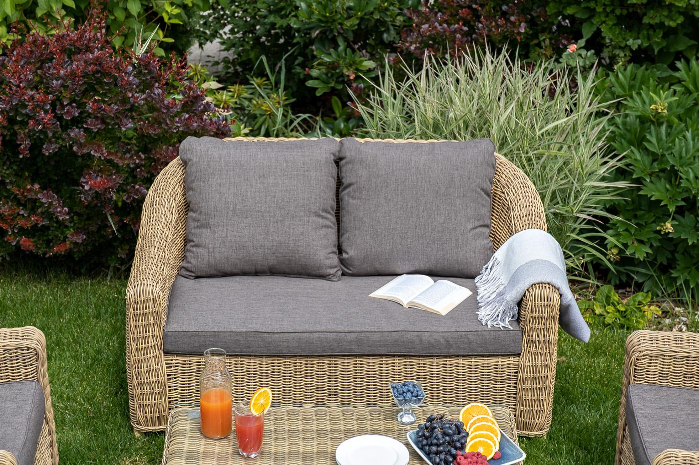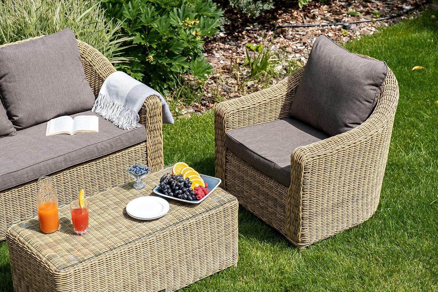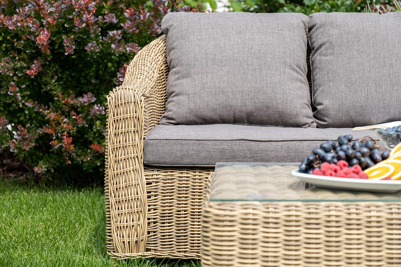 Лаунж-зона «Кон Панна» компактный комплект, рассчитанный на 4 персоны. В ее состав входят: - два плетеных кресла – 800×800×800 мм. - двухместный диван – 1370×800×800 мм. - журнальный столик – 1000×500×420 мм. В основе мебели - алюминиевый каркас и круглый искусственный ротанг. Каркас оплетен с помощью ручного метода и представлен в соломенном цвете. Диван и кресла укомплектованы подушками со съёмными чехлами из полиэстера, плотностью 300гр/м2, с влагоотталкивающей пропиткой. Журнальный столи "Кон Панна" диван из искусственного ротанга двухместный, цвет соломенный 1шт. 1 370Х800Х800, "Кон Панна" кресло из искусственного ротанга, цвет соломенный 2шт. 800Х800Х800, "Кон Панна" столик журнальный из искусственного ротанга, цвет соломенный 1шт. 1 000Х500Х420,