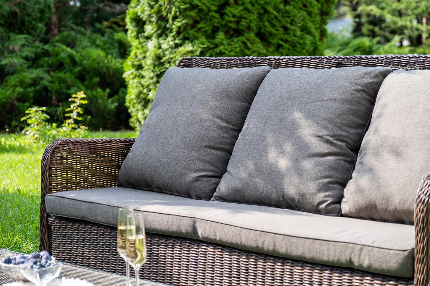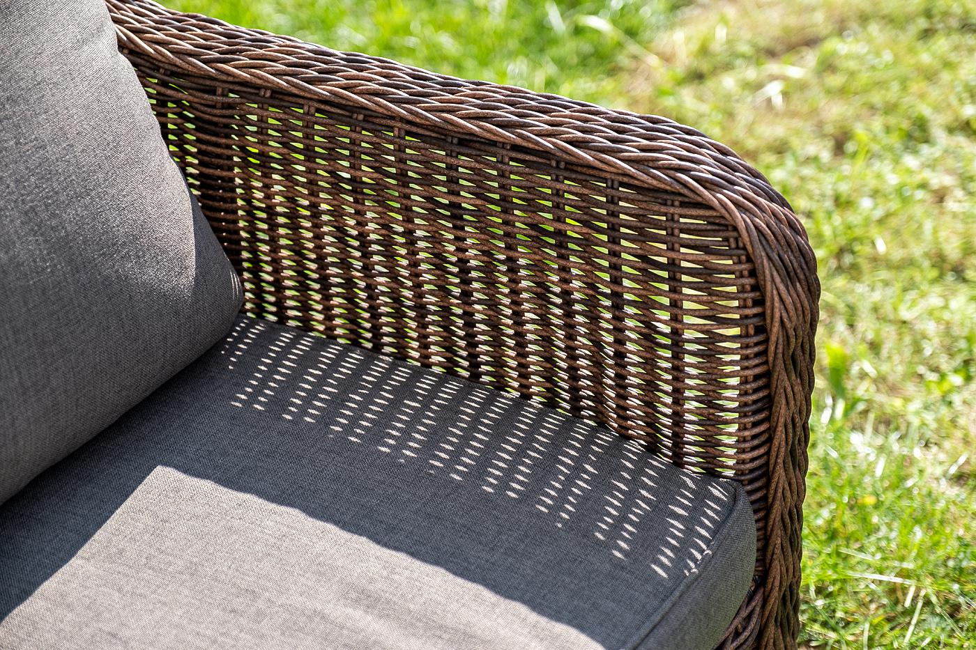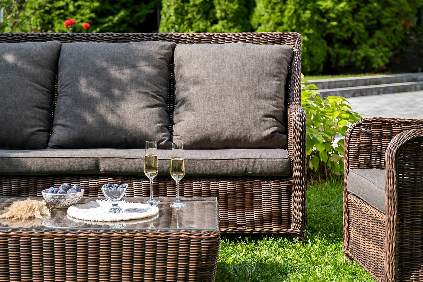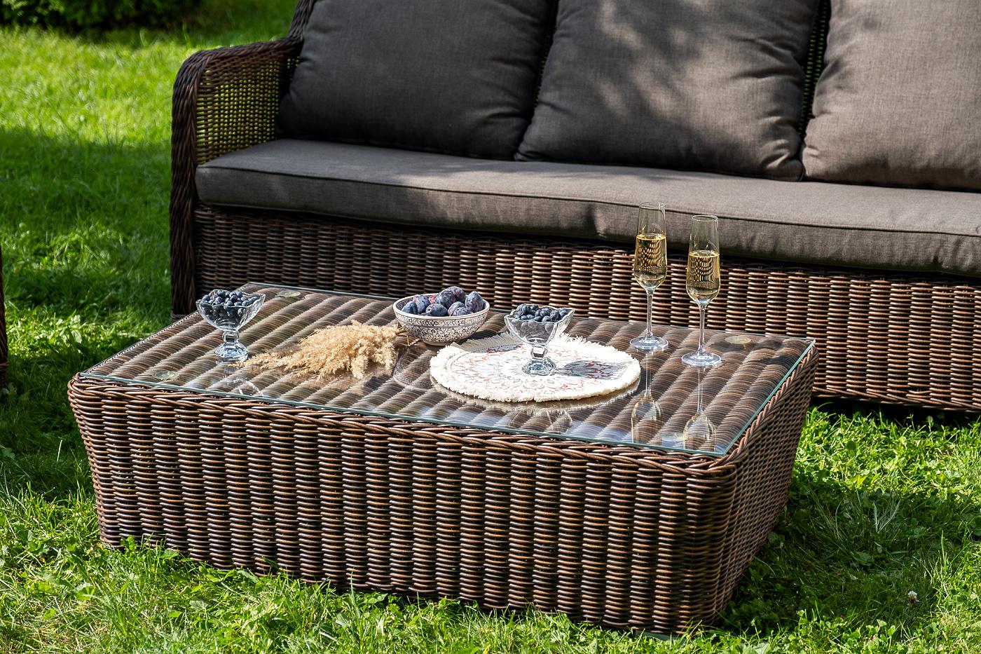 Вместительная лаунж-зона «Гляссе» состоит из: - трехместного дивана – 1900×880×990 мм. - двух кресел – 730×880×990 мм. - журнального столика – 1100×660×340 мм. Модели имеют алюминиевый каркас, который оплетен вручную искусственным ротангом натурального коричневого цвета. Плетеная мебель дополнена удобными подушками в серых чехлах. При их изготовлении используют полиэстер, плотность – 300гр/м2. Он обрабатывается влагоотталкивающей пропиткой для повышения защитных свойств материала. Журнальный "Гляссе" диван трехместный из искусственного ротанга, цвет коричневый 1шт. 1 900Х880Х990, "Гляссе" кресло плетеное из искусственого ротанга, цвет коричневый 2шт. 730Х880Х990, "Капучино" журнальный столик из искусственного ротанга, цвет коричневый 1шт. 1 100Х660Х340,