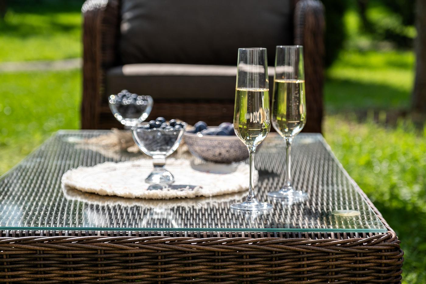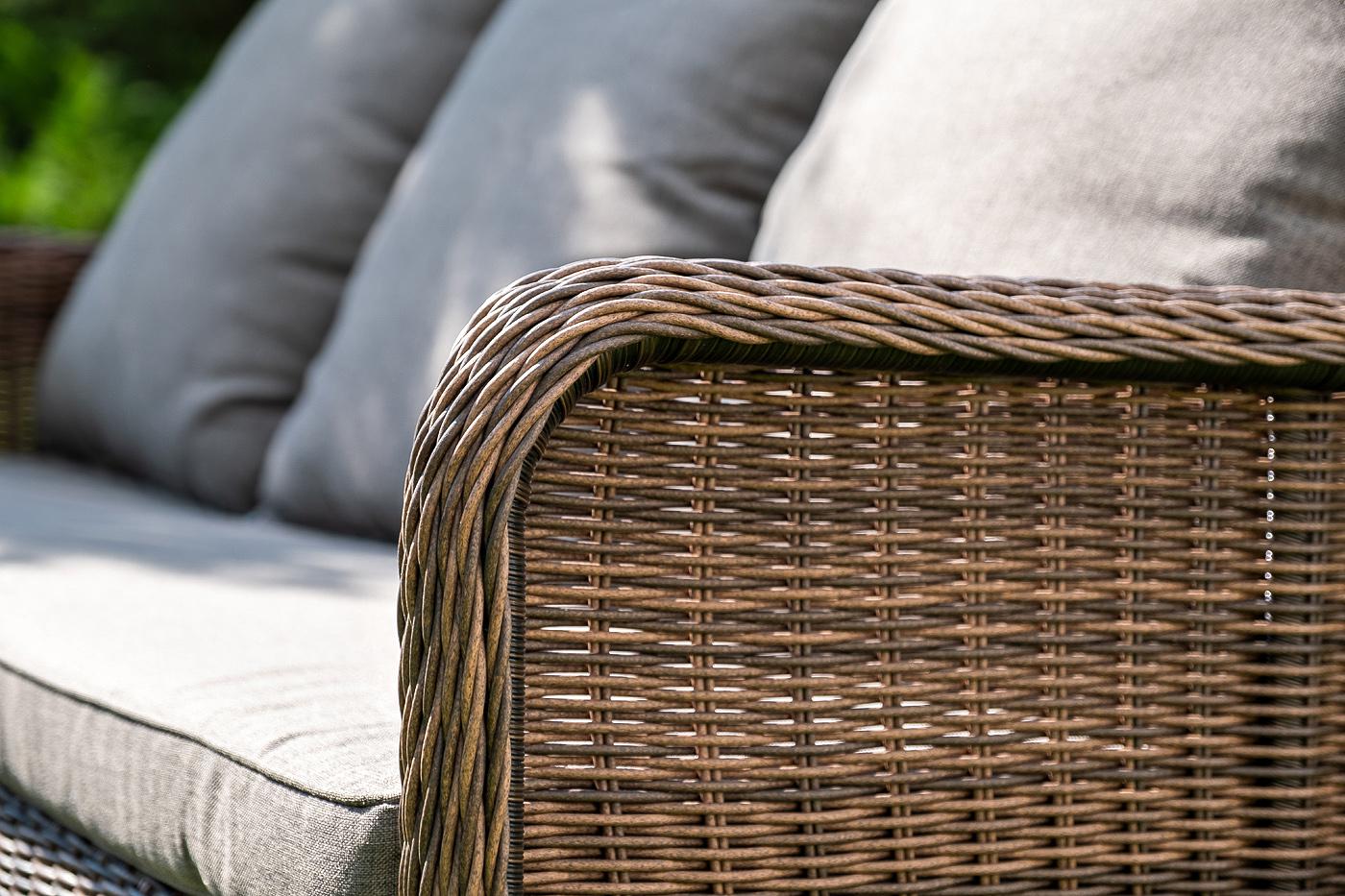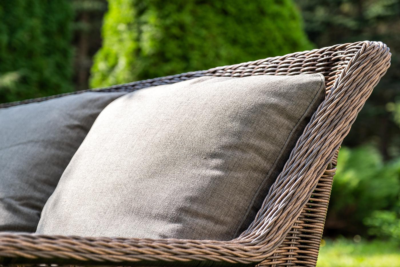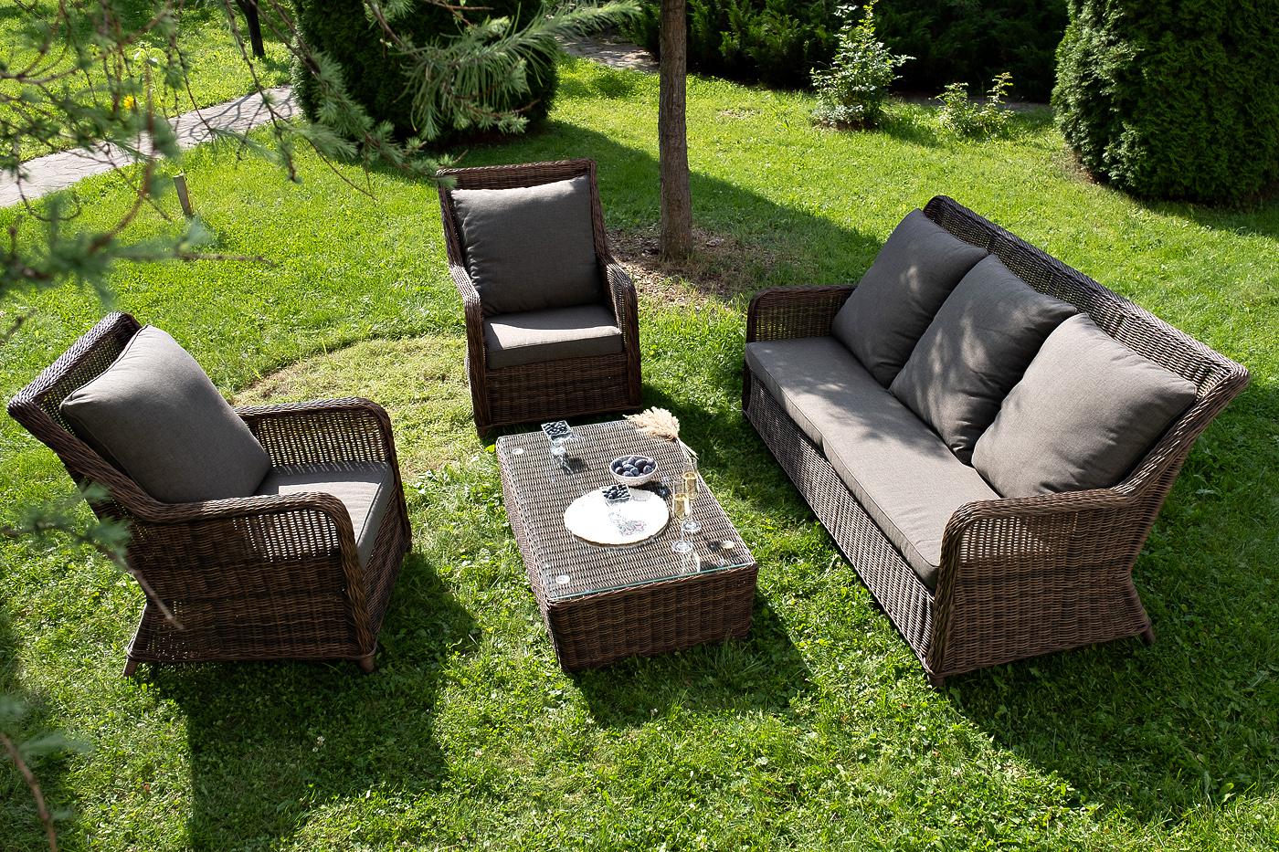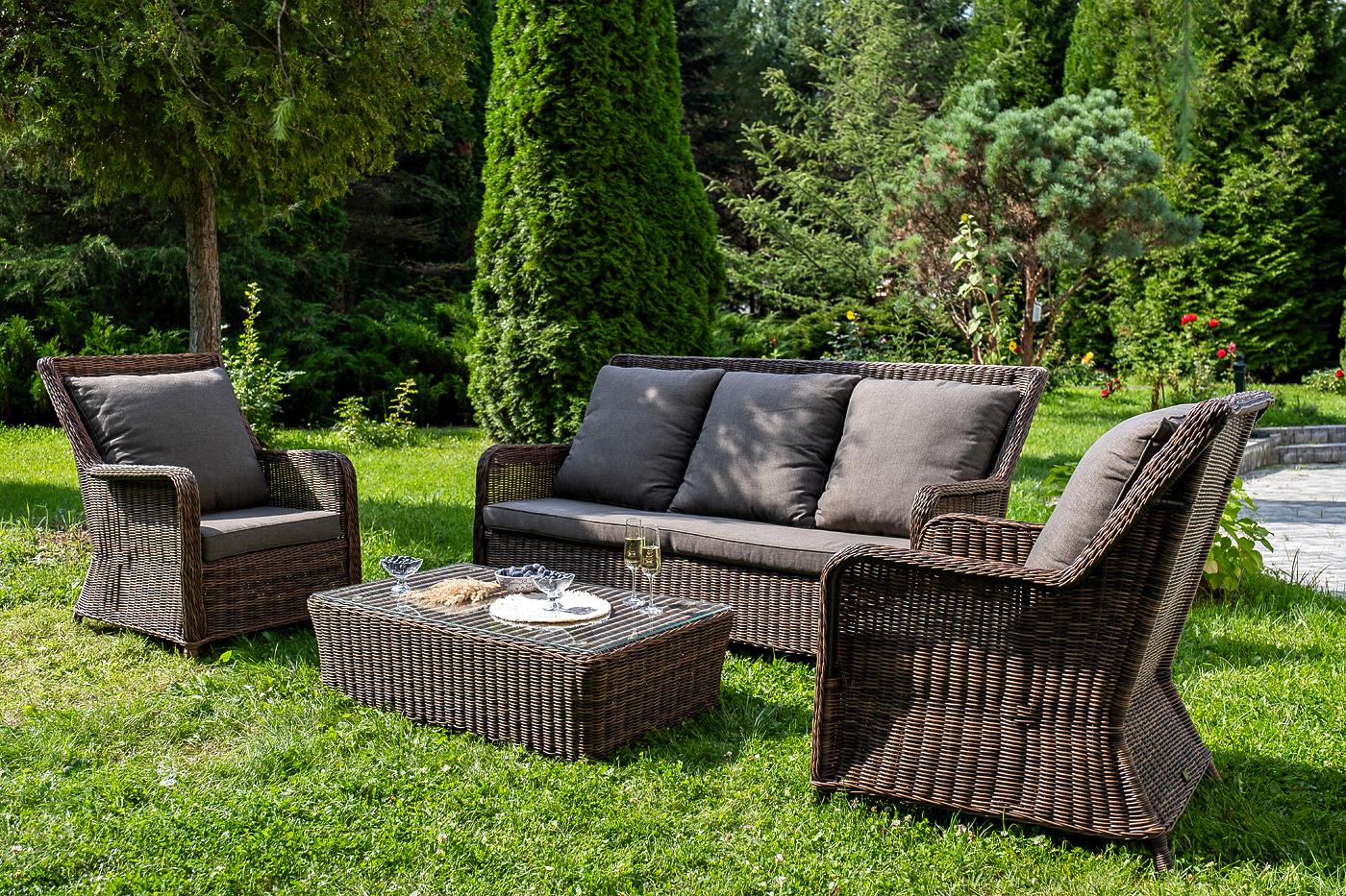 Вместительная лаунж-зона «Гляссе» состоит из: - трехместного дивана – 1900×880×990 мм. - двух кресел – 730×880×990 мм. - журнального столика – 1100×660×340 мм. Модели имеют алюминиевый каркас, который оплетен вручную искусственным ротангом натурального коричневого цвета. Плетеная мебель дополнена удобными подушками в серых чехлах. При их изготовлении используют полиэстер, плотность – 300гр/м2. Он обрабатывается влагоотталкивающей пропиткой для повышения защитных свойств материала. Журнальный "Гляссе" диван трехместный из искусственного ротанга, цвет коричневый 1шт. 1 900Х880Х990, "Гляссе" кресло плетеное из искусственого ротанга, цвет коричневый 2шт. 730Х880Х990, "Капучино" журнальный столик из искусственного ротанга, цвет коричневый 1шт. 1 100Х660Х340,