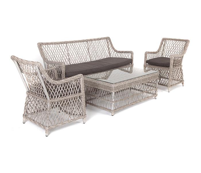 Лаунж-зона «Асти» подходит для размещения четырех персон. За прочность конструкции отвечает каркас из алюминия. В состав входят: – двухместный диван - 1600×660×850 мм. – кресло (2 шт.) - 550×660×850 мм. – журнальный столик - 1120×570×450 мм (толщина стеклянной столешницы в 0,5 см). Оплетка выполнена вручную искусственным ротангом бежевого цвета, диван и кресло укомплектованы подушками из 100% полиэстера, которые пропитаны специальным составом, обладающим влагоотталкивающим свойством. Параметры "Латте" диван двухместный из искусственного ротанга, цвет бежевый 1шт. 1 600Х660Х850, "Латте" плетеное кресло из искусственного ротанга, цвет бежевый 2шт. 550Х660Х850, "Гранд Латте" стол журнальный из искусственного ротанга, цвет бежевый 1шт. 1 120Х570Х450,