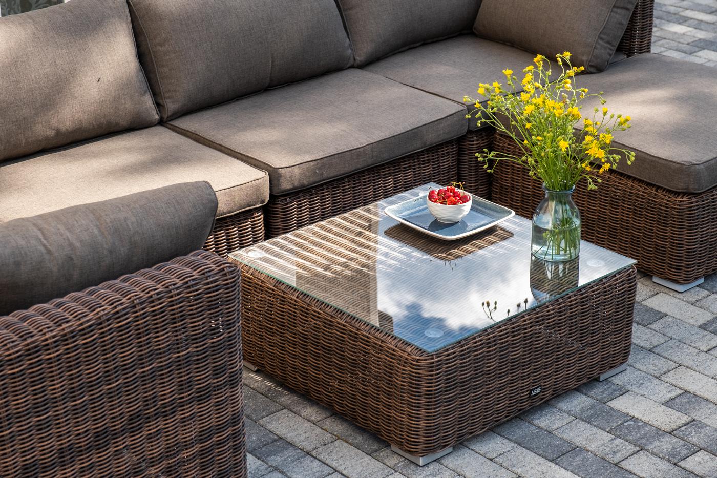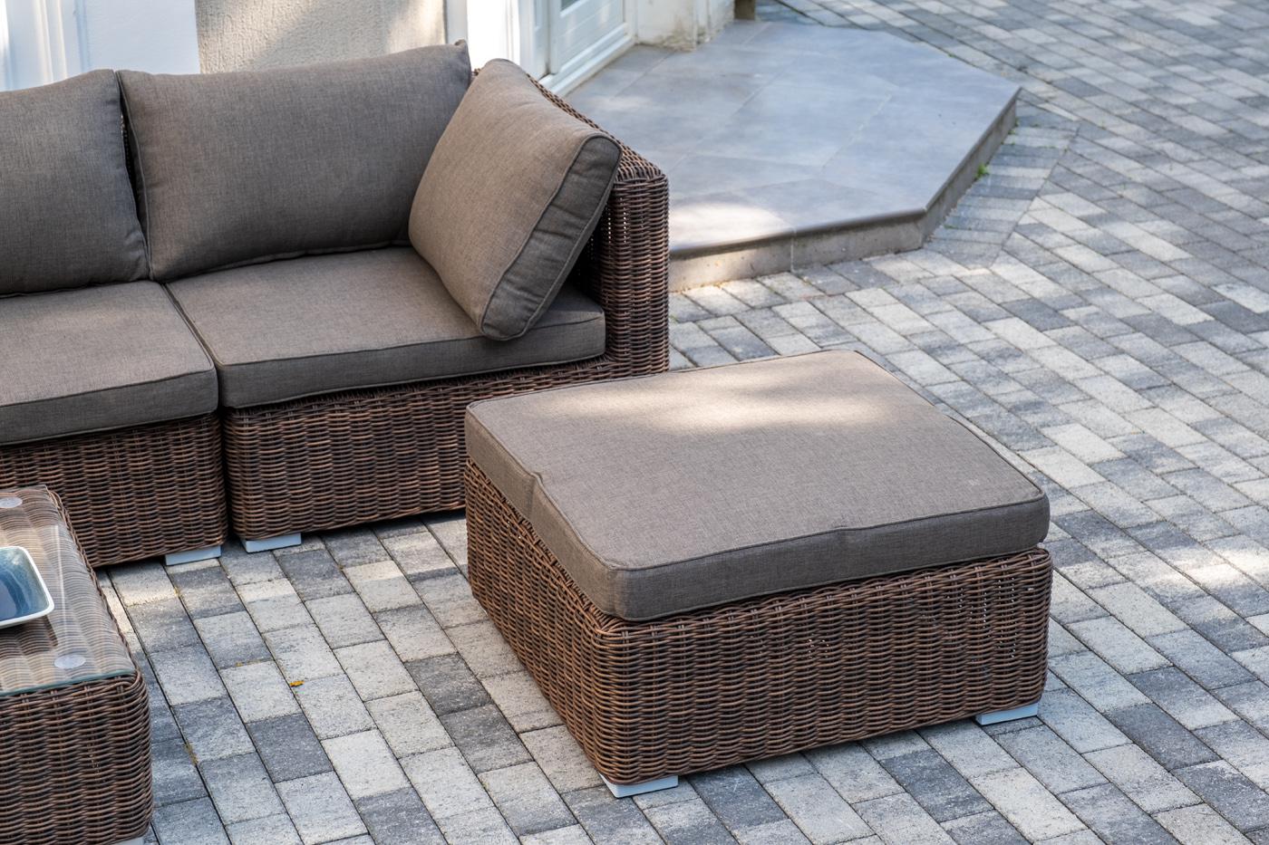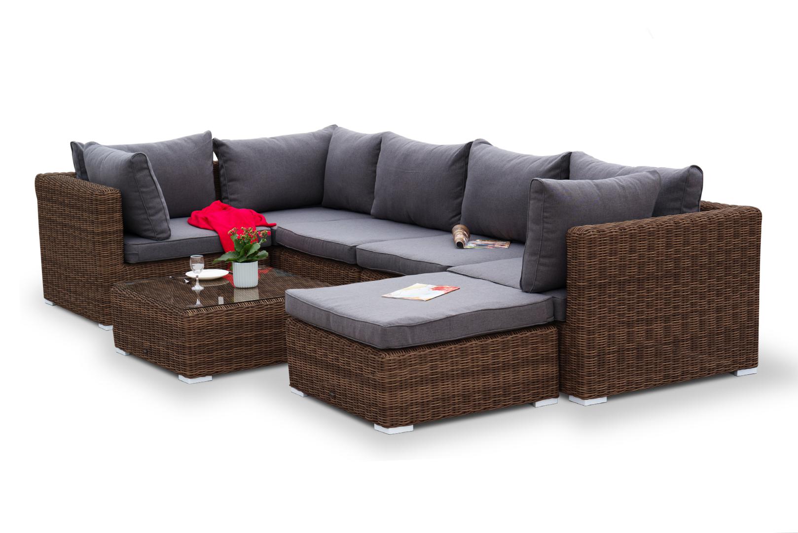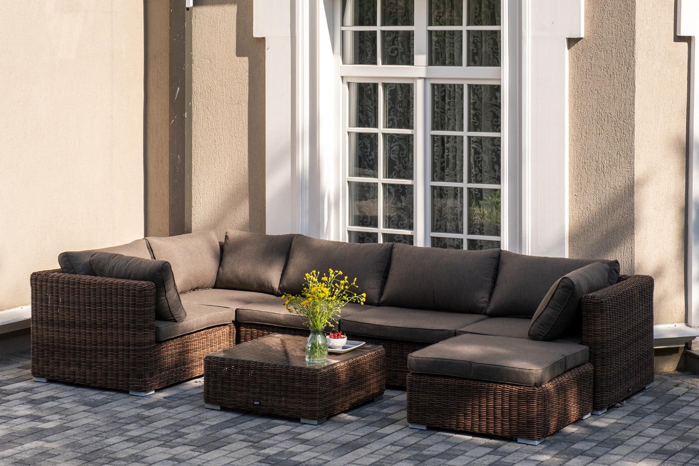 Составная и легко трансформирующаяся лаунж-зона «Лунго» гармонично дополнит зону отдыха на частной территории. Она состоит из целого набора мебели, в который входит: - журнальный столик – 740×740×300 мм. - три угловых модуля – 860×860×650 мм. - два прямых модуля – 740×860×650 мм. - квадратная оттоманка – 740×740×380 мм. При изготовлении каркаса всех составляющих комплекта используется высокопрочный алюминий. Он дополнен круглым плетением из искусственного ротанга. Цвет – коричневый. "Лунго" модуль диванный прямой с подушками, цвет коричневый 2шт. 740Х860Х650, "Лунго" модуль диванный угловой с подушками, цвет коричневый 3шт. 860Х860Х650, "Лунго" плетеная оттоманка с подушкой, цвет коричневый 1шт. 740Х740Х380, "Лунго" журнальный столик плетеный, цвет коричневый 1шт. 740Х740Х300,
