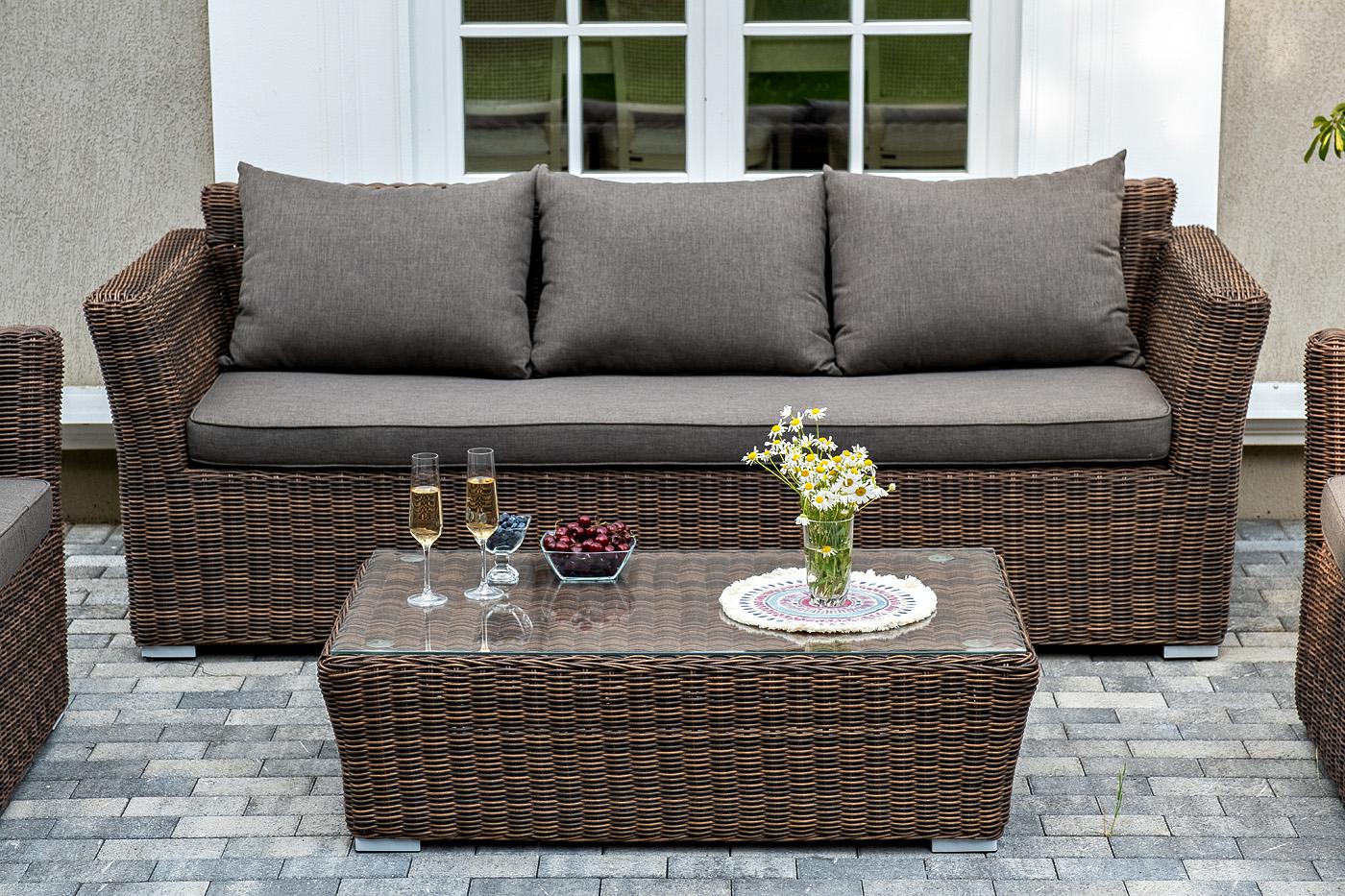 Лаунж-зона «Капучино» – практичная мебель для обустройства открытой веранды или беседки. В ее составе находятся: - два кресла – 1040×865×815 мм. - трехместный диван – 2220×865×815 мм. - журнальный столик – 1100×660×340 мм. В качестве основы применяется алюминиевый каркас. Из круглого искусственного ротанга сделана ручная оплетка. Цвет комплекта – коричневый. На креслах и диване расположились мягкие подушки, съёмные чехлы которых пошиты из полиэстера, плотностью 300гр/м2. Ткань в обяз "Капучино" кресло из искусственного ротанга, цвет коричневый 2шт. 1 040Х865Х815, "Капучино" журнальный столик из искусственного ротанга, цвет коричневый 1шт. 1 100Х660Х340, "Капучино" диван из искусственного ротанга трехместный, цвет коричневый 1шт. 2 220Х865Х815,