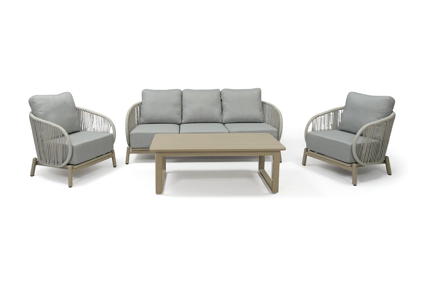 Лаунж-зона «Прато» компактный комплект, рассчитанный на 4 персоны. В ее состав входят: - двухместный диван – 1915×805×700 мм. - два плетеных кресла – 805×805×700 мм. - журнальный столик – 1400×650×400 мм. В основе мебели - алюминиевый каркас и круглый роуп. Каркас оплетен с помощью ручного метода и представлен в светло-сером цвете. Диван и кресла укомплектованы подушками со съёмными чехлами из полиэстера, плотностью 230гр/м2. Журнальный столик выполнен из прочного алюминия в стильном цвете "Прато" кресло плетеное из роупа, цвет светло-серый, каркас под дерево (холодно-бежевый) 2шт. 805Х805Х700, "Прато" журнальный столик из алюминия 1шт. 1 400Х650Х400, "Прато" диван 3-местный плетеный из роупа, цвет светло-серый, каркас под дерево (холодно-бежевый) 1шт. 1 915Х805Х700,