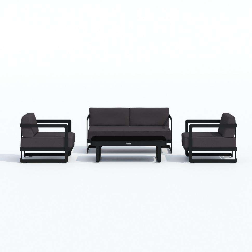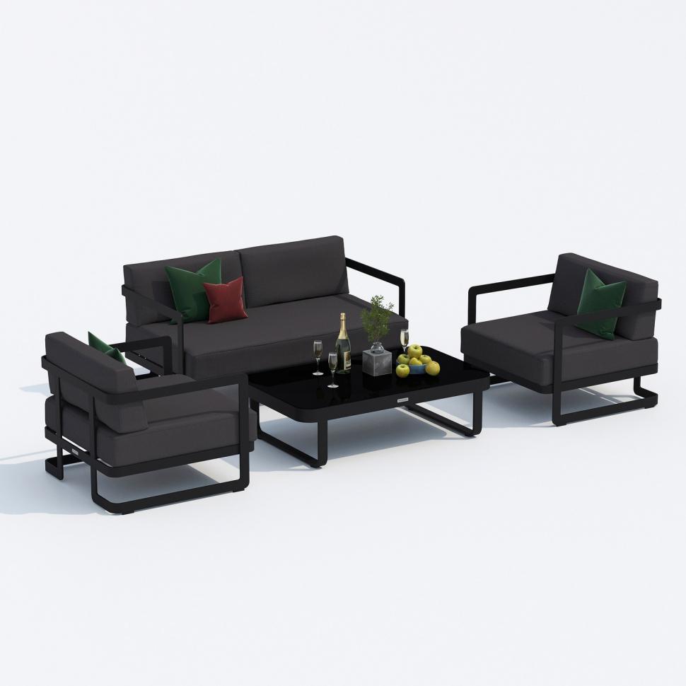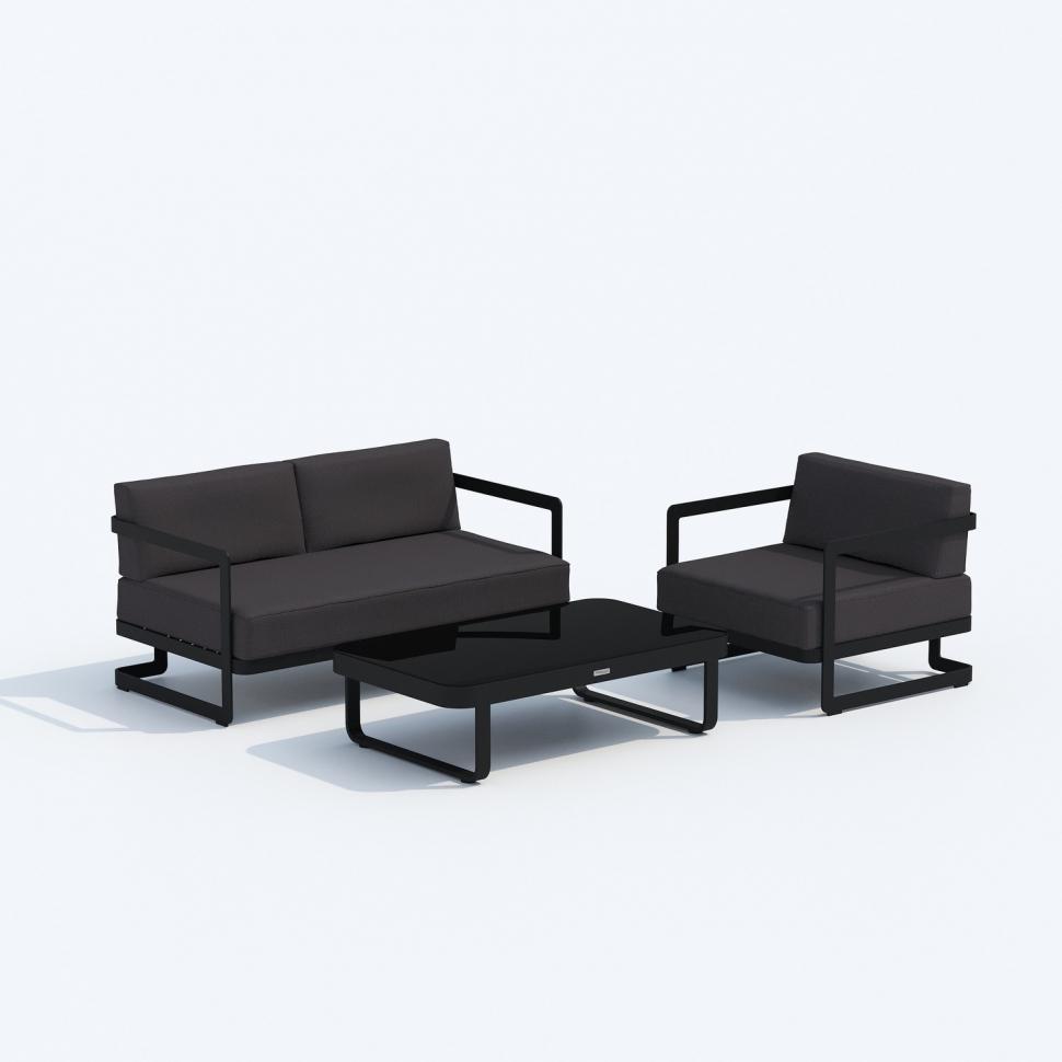 Материалы: всесезонный алюминий, ткань для улицы, закаленное стекло Цвет: каркас карбон (темно-серый) / подушки антрацит (серый) / черное глянцевое стекло диван двухместный 142 * 80 * 73 см 24 кг 1 шт кресло 80 * 80 * 73 см 15,5 кг 2 шт кофейный столик 125 * 75 * 35 см 19 кг 1 шт