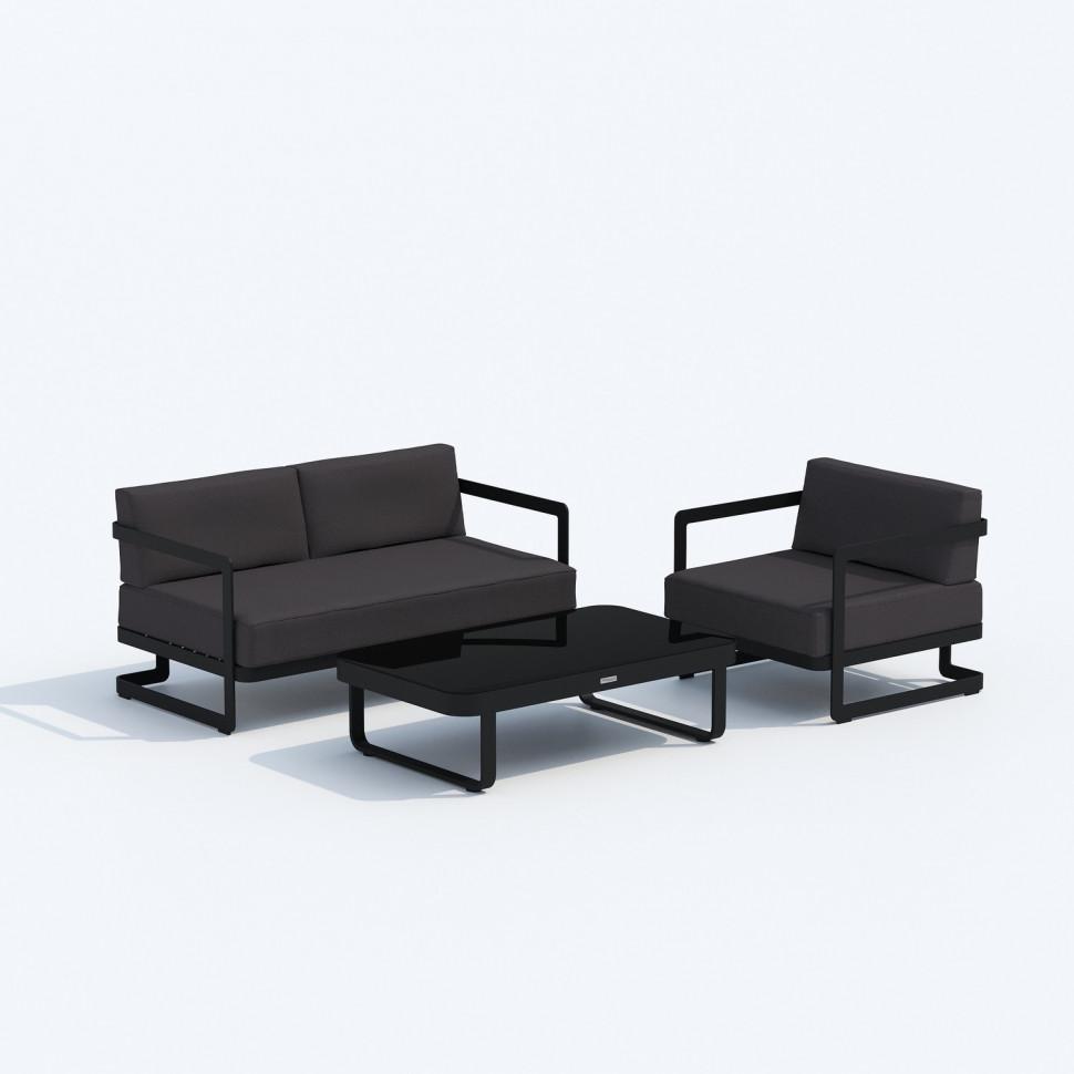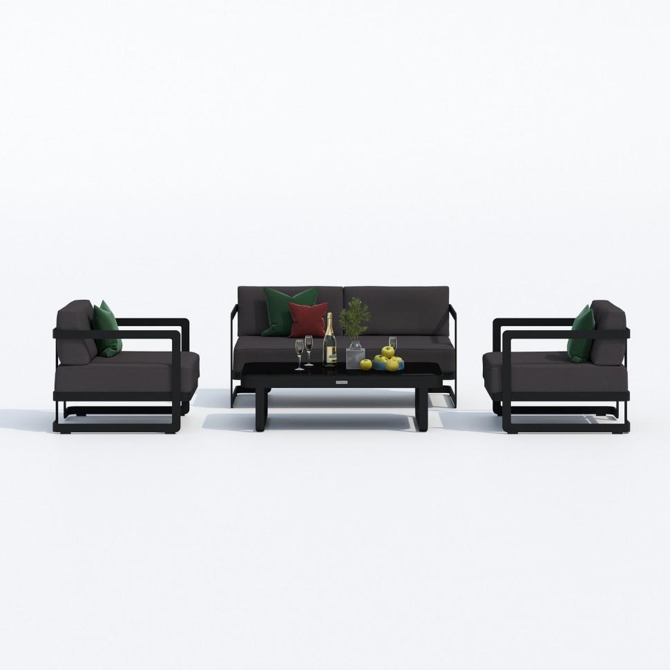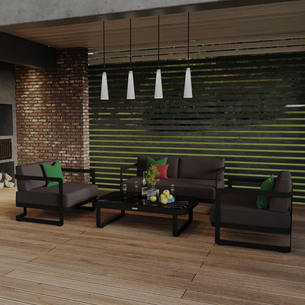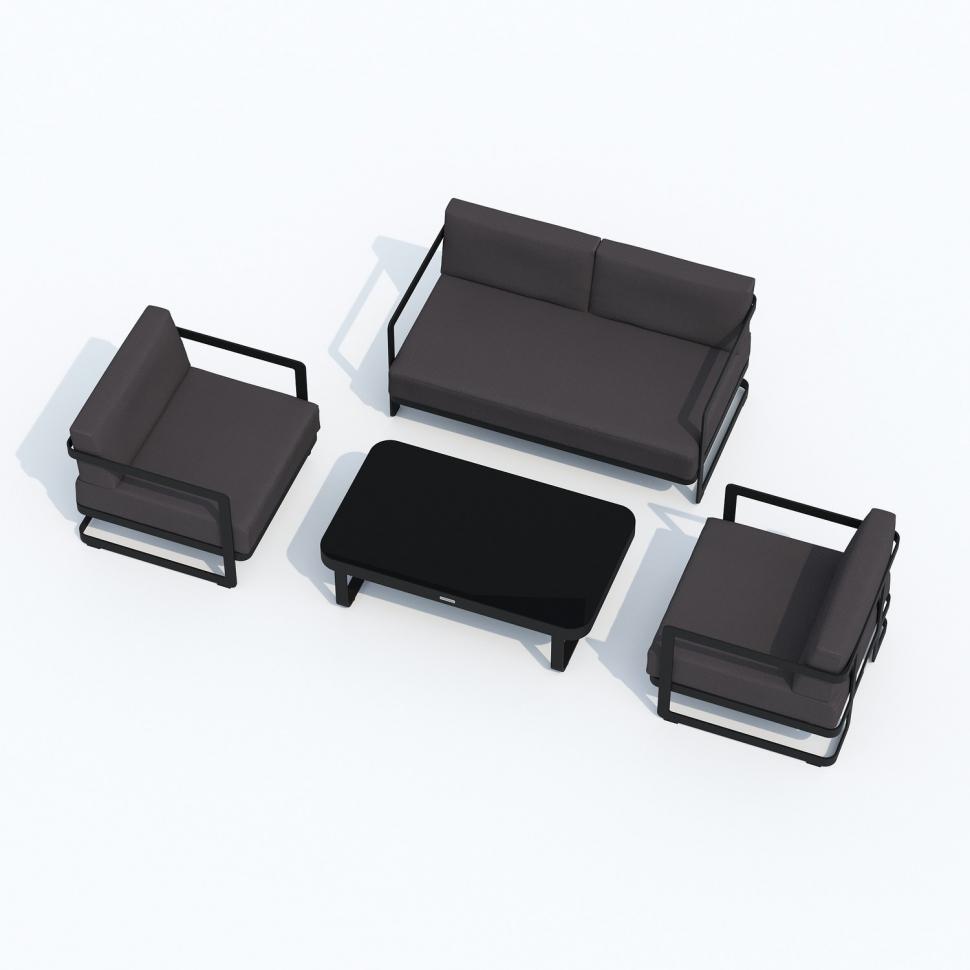 Материалы: всесезонный алюминий, ткань для улицы, закаленное стекло Цвет: каркас карбон (темно-серый) / подушки антрацит (серый) / черное глянцевое стекло диван двухместный 142 * 80 * 73 см 24 кг 1 шт кресло 80 * 80 * 73 см 15,5 кг 2 шт кофейный столик 125 * 75 * 35 см 19 кг 1 шт