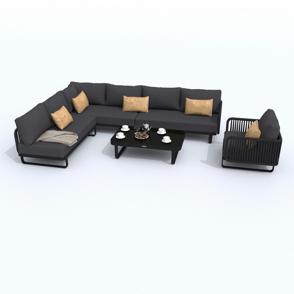 Материалы: всесезонный алюминий, ткань для улицы, закаленное стекло, веревочное плетение (РОУП) Цвет: каркас карбон (темно-серый) / подушки антрацит (серый) / черное глянцевое стекло диван правый 140 * 80 * 68 см 25 кг 1 шт диван левый 140 * 80 * 68 см 25 кг 1 шт диван центральный 140 * 80 * 68 см 23 кг 1 шт кресло 80 * 80 * 68 см 17 кг 1 шт кофейный столик 125 * 75 * 35 см 19 кг 1 шт