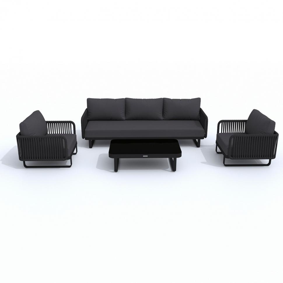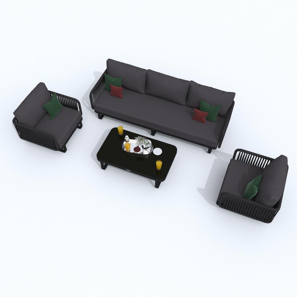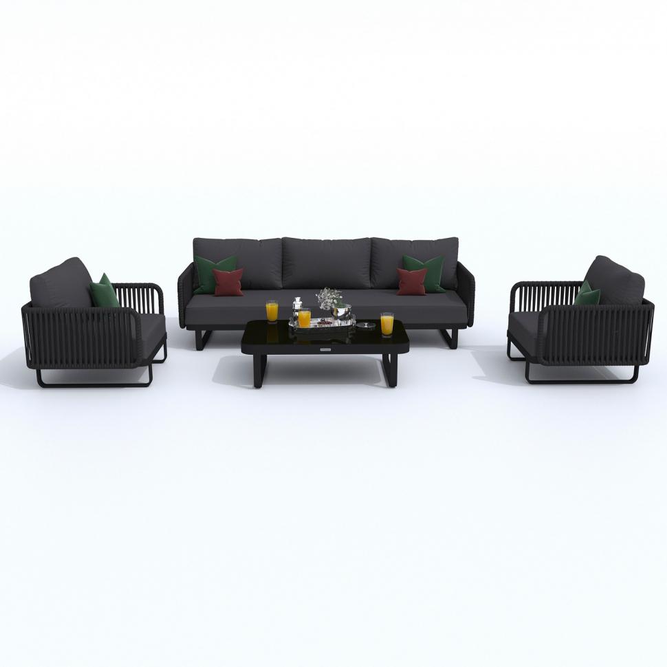 Материал: всесезонный алюминий с порошковым напылением, ткань для улицы, закаленное стекло, веревочное плетение Цвет: каркас карбон (темно-серый) / подушки антрацит (серый) / черное глянцевое стекло диван трехместный 214 * 80 * 68 см 39 кг 1 шт кресло 80 * 80 * 68 см 18 кг 2 шт кофейный столик 125 * 75 * 35 см 19,5 кг 1 шт