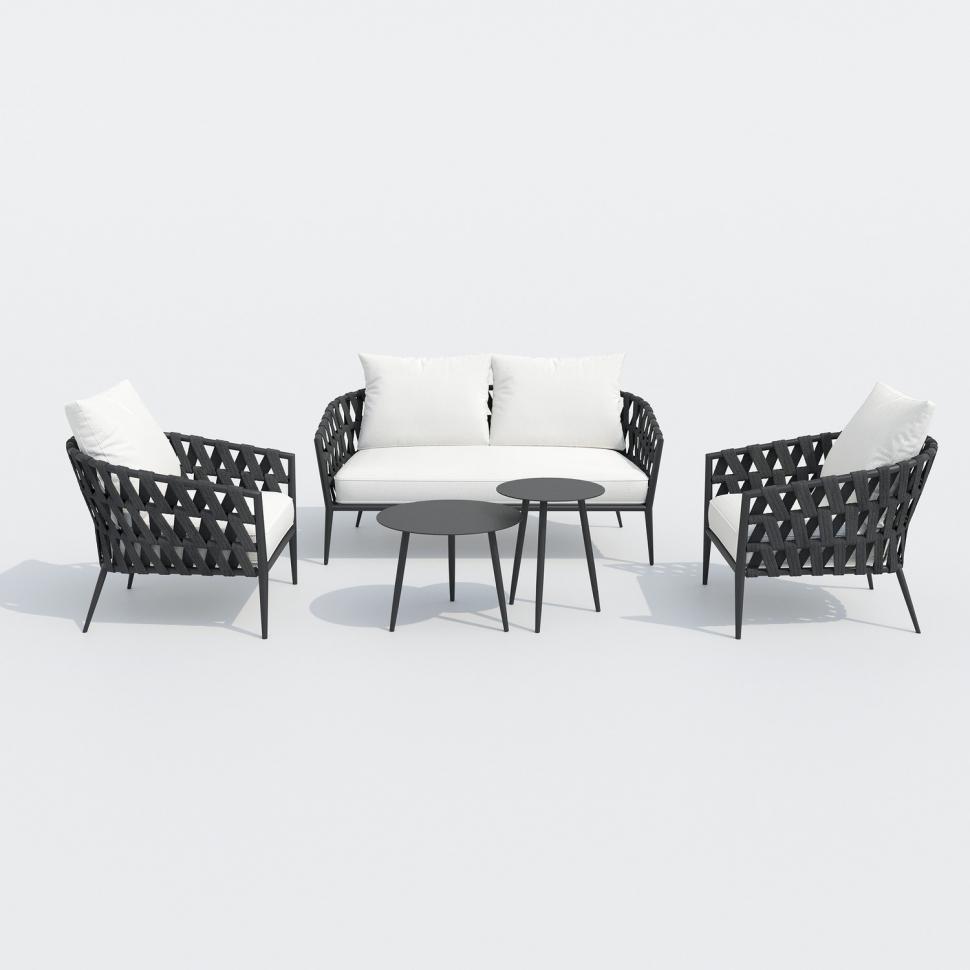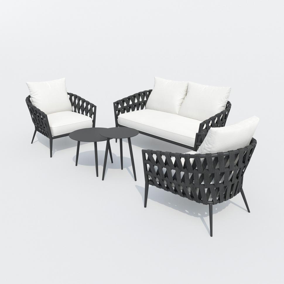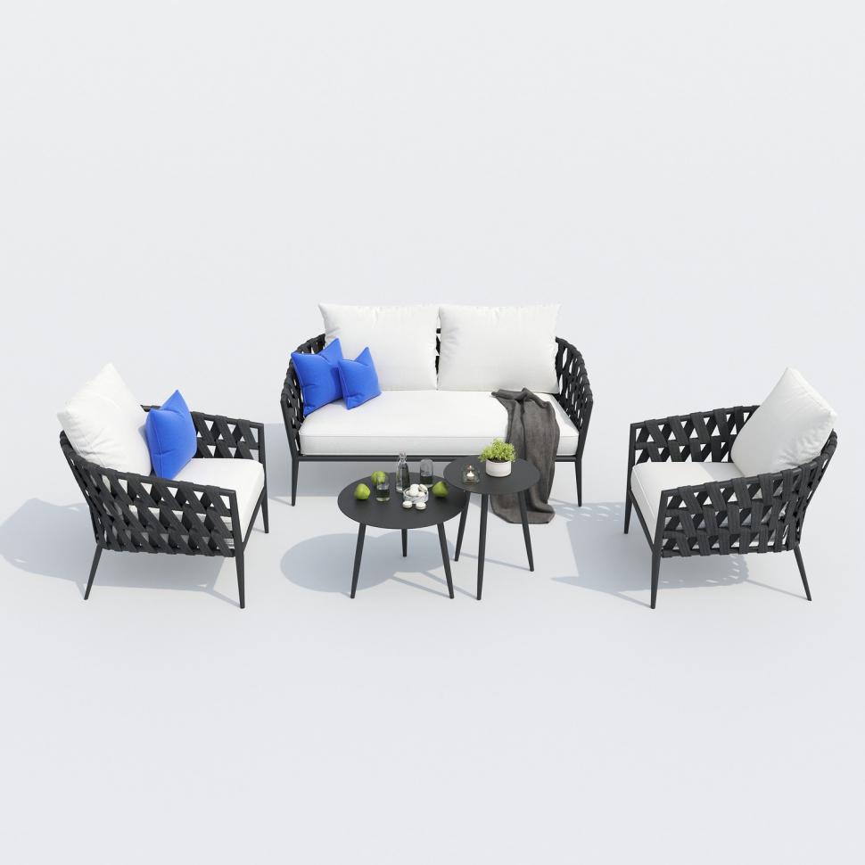 Материалы: всесезонный алюминий, ткань для улицы, веревочное плетение Цвет: каркас карбон (темно-серый) / подушки белые / столешница карбон (темно-серый) алюминий диван двухместный 160 * 85 * 75 см 20 кг 1 шт кресло 78 * 85 * 75 см 10 кг 2 шт столик журнальный 60 * 45 см 5 кг 1 шт столик кофейный 45 * 55 см 3,5 кг 1 шт
