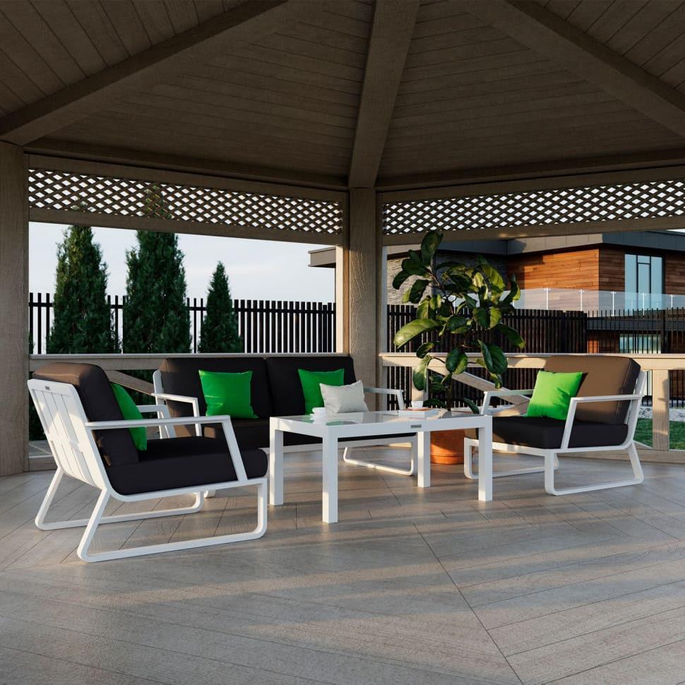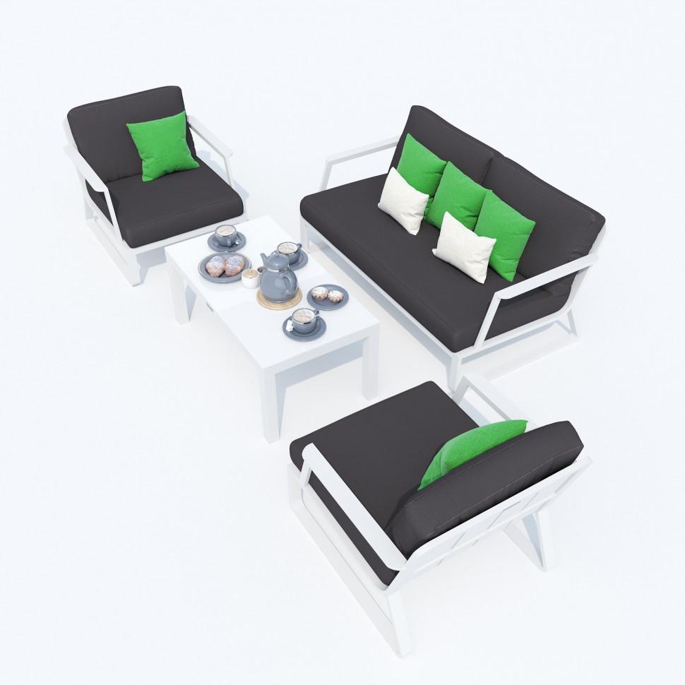 Материалы: всесезонный алюминий с порошковым напылением, специальная ткань для улицы, закаленное стекло Цвет: каркас белый / подушки антрацит / столешница белая глянцевая Комплектация и габариты: диван двухместный 138 * 78 * 79 вес 27 кг 1 шт кресло 72 * 78 * 79 вес 16 кг 2 шт кофейный столик 100 * 55 * 43 вес 14 кг 1 шт Мягкий сет состоит из большого дивана, уютных кресел и кофейного столика со столешницей из белого закаленного стекла. Минималистичный дизайн и сдержанные оттенки, которые можно разбавить яркими деталями в виде небольших подушек или пледа. Чехлы цвета антрацит идеально сочетаются с белым каркасом. Они не выгорят на солнце и выдержат любые капризы погоды. Кроме того, их легко снять и почистить, если на них есть видимые загрязнения. ЭСТИВО - садовая мебель, которая точно удивит и доставит максимум комфорта. Здесь можно по-настоящему расслабиться после рабочего дня, отвлечься от проблем и провести время с удовольствием. Всё благодаря первоклассным материалам и качественной сборке. Всесезонный алюминий невосприимчив к повышенной влажности и регулярным осадкам, поэтому можно не беспокоиться, что каркас покроется ржавчиной. Создать уютное пространство для отдыха в кругу семьи и друзей легко!