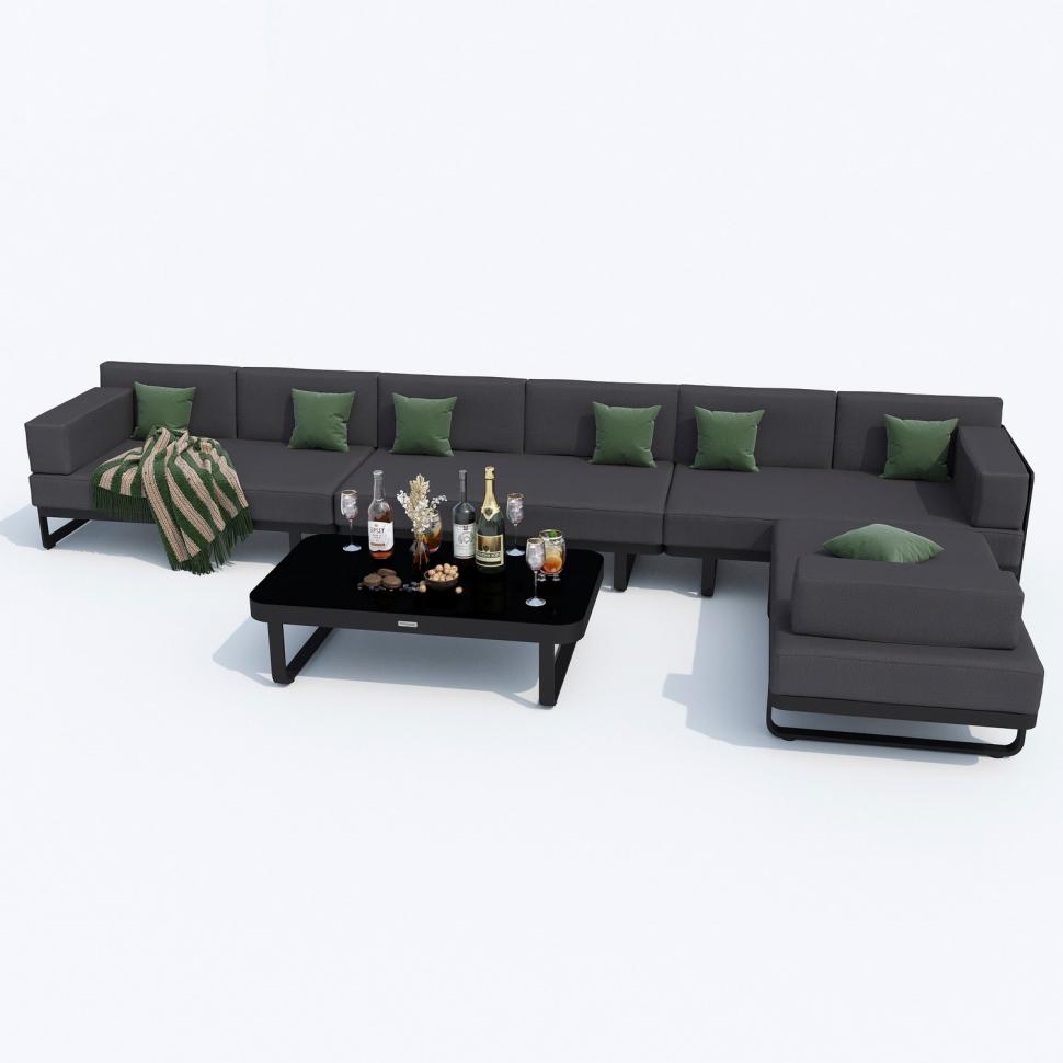 Материалы: всесезонный алюминий с порошковым напылением, специальная ткань для улицы, закаленное стекло Цвет: каркас темно-серый карбон / подушки антрацит / столешница черная глянцевая Комплектация и габариты: диван правый 140 * 80 * 73 вес 20 кг 1 шт диван левый 140 * 80 * 73 вес 20 кг 1 шт диван центральный 140 * 80 * 73 вес 18 кг 1 шт пуф для ног 125 * 75 * 42 вес 13 кг 1 шт кофейный столик 125 * 75 * 35 вес 19 кг 1 шт Лаунж зона состоит из трех больших и уютных диванов, а также огромного пуфа, которые по желанию можно расположить в различных комбинациях, например в форме буквы Г и по прямой линии. Лаунж зона также включает кофейный столик со столешницей из черного глянцевого стекла. Минимализм и сдержанная цветовая гамма впишутся любой стиль интерьера и будут дополнять композицию. Чехлы мебели цвета антрацит идеально сочетаются с темно-серым каркасом, подчеркивая строгий и лаконичный дизайн. Они не выгорят на солнце и выдержат любые капризы погоды. Их легко снять и почистить, если на них есть видимые загрязнения. ТЕСОРА - садовая мебель премиум класса, созданная удивлять. Ощутите максимальный уровень комфорта, уютно расположившись на мягких сиденьях с удобными подлокотниками. Лаунж зона идеально впишется в ландшафт и позволит вам побыть наедине с природой. Каркас конструкции изготовлен из всесезонного алюминия. Он не боится капризов погоды и отличается высокими антикоррозийными свойствами, поэтому можно не бояться внезапного дождя или сильного ветра. Проведите время с семьей и близкими для вас людьми с максимальным комфортом.