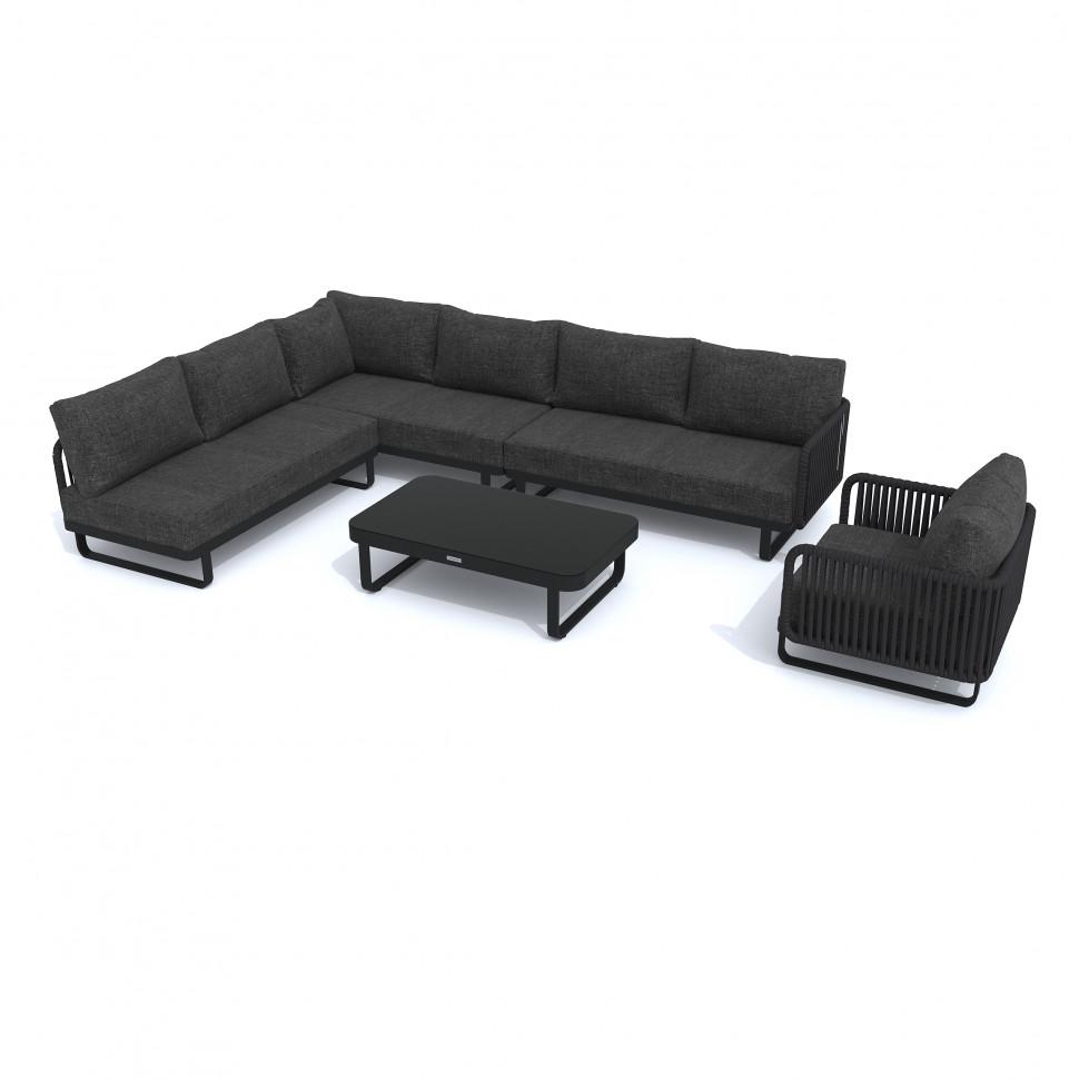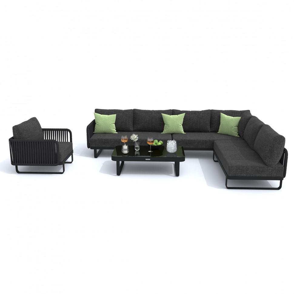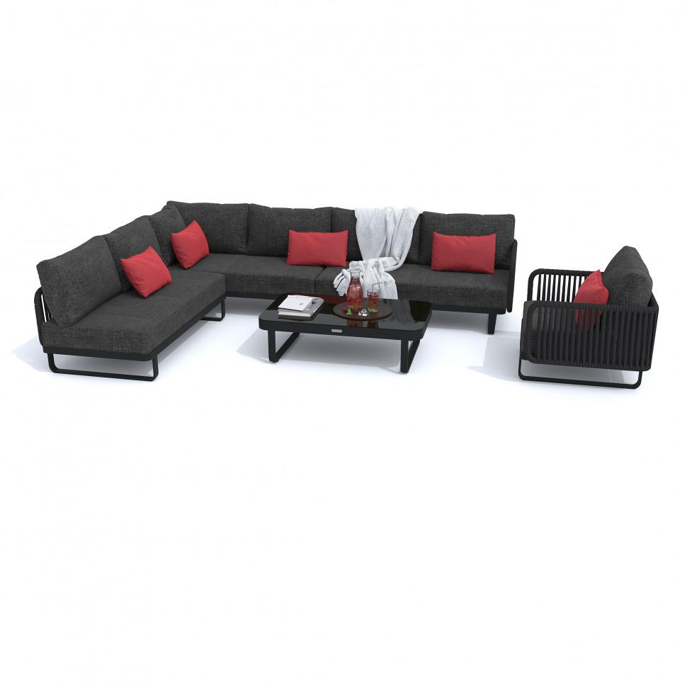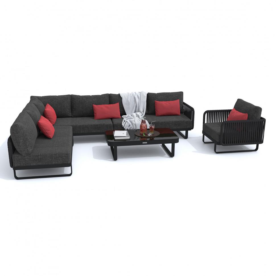 Материалы: всесезонный алюминий, ткань для улицы, закаленное стекло, веревочное плетение (РОУП) Цвет: каркас карбон (темно-серый) / подушки маренго (серый) / черное глянцевое стекло диван правый 140 * 80 * 68 см 25 кг 1 шт диван левый 140 * 80 * 68 см 25 кг 1 шт диван центральный 140 * 80 * 68 см 23 кг 1 шт кресло 80 * 80 * 68 см 17 кг 1 шт кофейный столик 125 * 75 * 35 см 19 кг 1 шт
