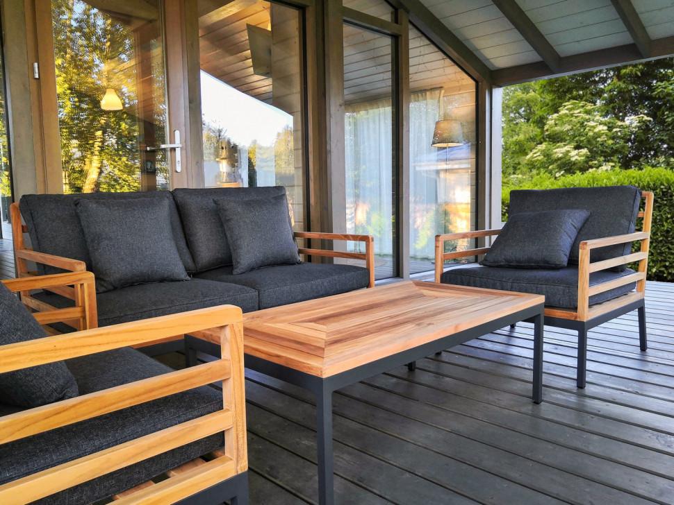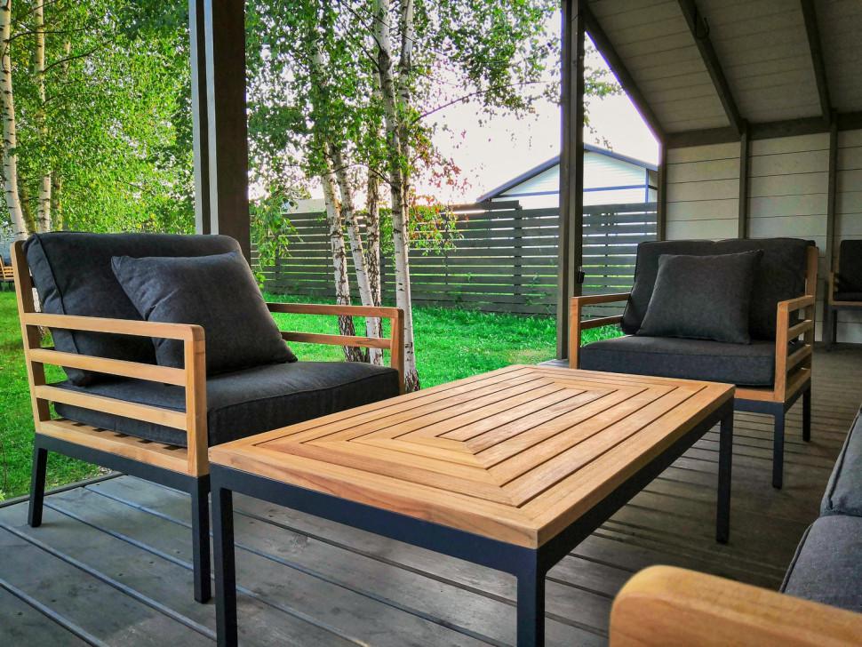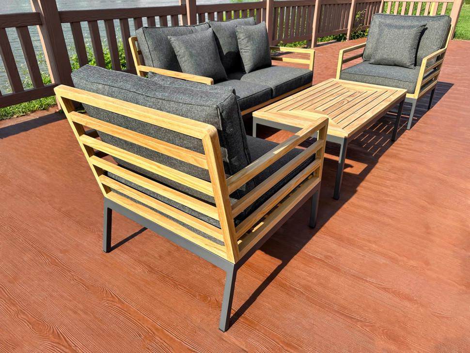 диван двухместный 138 * 80 * 77 см 27 кг 1 шт кресло 71 * 80 * 77 см 15 кг 2 шт кофейный столик 110 * 60 * 40 см 11 кг 1 шт В коллекции гармонично сочетается натуральный цвет тикового дерева и строгие формы подножья из алюминия, окрашенного порошковой краской в благородный серый цвет. Мебель соединяет в себе черты модерна с нотками кантри. Простые и четкие линии мебели создают легкий и в тоже время выразительный образ. Данная лаунж зона состоит из двухместного дивана, двух кресел и журнального столика. Мебель оснащена подушками из премиальной водоотталкивающей ткани серого цвета, который выгодно подчеркивает красоту тикового дерева, чехлы съемные. Ткань, кроме того, что обладает водоотталкивающим эффектом, устойчива к ультрафиолету, т.к. содержит акрил, что дает ей защиту от выгорания при прямом попадании солнечных лучей. В комплекте идут декоративные подушки под спину в цвете основных подушек.