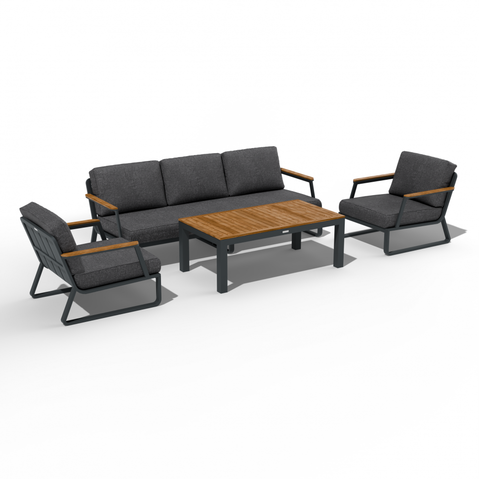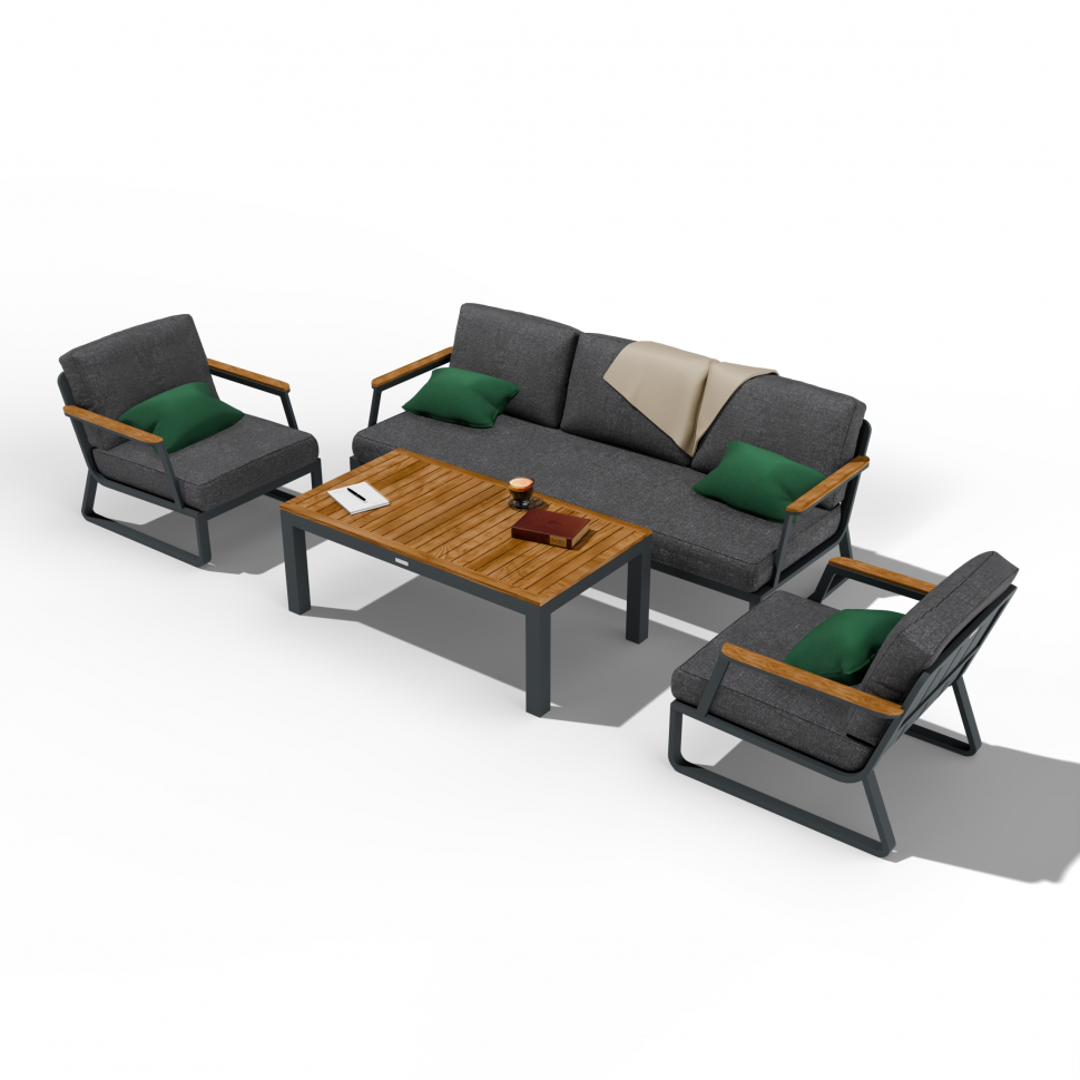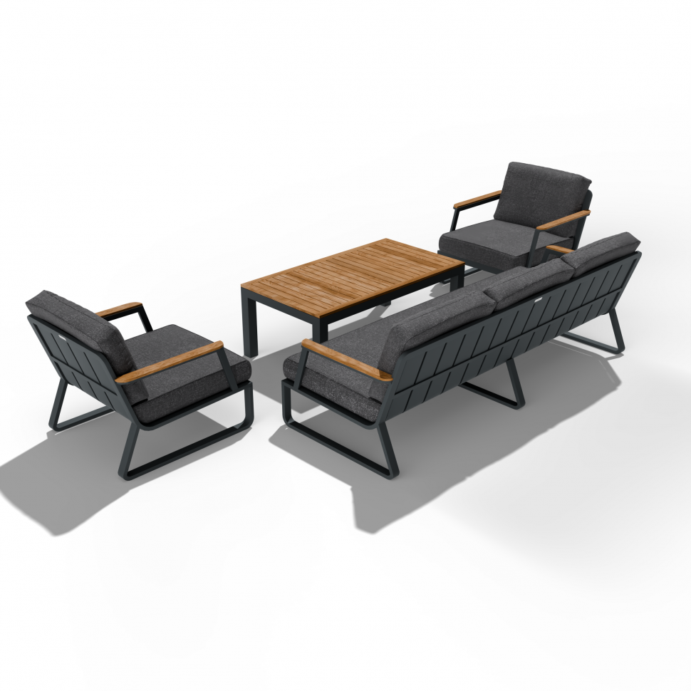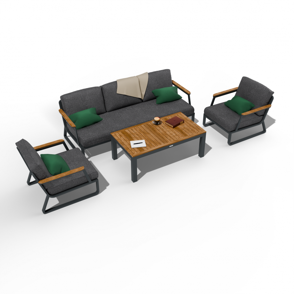 Материалы: всесезонный алюминий, премиальная ткань для улицы, натуральное дерево тик Цвет: каркас карбон (темно-серый) / подушки маренго (серый) / столешница из тика / подлокотники из тика диван трехместный 204 * 78 * 79 см 39 кг 1 шт кресло 72 * 78 * 79 см 16 кг 2 шт кофейный столик 125 * 65 * 43 см 14 кг 1 шт