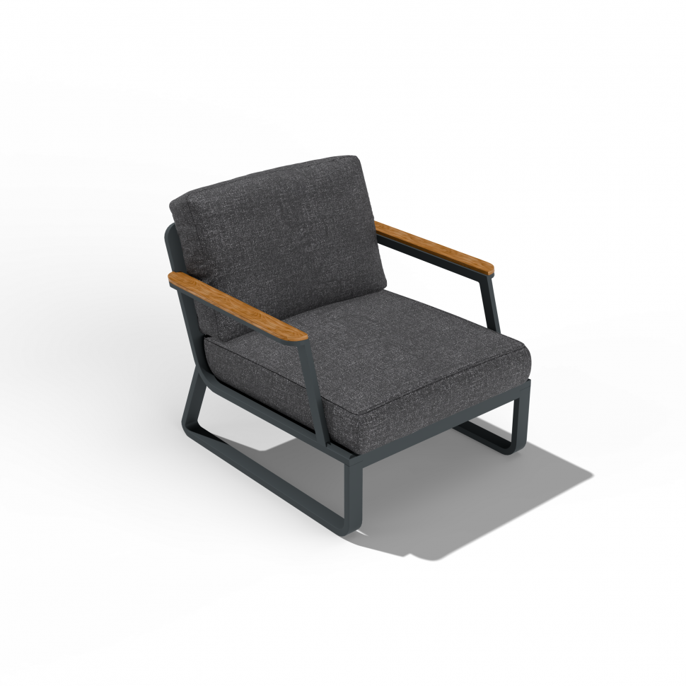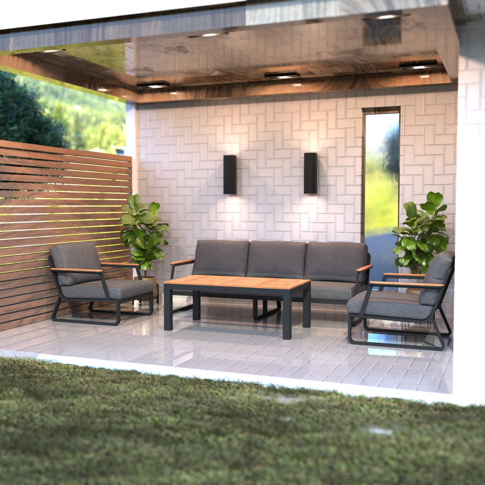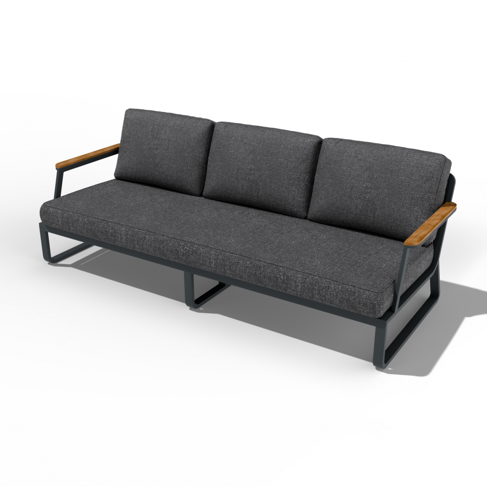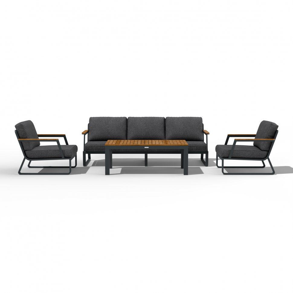 Материалы: всесезонный алюминий, премиальная ткань для улицы, натуральное дерево тик Цвет: каркас карбон (темно-серый) / подушки маренго (серый) / столешница из тика / подлокотники из тика диван трехместный 204 * 78 * 79 см 39 кг 1 шт кресло 72 * 78 * 79 см 16 кг 2 шт кофейный столик 125 * 65 * 43 см 14 кг 1 шт