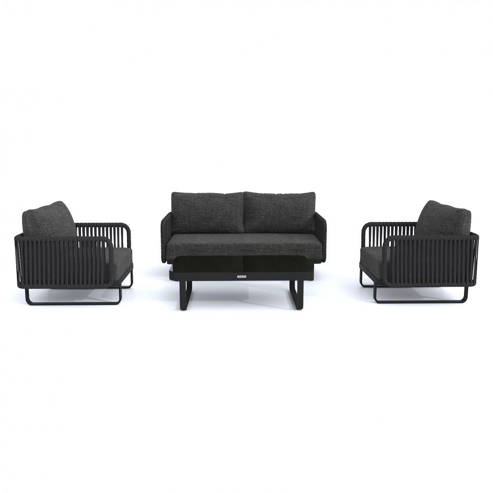 Материал: всесезонный алюминий с порошковым напылением, премиальная ткань для улицы, закаленное стекло, веревочное плетение Цвет: каркас карбон (темно-серый) / подушки маренго (серый) / черное глянцевое стекло диван двухместный 140 * 80 * 68 см 22 кг 1 шт кресло 80 * 80 * 68 см 13.5 кг 2 шт кофейный столик 125 * 75 * 35 см 19 кг 1 шт