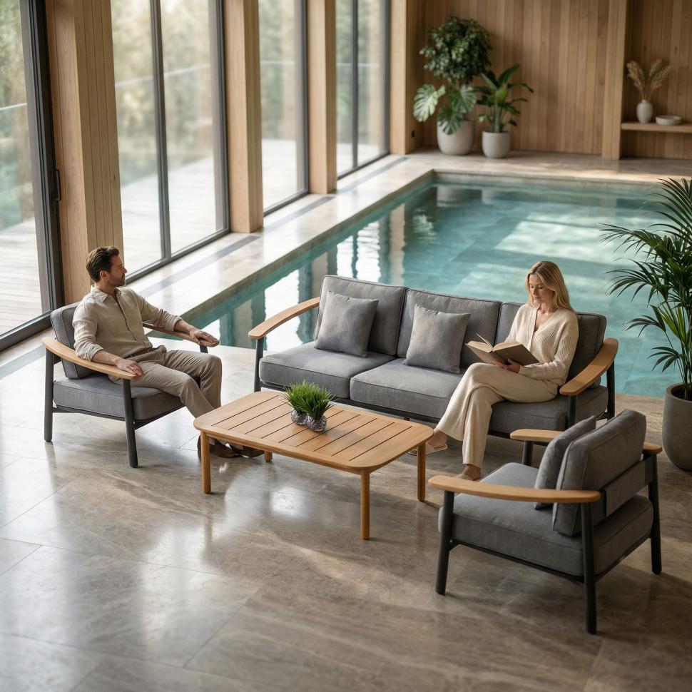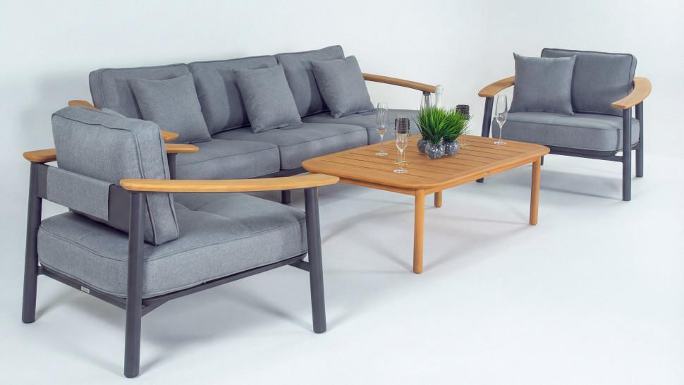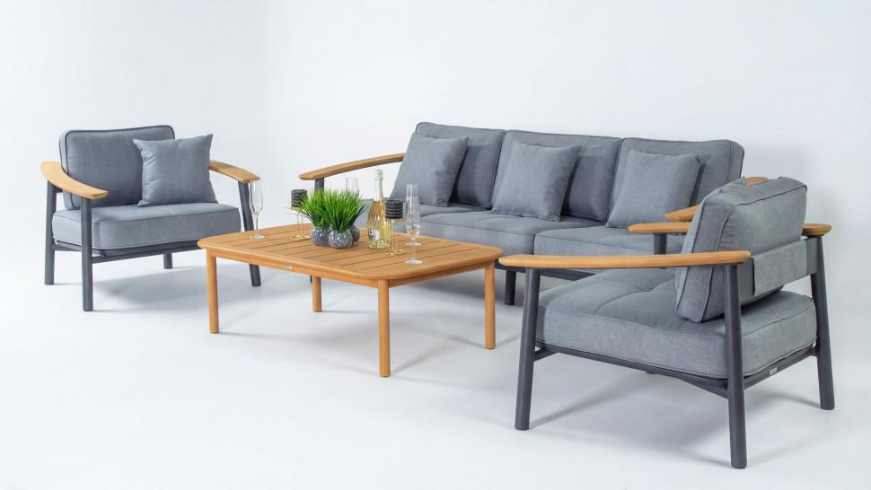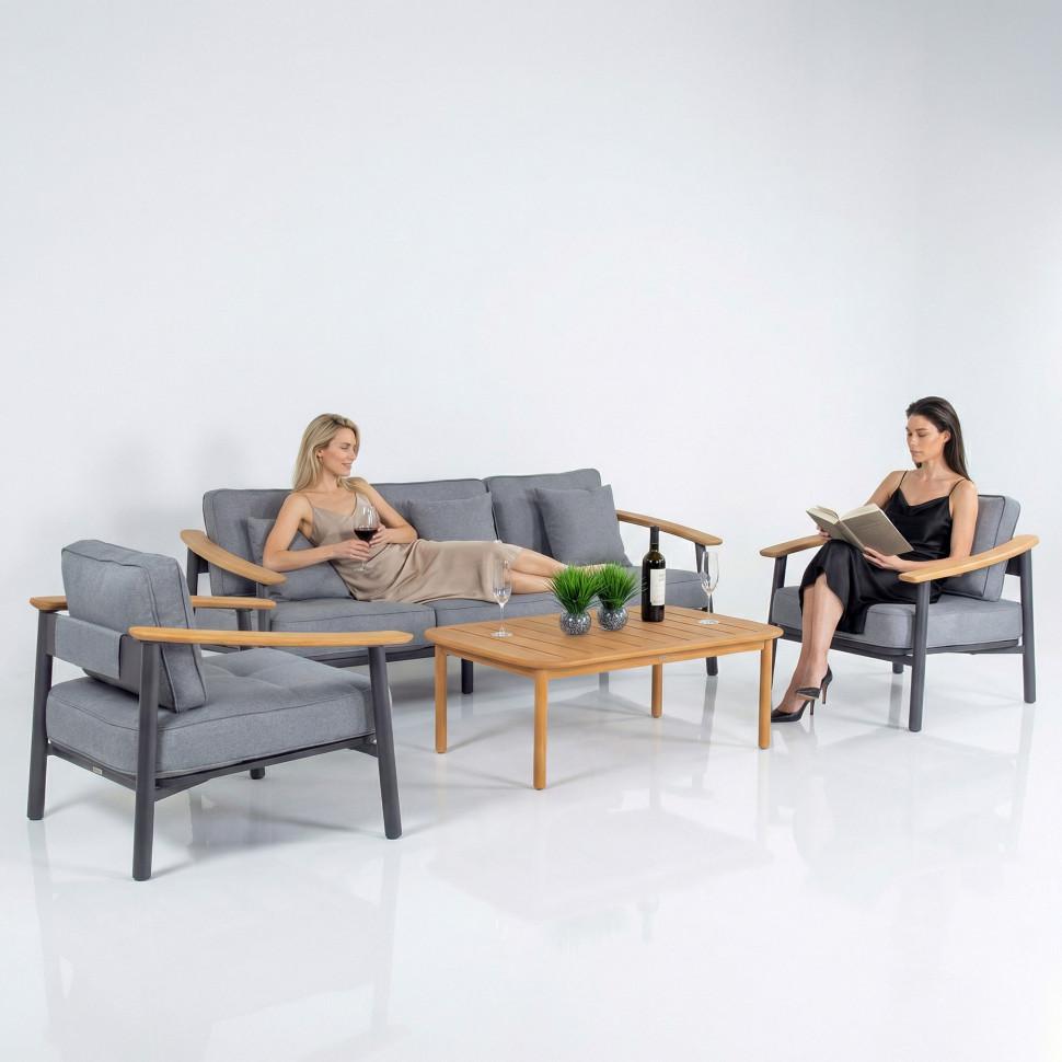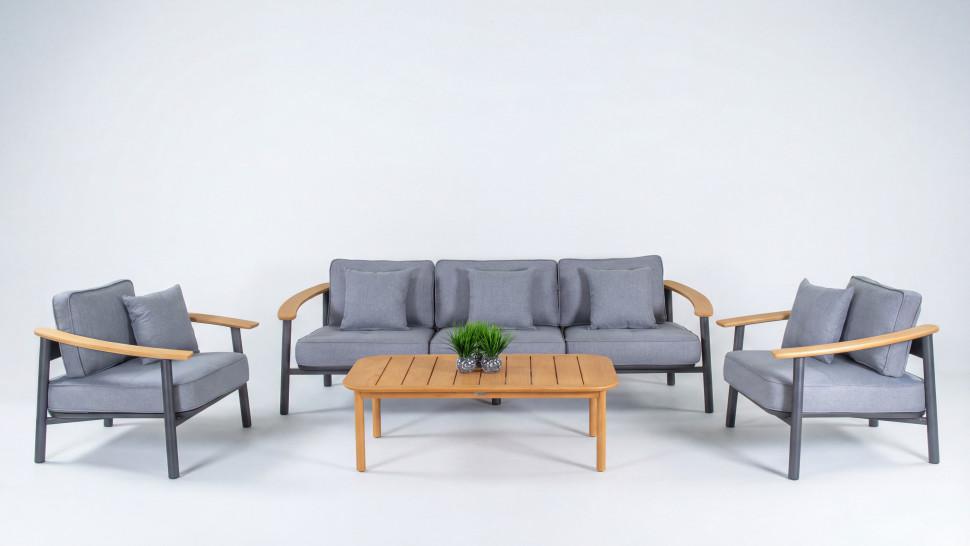 Материалы: всесезонный алюминий с порошковым напылением, премиальная уличная ткань, тик Цвет: каркас темно-серый карбон / подушки светло-серые / столешница натуральный тик Комплектация и габариты: диван трехместный 236 * 86 * 62 (см) вес 46 кг 1 шт кресло 95 * 86 * 62 (см) вес 21 кг 2 шт кофейный столик 125 * 75 * 40 (см) вес 19 кг 1 шт Мягкий трёхместный диван, большие кресла и журнальный (кофейный) столик из натурального тика - создать поистине уютное пространство для отдыха легко. Минимализм и сдержанная цветовая гамма, которую можно дополнить яркими акцентами в виде различных предметов декора. Чехлы светло-серого цвета идеально сочетаются с темно-серым каркасом. Они не выгорят на солнце и выдержат любые капризы погоды. Благодаря вшитой молнии их легко снять и почистить, если на них есть видимые загрязнения. ДЕСКАНТО - садовая мебель, способная приятно удивить и доставить максимум комфорта. Отдохнуть от городской суеты и побыть наедине с собой и своими мыслями. С лаунж зоной премиум класса можно провести время исключительно с удовольствием. Всё благодаря высококачественным материалам и качественной заводской сборке. Всесезонный алюминий обладает антикоррозийными свойствами - он невосприимчив к повышенной влажности и регулярным осадкам. Создайте идеальную зону релакса, не выходя за пределы загородного участка!