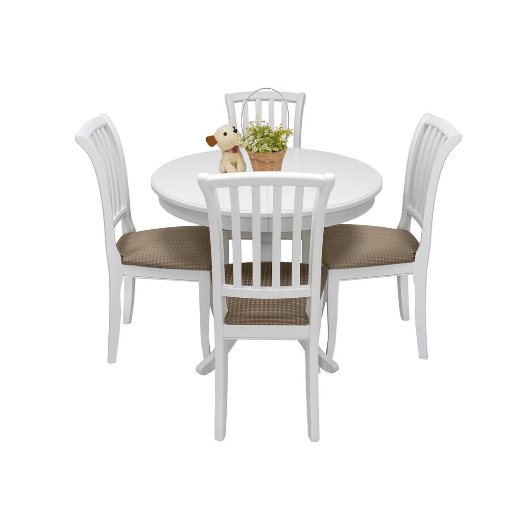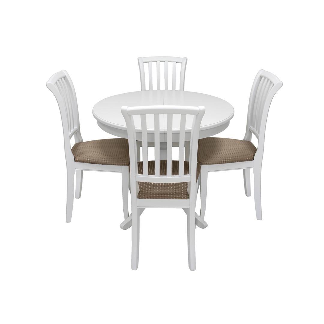 Набор для кухни исполнен в классическом стиле. Устойчивая центральная ножка стола делает силуэт изделия особенно изящным. Столешница выполнена из материала МДФ и покрытая эмалью и матовым лаком. Центральная вставка - бабочка хранится внутри стола. Стулья с классическими линиями, мягким сиденьем и прочной, удобной спинкой. Каркас из массива бука — прочный и экологичный материал.
