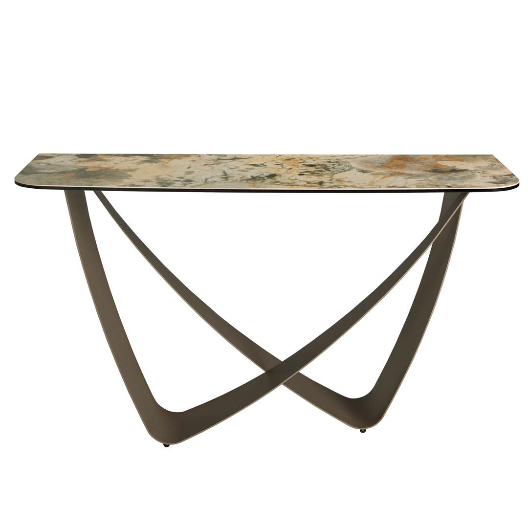 Прямоугольная консоль с современным дизайном и столешницей из фарфорового мрамора в земляных и серых тонах с матовой отделкой и оригинальными ножками из нержавеющей стали, окрашенными в серо-коричневый металлик. Изделие с простым, но оригинальным дизайном, которое добавит уникальности и индивидуальности.