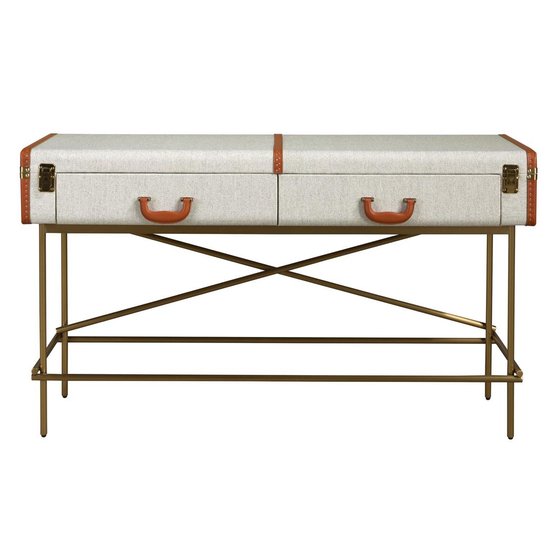 Прямоугольный консольный столик современного дизайна из натурального орехового шпона в сочетании с элегантной светло-серой тканевой обивкой . Его конструкция из полированных ножек из нержавеющей стали золотистого цвета привносит нотку современности и авангарда, которую вы ищете для своего дома. Его оригинальные детали из коровьей кожи добавят идеальный штрих стиля в вашу гостиную.